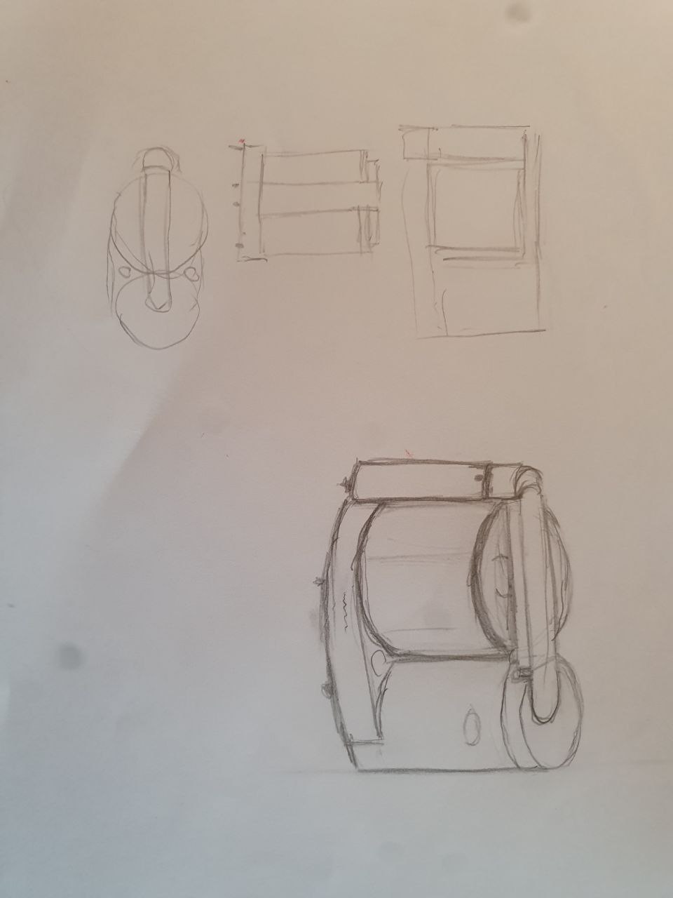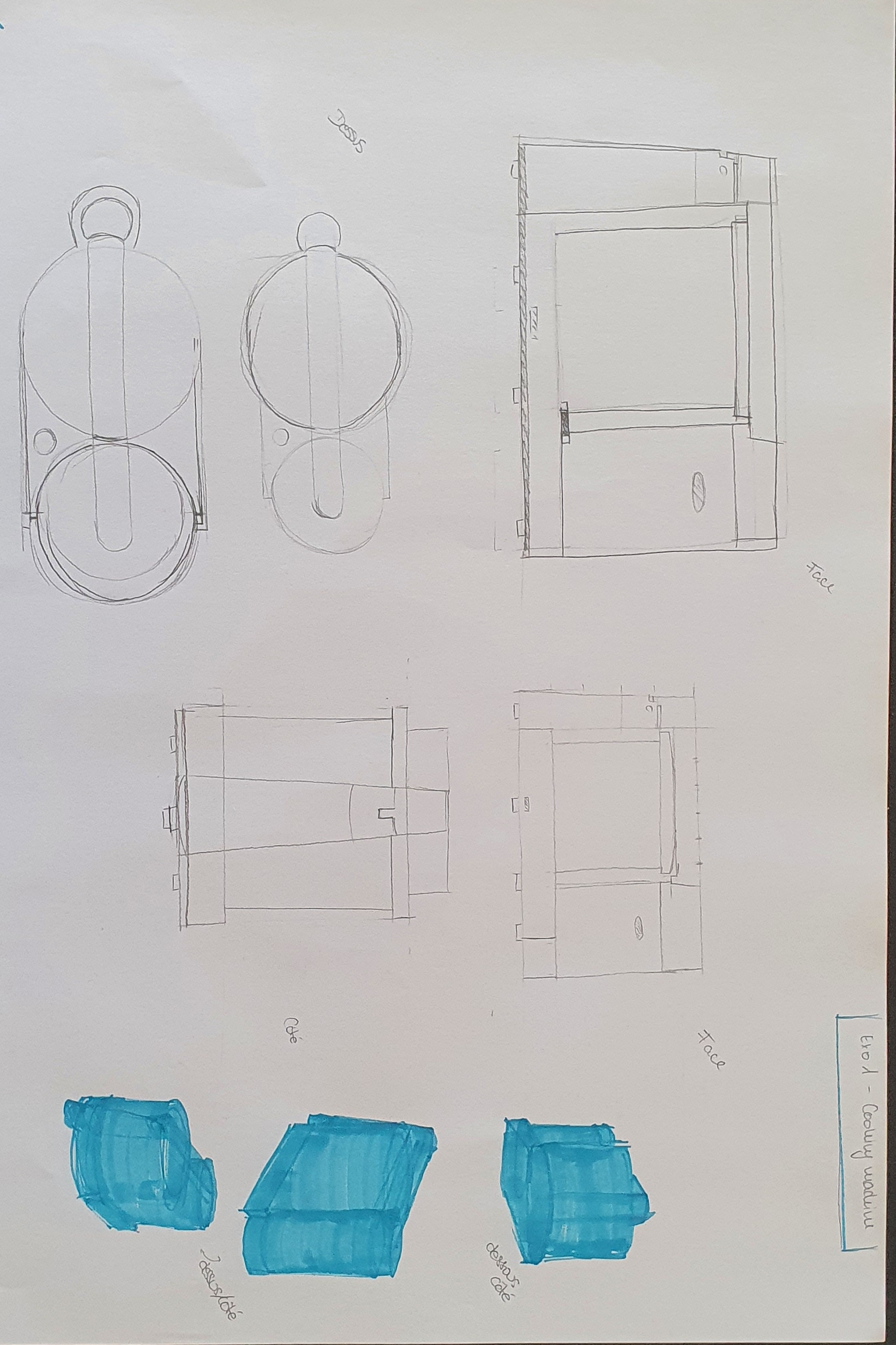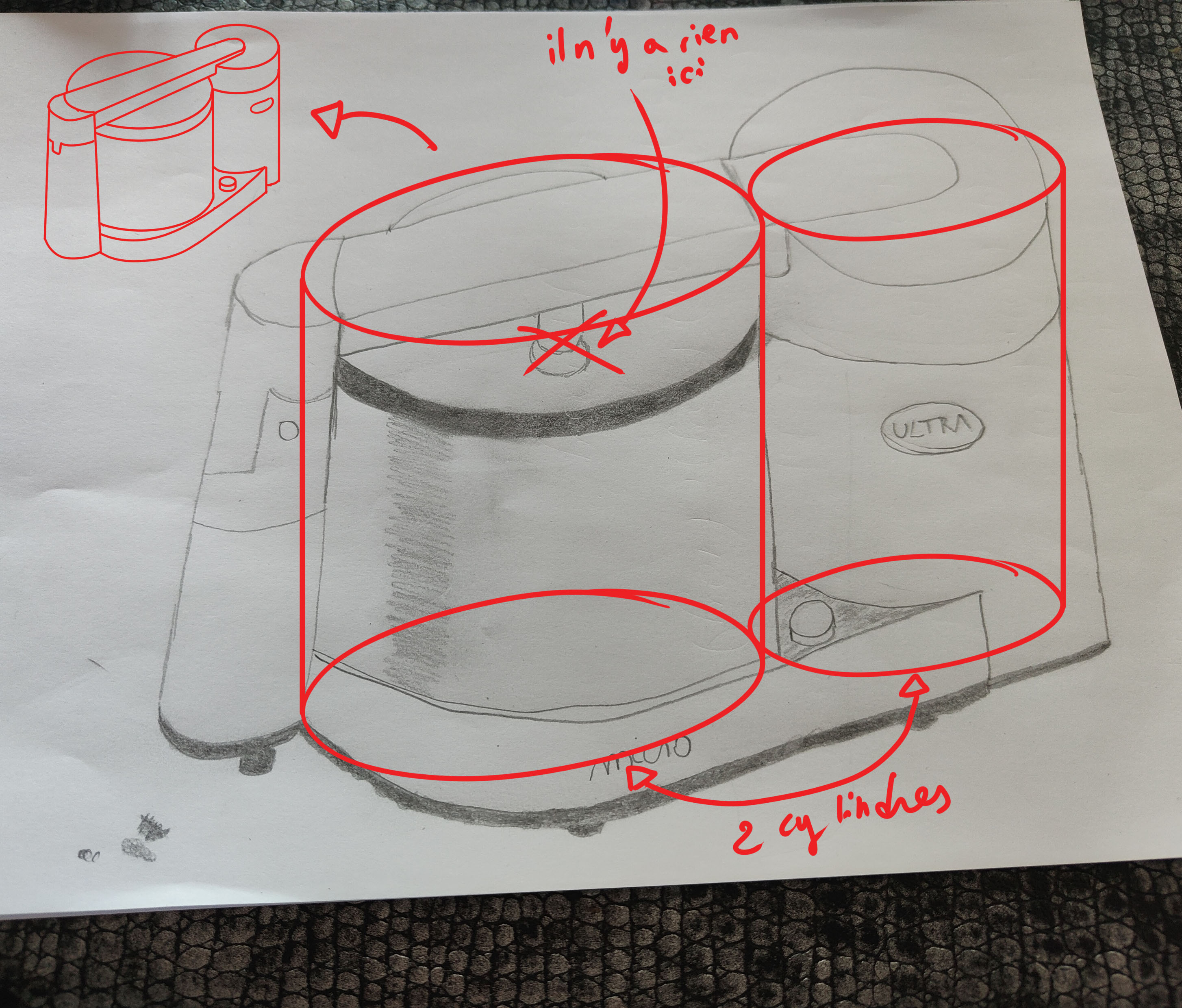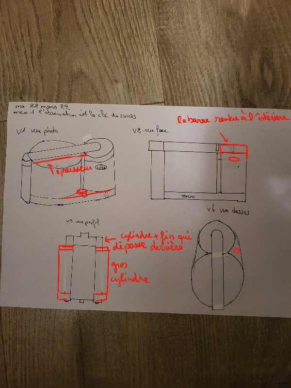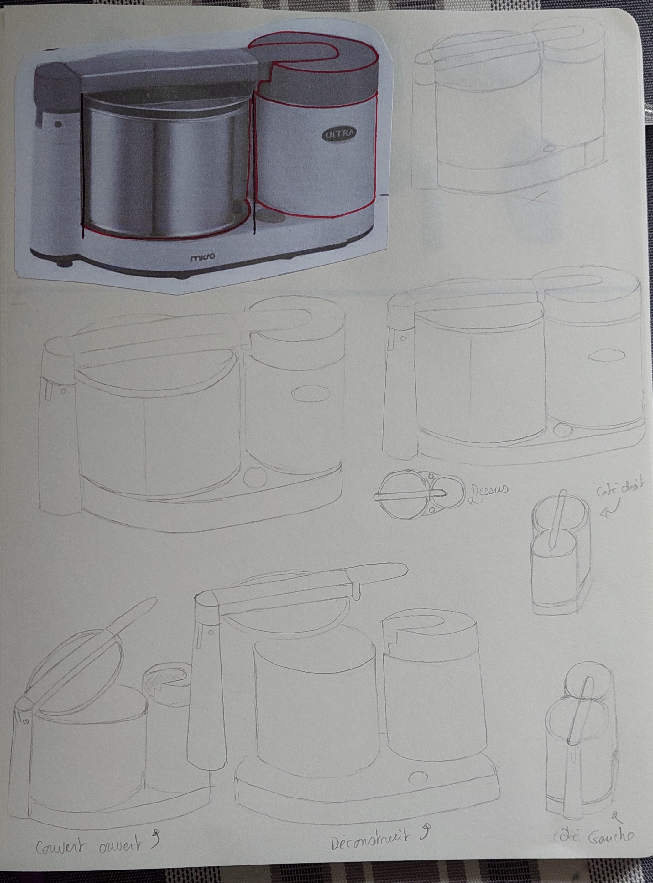 Voici mes croquis du premier objet. J'ai trouvé que c'était le plus compliqué des 3 à représenter.