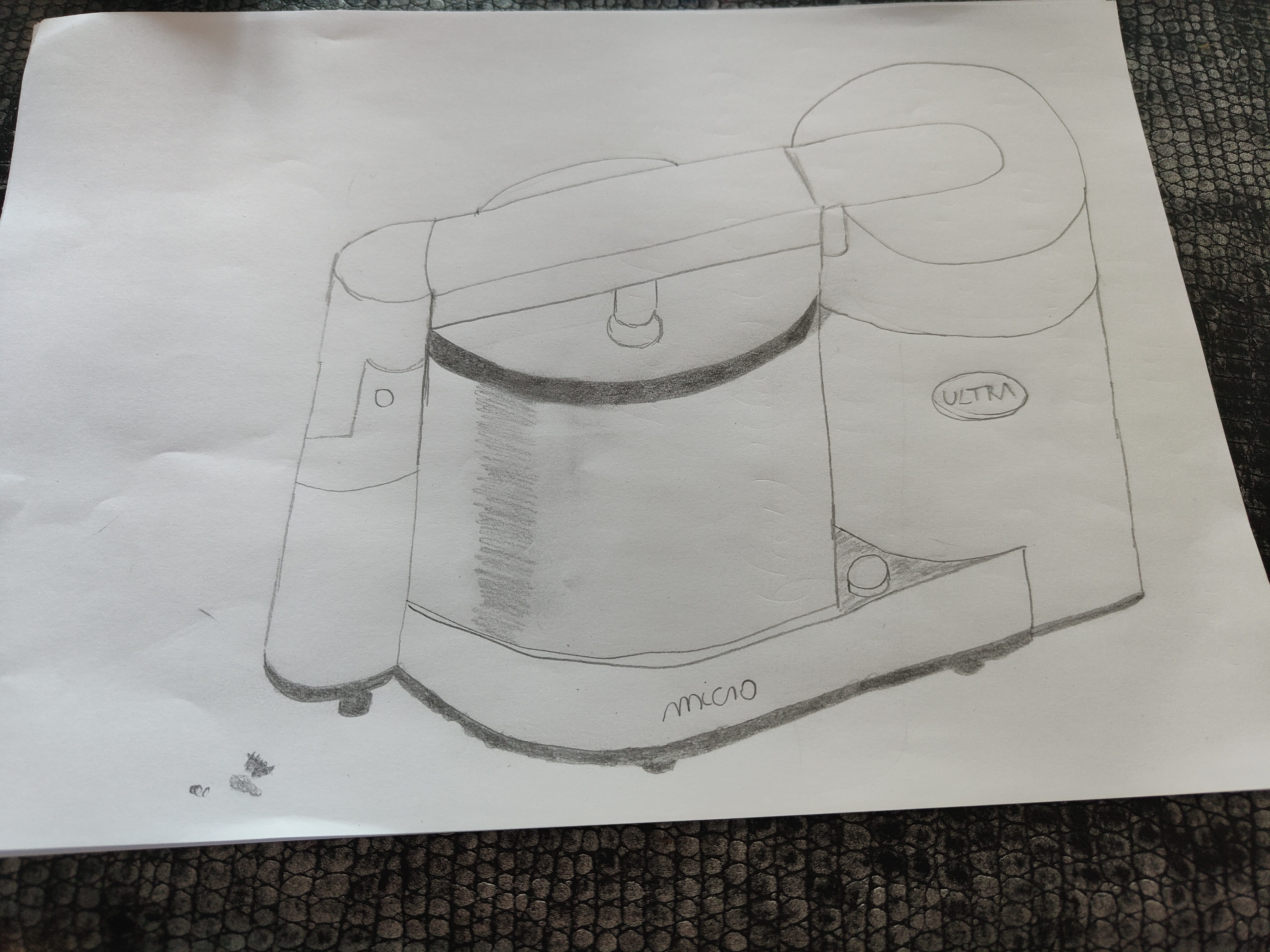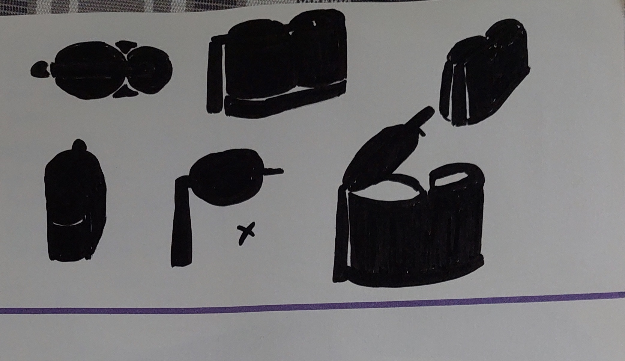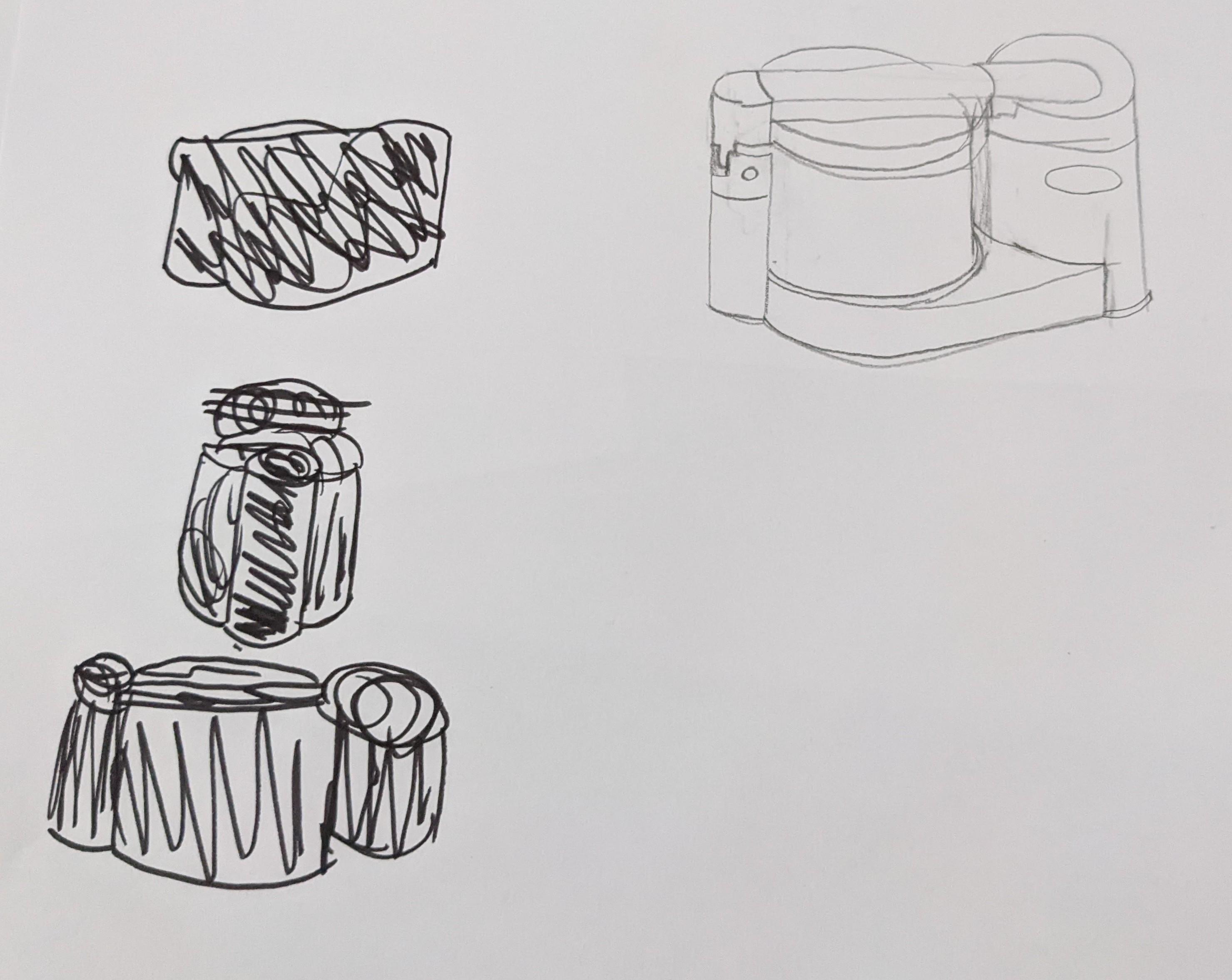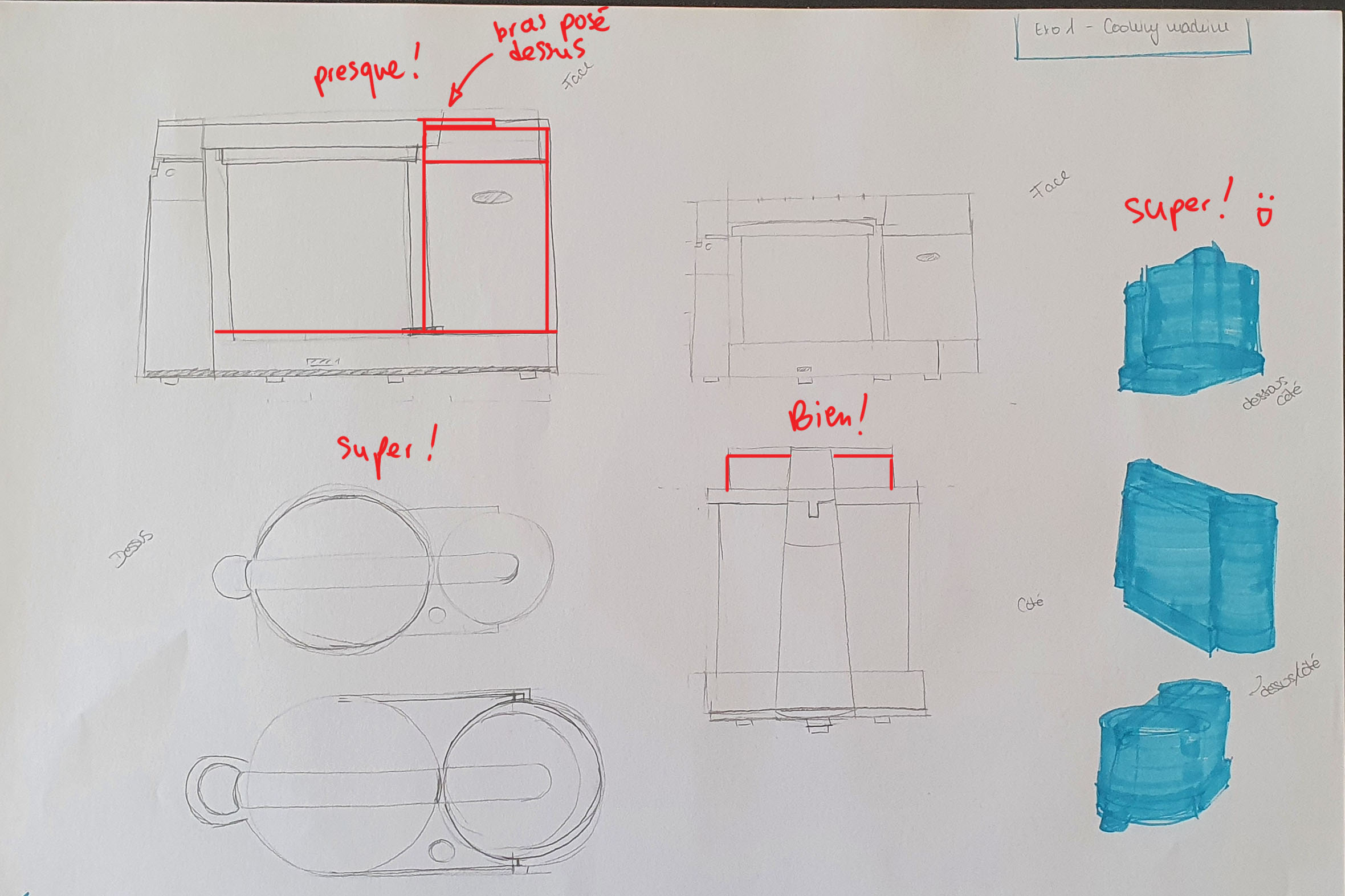 Voici mes croquis du premier objet. J'ai trouvé que c'était le plus compliqué des 3 à représenter.