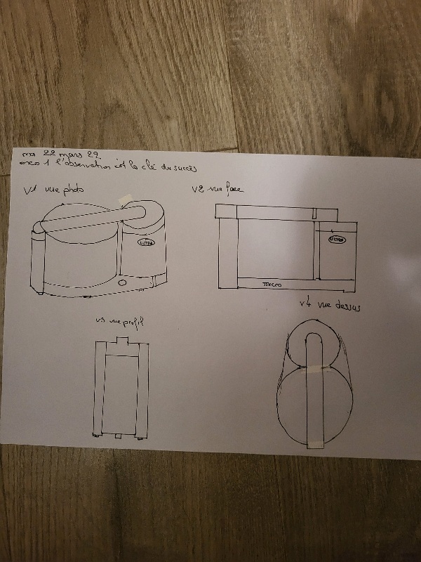 Bonjour 79jay79, Bravo pour ton dessin, c'est vraiment pas mal pour un début ! :) Voici ma correction dessinée pour t'améliorer. Essaie de voir l'objet dans son ensemble, comme plusieurs éléments géométriques simples qui s'emboîtent. Attention à tes élipses et à ta perspective dans la vue de 3/4. Bon courage pour les prochaines vues :)