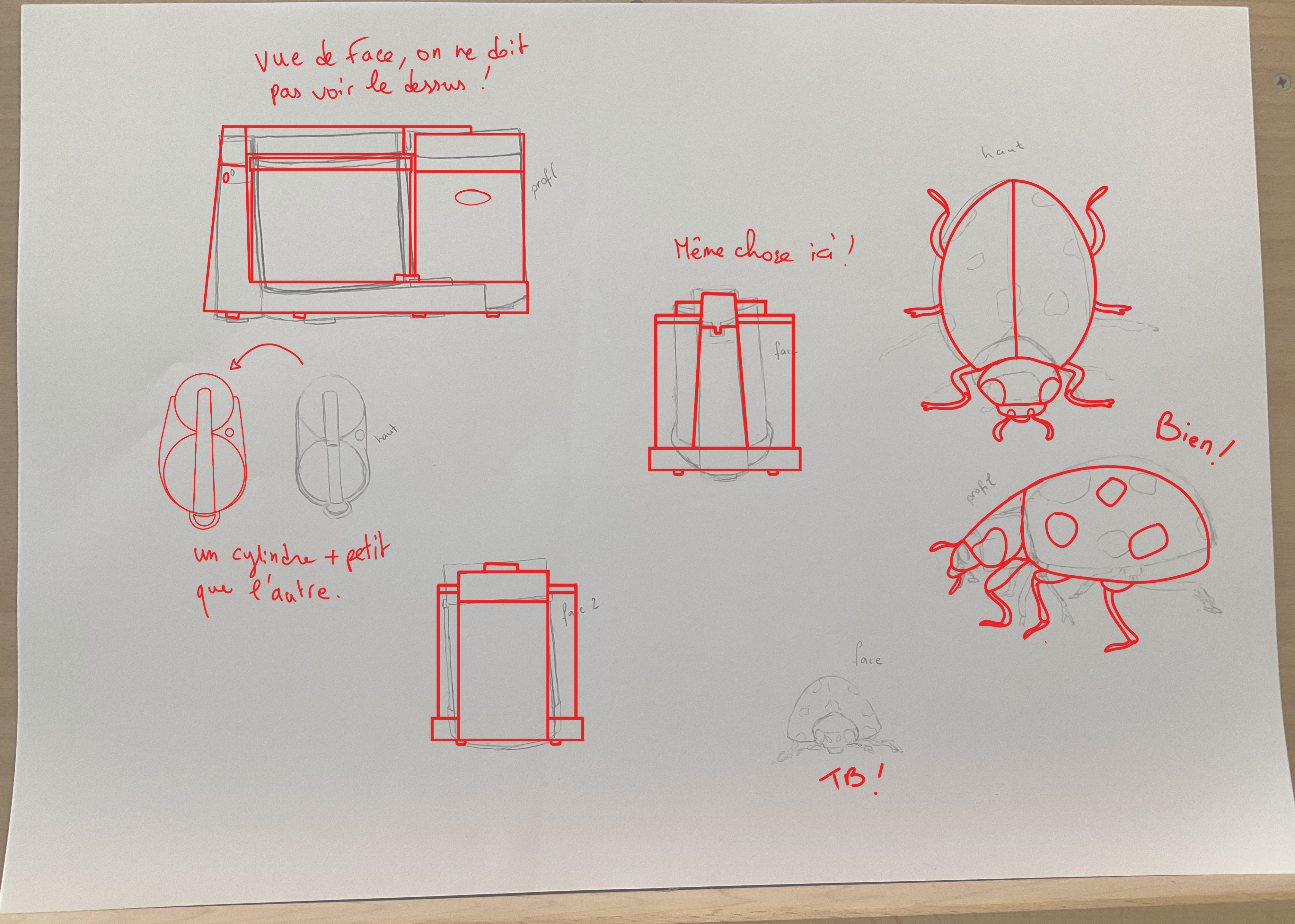 Voici ma correction dessinée pour t'améliorer. Essaie de voir l'objet dans son ensemble, comme plusieurs éléments géométriques simples qui s'emboîtent.