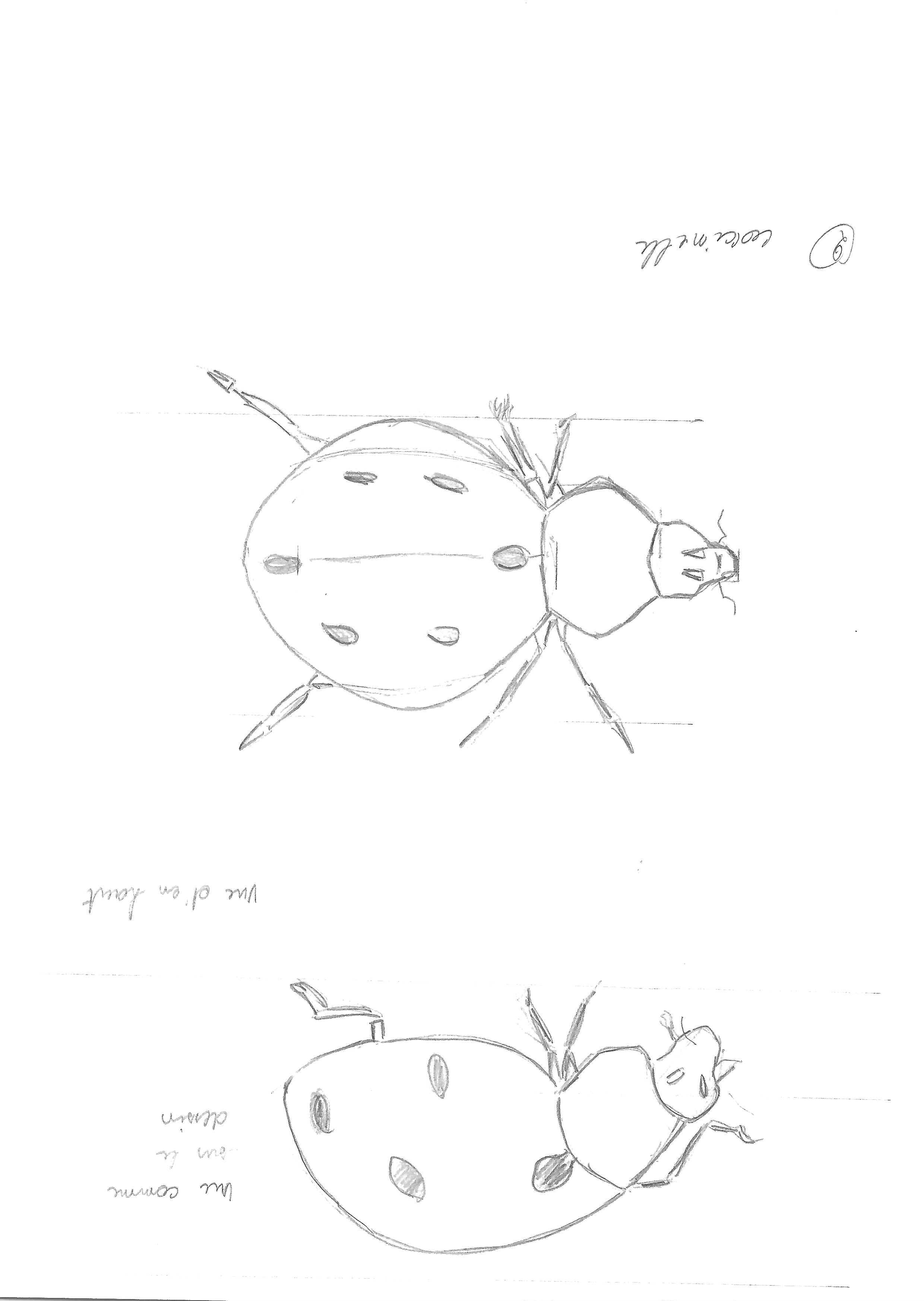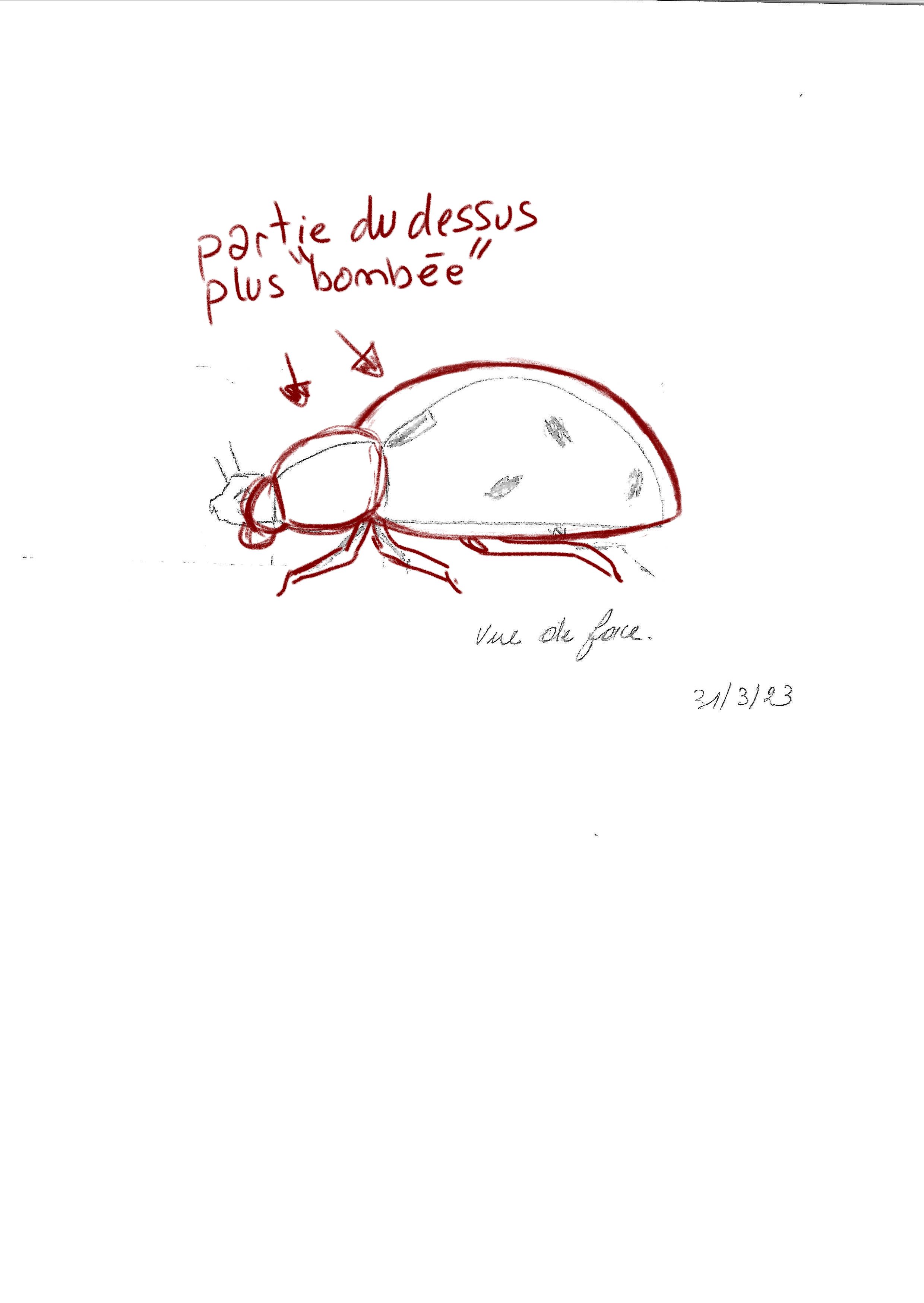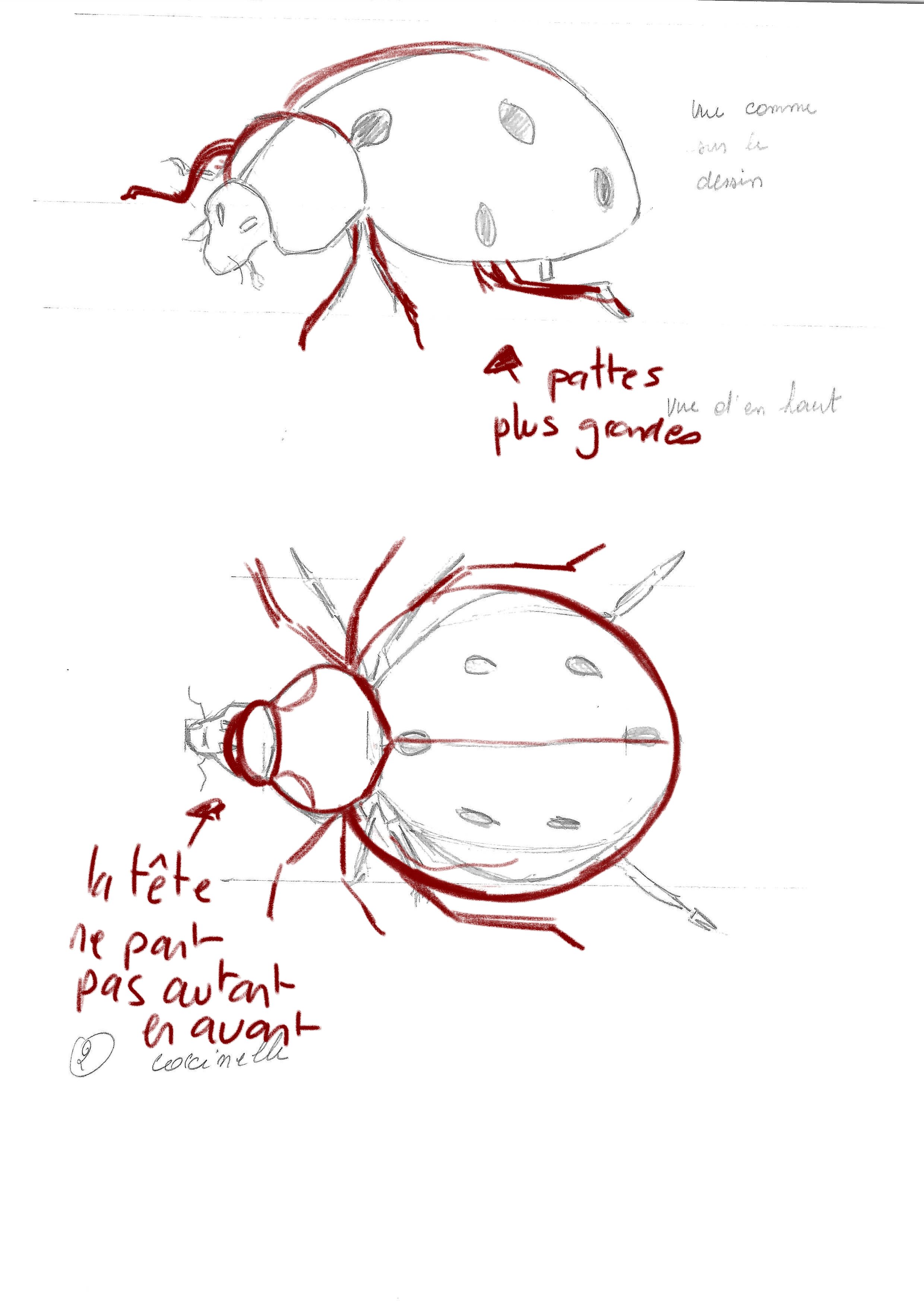Pour la coccinelle, fais attention sur la vue de face il y a quelques défauts, notamment sur la forme du corps et le positionnement des pattes. Tu aurais pu tenter d'autres angles, de dessus, de côté, ça aurait été pas mal.