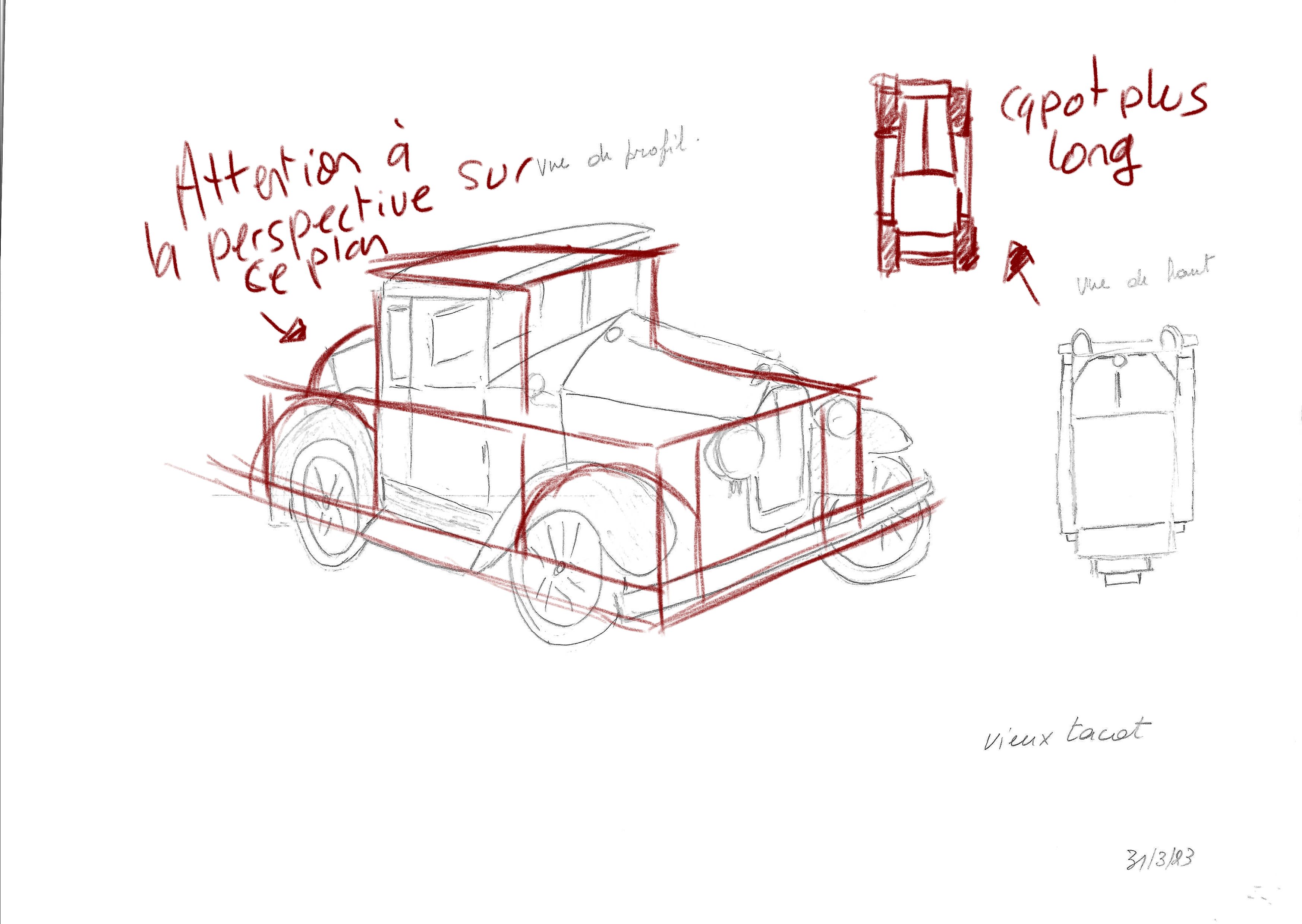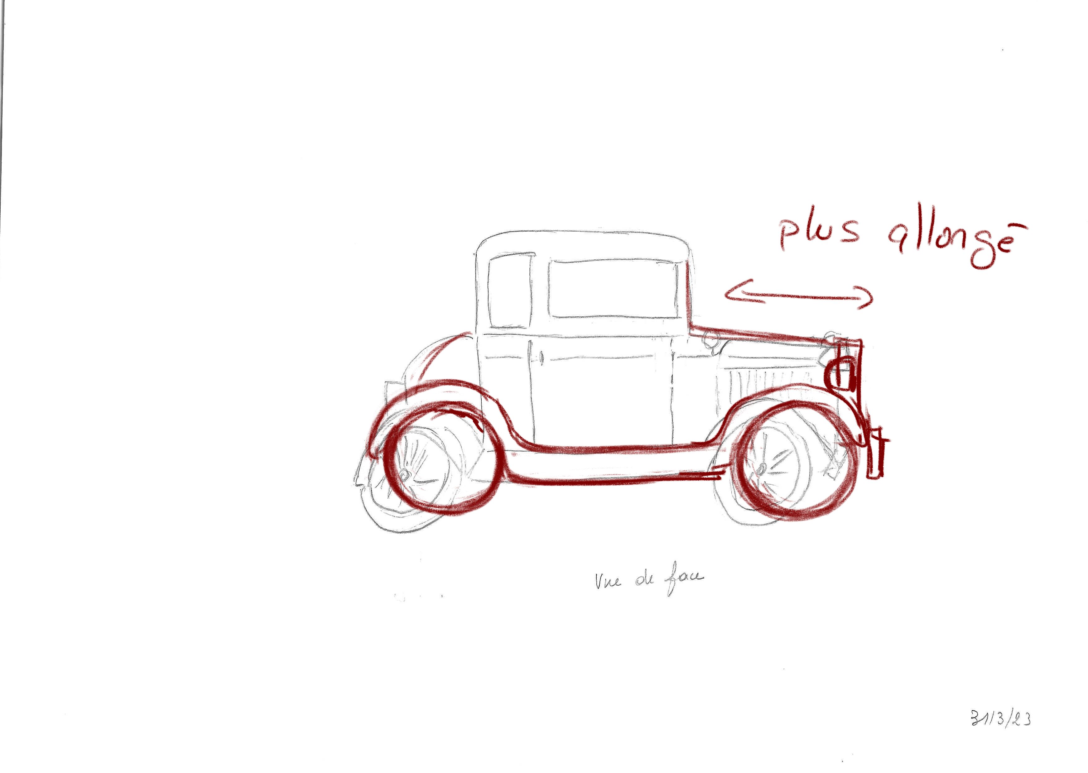 Très bien cette vue de profil de la voiture! Attention au capot qui devrait être un peu plus long, ainsi qu'au placement des roues.