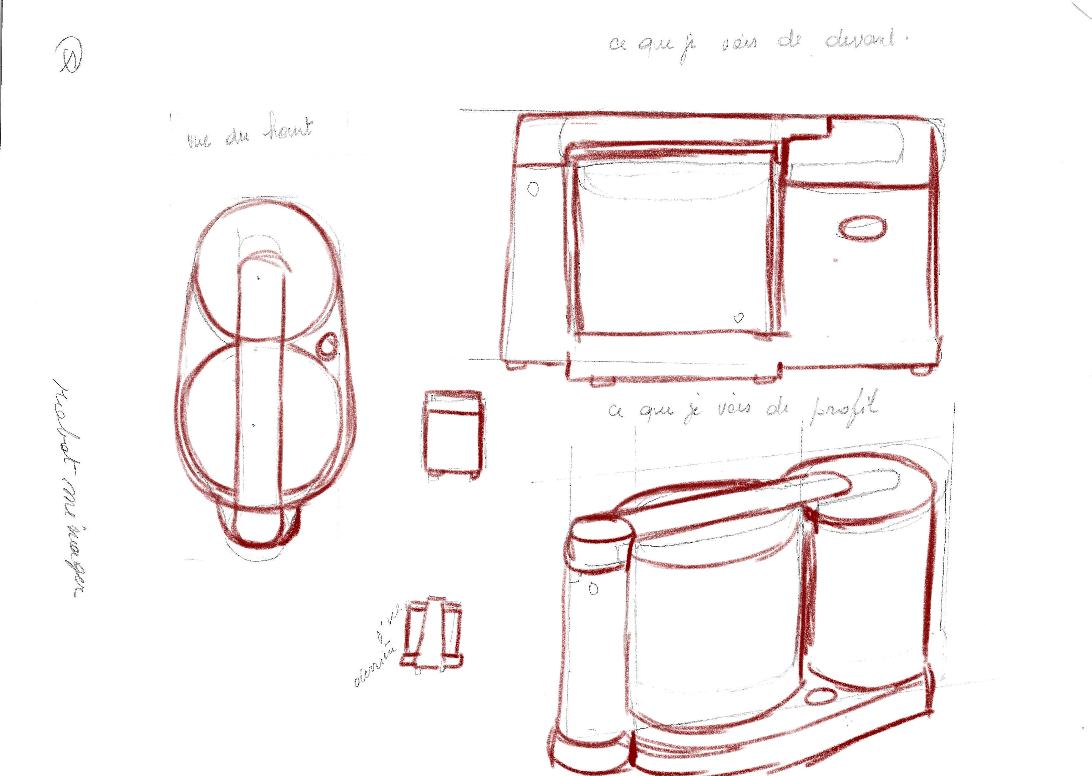 Bonjour Adèle, c'est très bien tout ça! Sur la premièere vue du robot cuiseur il y a de petit défauts de perspective, mais rien de bien grave. Tes vues de dessus et de côté sont très bien.