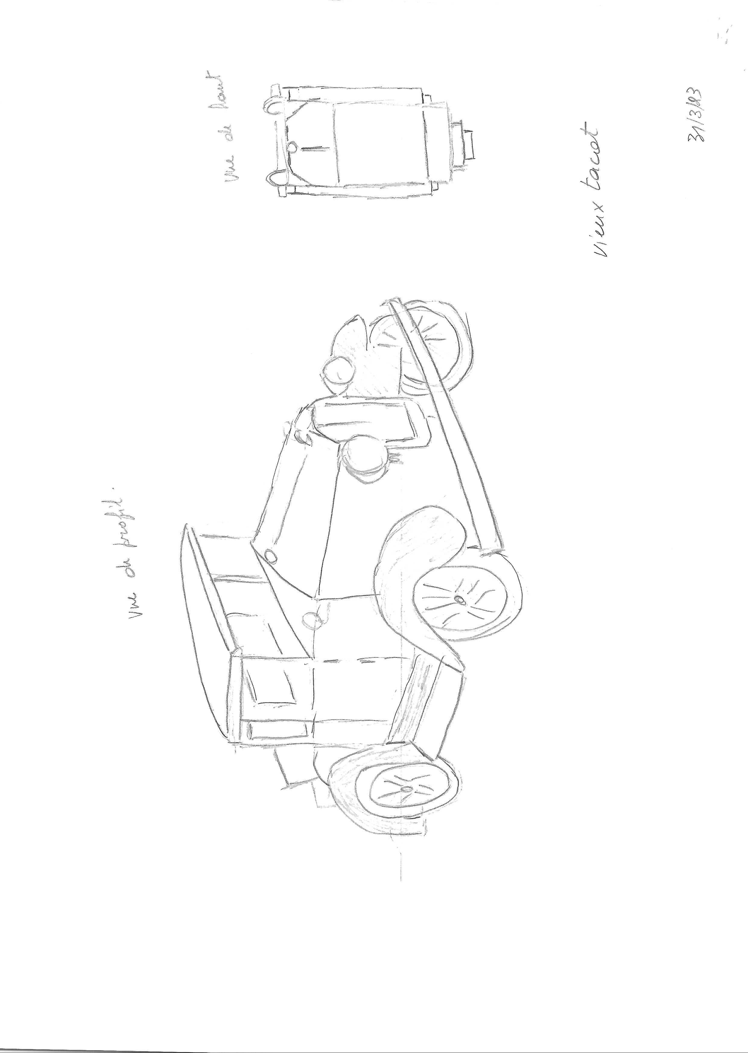 je vous envoie mes dessins de plusieurs points de vue,je n'ai pas fait la voiture car je l'ai trouvé trop difficile.