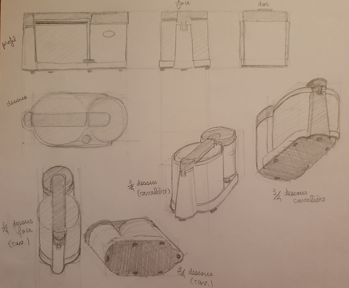voilà ma planche d'étude de l'autocuisseur. Après les vues 2D, j'ai fait quelques tests en cavalière pour voir si j'arrivai à exploiter les info collectées en 2D...