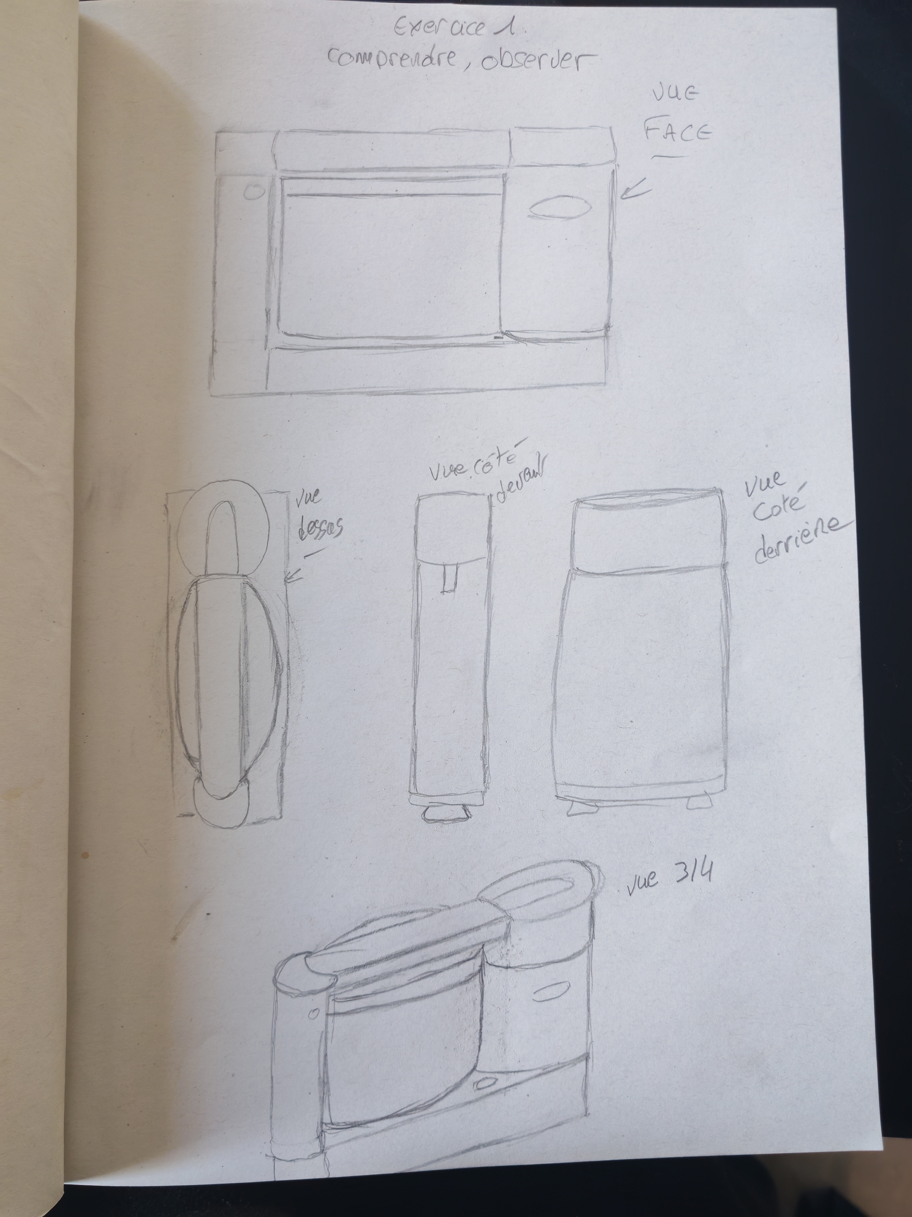 Tes dessins de 3/4 sont vraiment réussis ! Effectivement, la vue de face n'est pas très simple, car c'est celle qui écrase le plus les objets et notre cerveau a tendance à vouloir la modifier pour mieux retranscrire le volume. Avec un peu de pratique, tu y arriveras sans souci ! Attention pour ta coccinelle vue de dessus : veille à bien retranscrire les proportions tête/corps, elle me paraît avoir pris un peu la grosse tête, haha. Pour le 3/4 de l'appareil, la partie du fond semble un peu relevée. Tu peux t'aider d'un cube pour mieux le construire et éviter cet effet. N'hésite pas à reporter tes futurs essais ! 😀