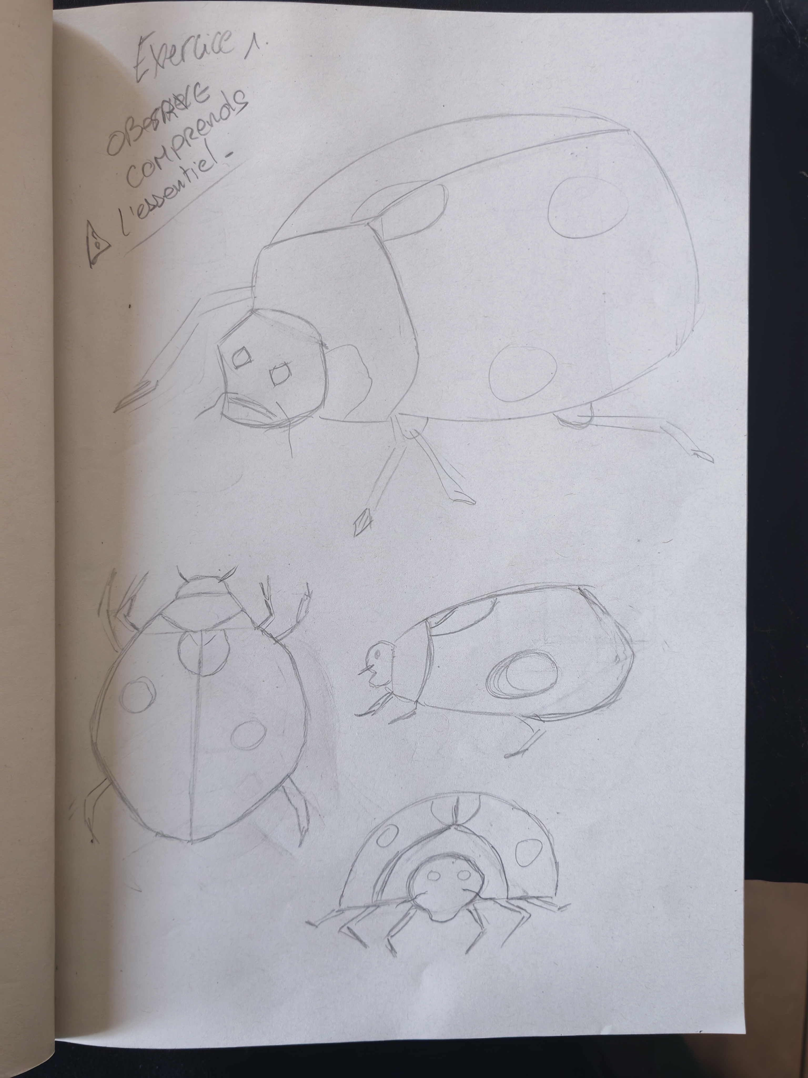 Voila que j'ai fait la cocinelle (et quelque croquis de guèpe que j'ai fait en écoutant le cours!) Je suis plutôt content de moi, excepté pour la coccinelle vue du dessus mais c'est tout!