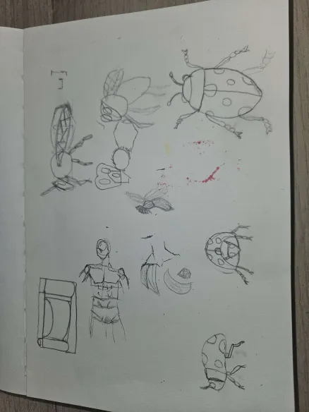 Voila que j'ai fait la cocinelle (et quelque croquis de guèpe que j'ai fait en écoutant le cours!) Je suis plutôt content de moi, excepté pour la coccinelle vue du dessus mais c'est tout! Bonne journée ;)