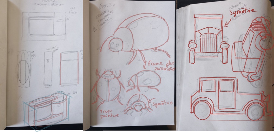 Voilà la correction avec un peu de retard ! C'est plutôt bien, mais il y a quelques erreurs récurrentes, notamment au niveau de la symétrie. Cela se remarque particulièrement sur la coccinelle et la voiture : tu as tendance à légèrement dévier sur la droite, ce qui déforme tes dessins. N'hésite pas à tracer une ligne de symétrie, cela pourra t'aider à mieux équilibrer les deux côtés.