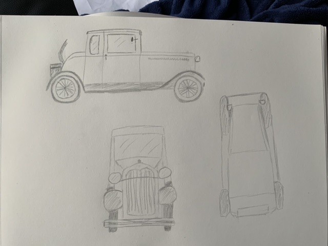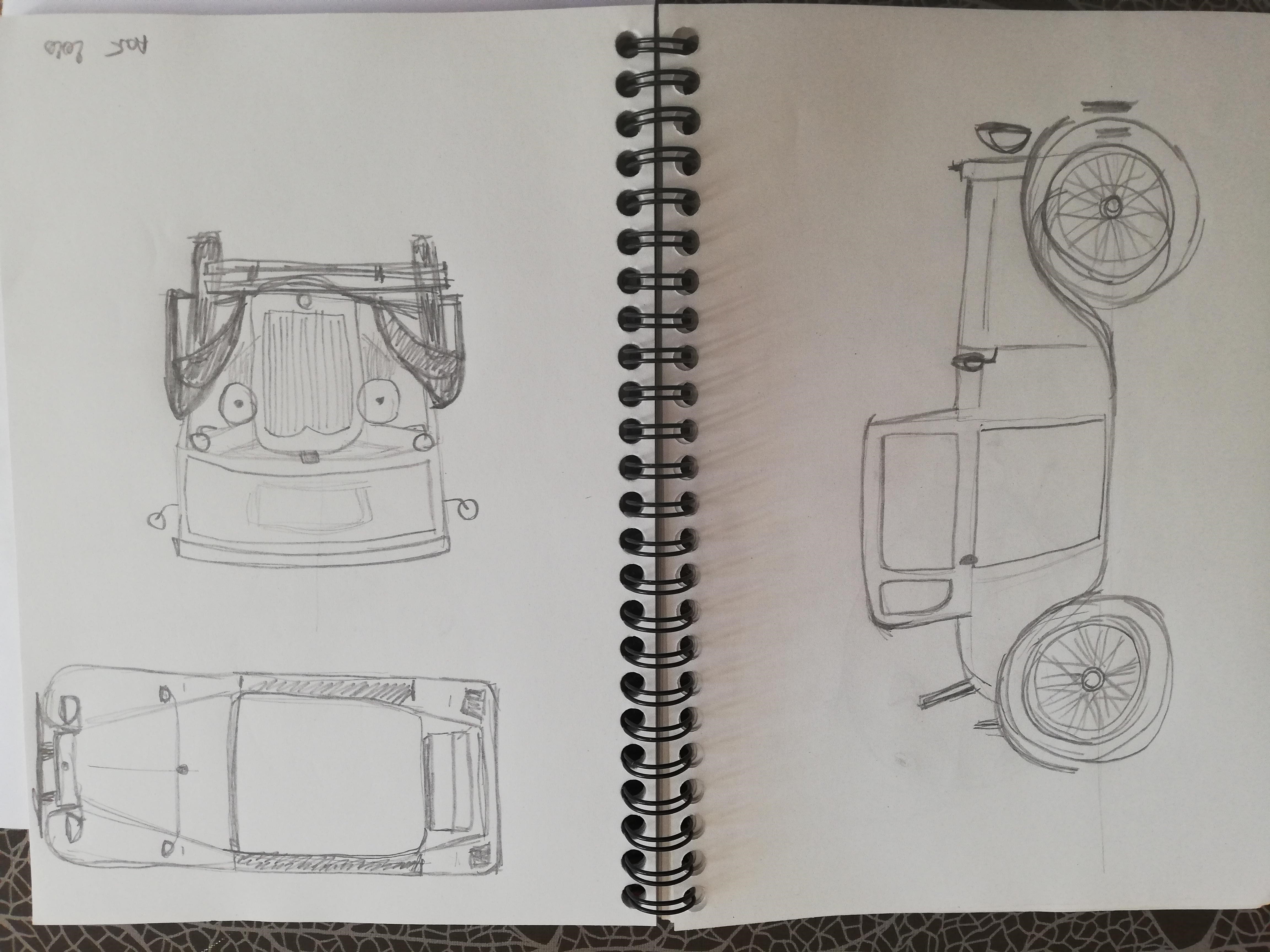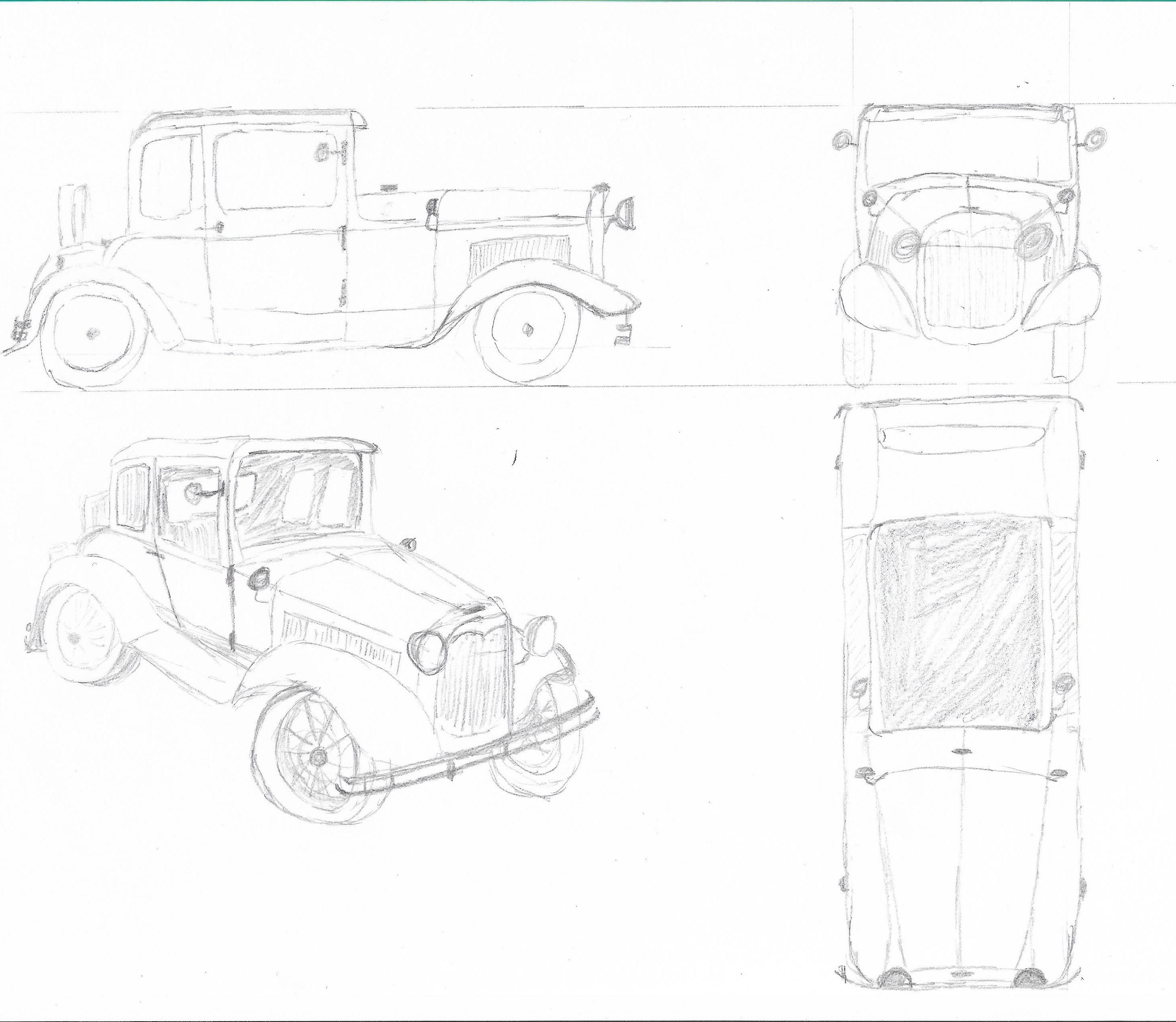 C'est du beau travail, on voit que tu y as passé du temps ! La forme globale de la voiture est comprise, notamment les proportions entre l'habitacle de la voiture et le capot. Là où tu as plus de mal c'est au niveau du devant de la voiture, on le voit surtout sur ta vue de dessus et un peu sur la vue de profil. Il faut bien faire attention à qu'est-ce qui est devant quoi. Les phares doivent être positionnés un peu à l'avant du bout de la voiture, les garde-boue des roues avant doivent un peu dépasser les phares, et enfin, le pare-choc va devant tout ça. Et attention à l'oubli du pare-choc sur la vue de face ;) Observe bien de nouveau l'avant de la voiture et n'hésites pas à me dire si tu n'as pas compris ^^