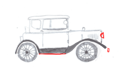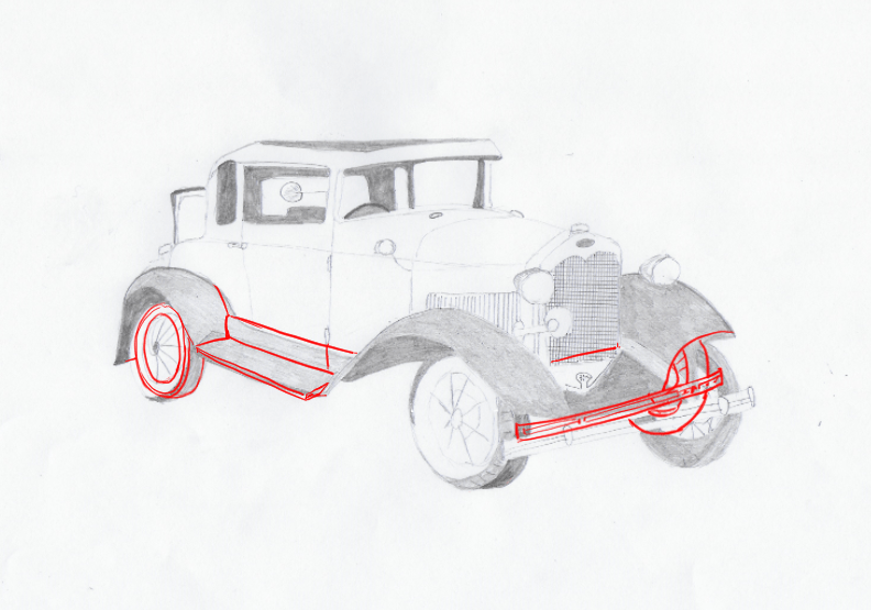 Je fais beaucoup de commentaires, mais les détails de la voiture sont bien compris, notamment sur la carrosserie, c'est soigné ^^ C'est du bon travail et je pense que tu n'es pas loin de mieux comprendre. Je te joins des corrections visuelles pour les éléments qui me semblent plus clairs en visuel ;)