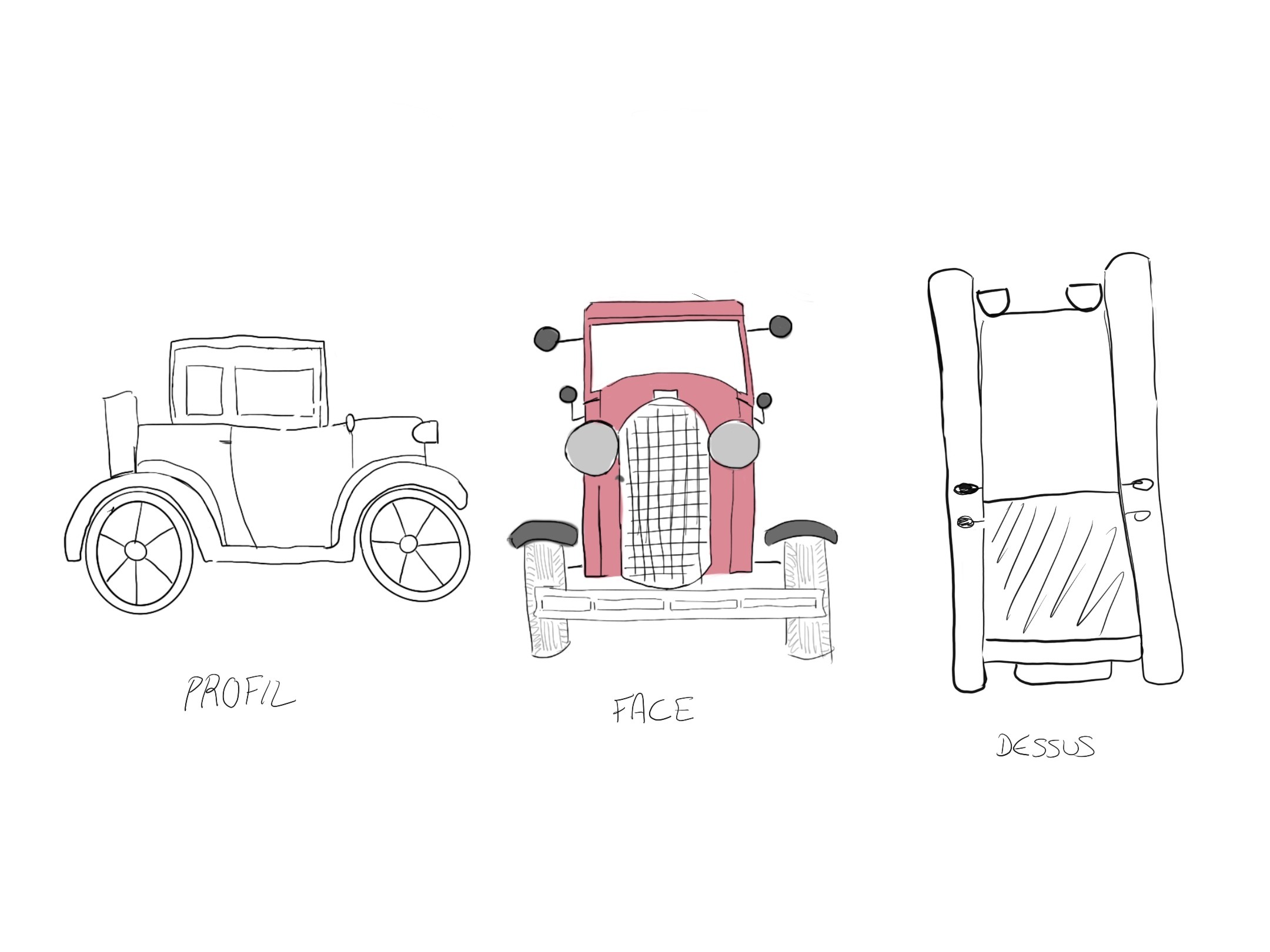 C'est pas mal, tu as compris quels sont les différents éléments, mais il y a encore un peu de travail, les formes sont parfois un peu tordues et pas avec les bonnes proportions. Je te conseille de décomposer la voiture globale en formes simples d'abord (carrés, ronds, rectangles...) et détailler par la suite. Pour ta vue de profil le capot est un peu trop court et j'ai l'impression qu'il manque le pare-choc. Il y a un souci au niveau des gardes boue. Sur une vue de profil on devrait les voir plus fins et ne pas tant cacher les roues (attention d'ailleurs, elles ne sont pas pareil). Aussi, on ne devrait pas voir de rectangle pour le pare-brise sous cet angle.