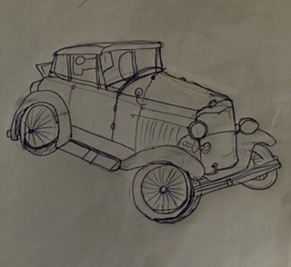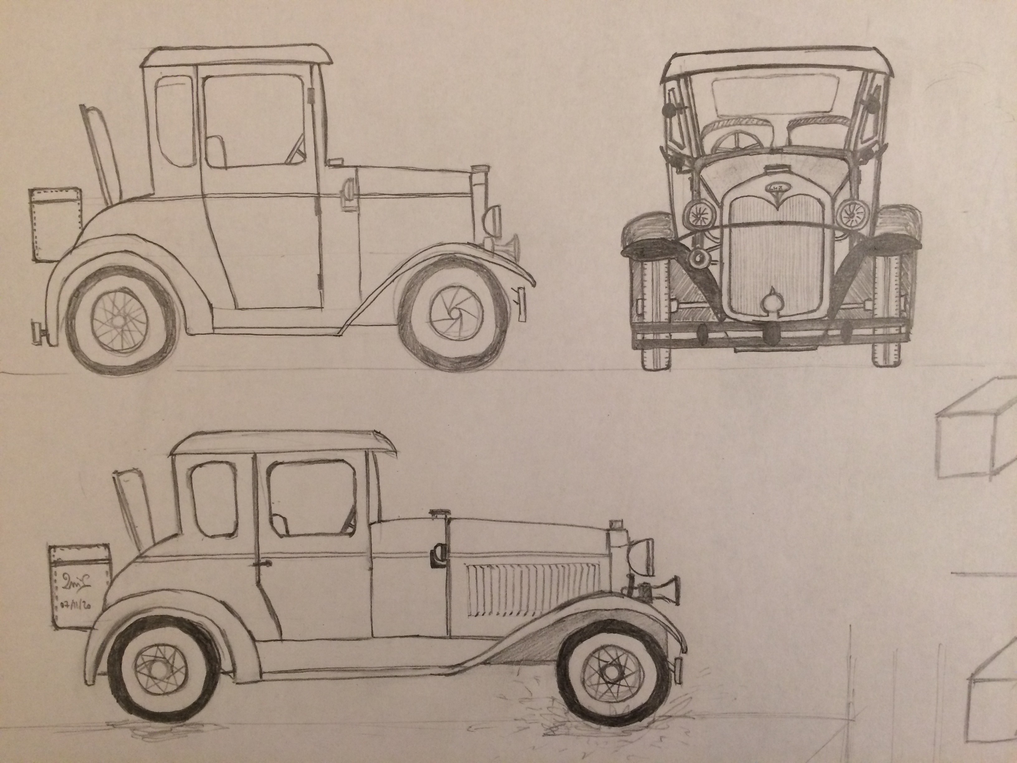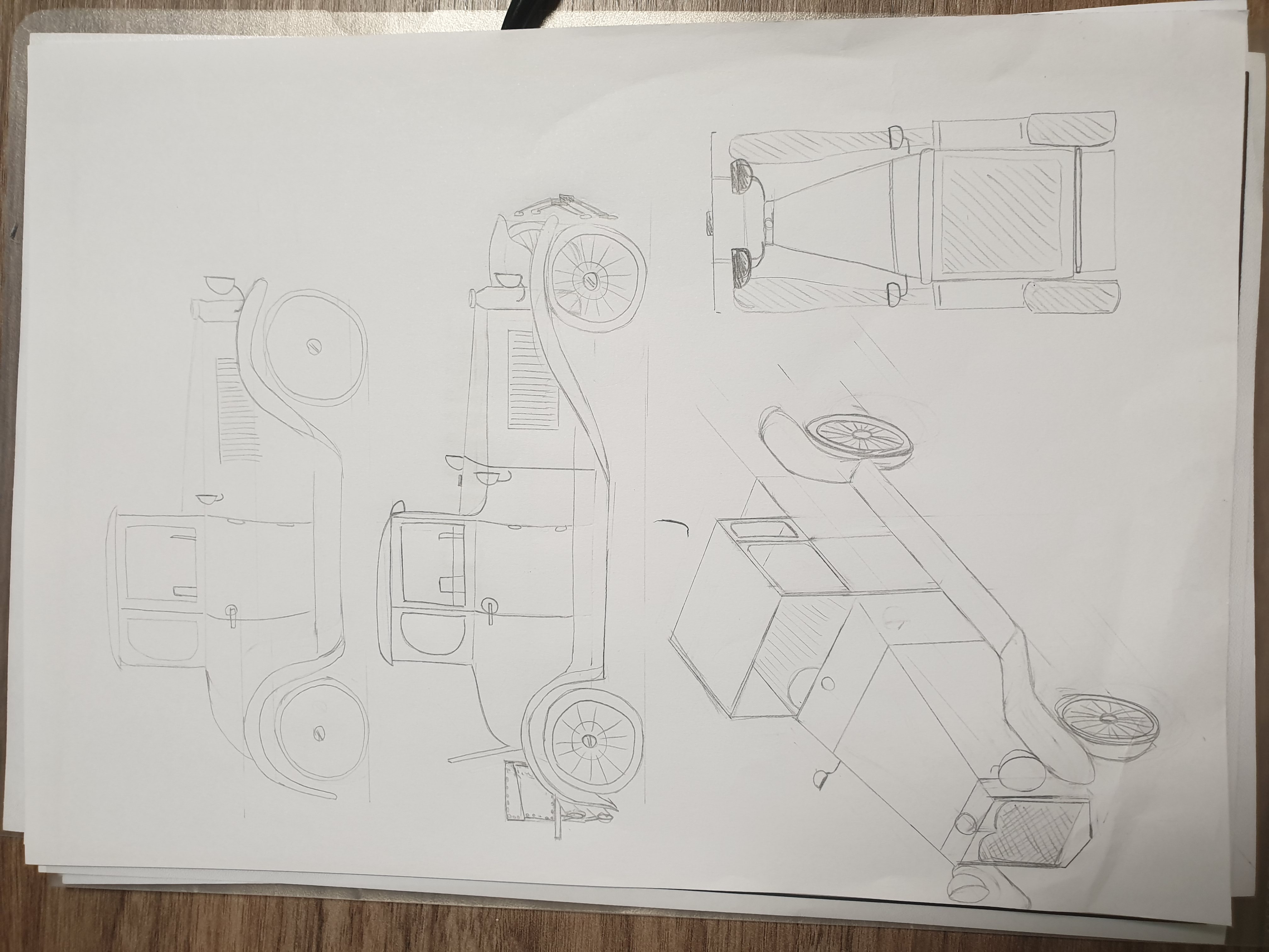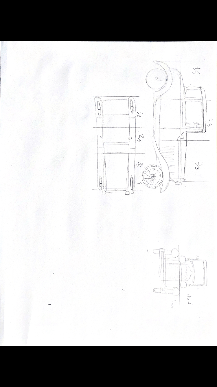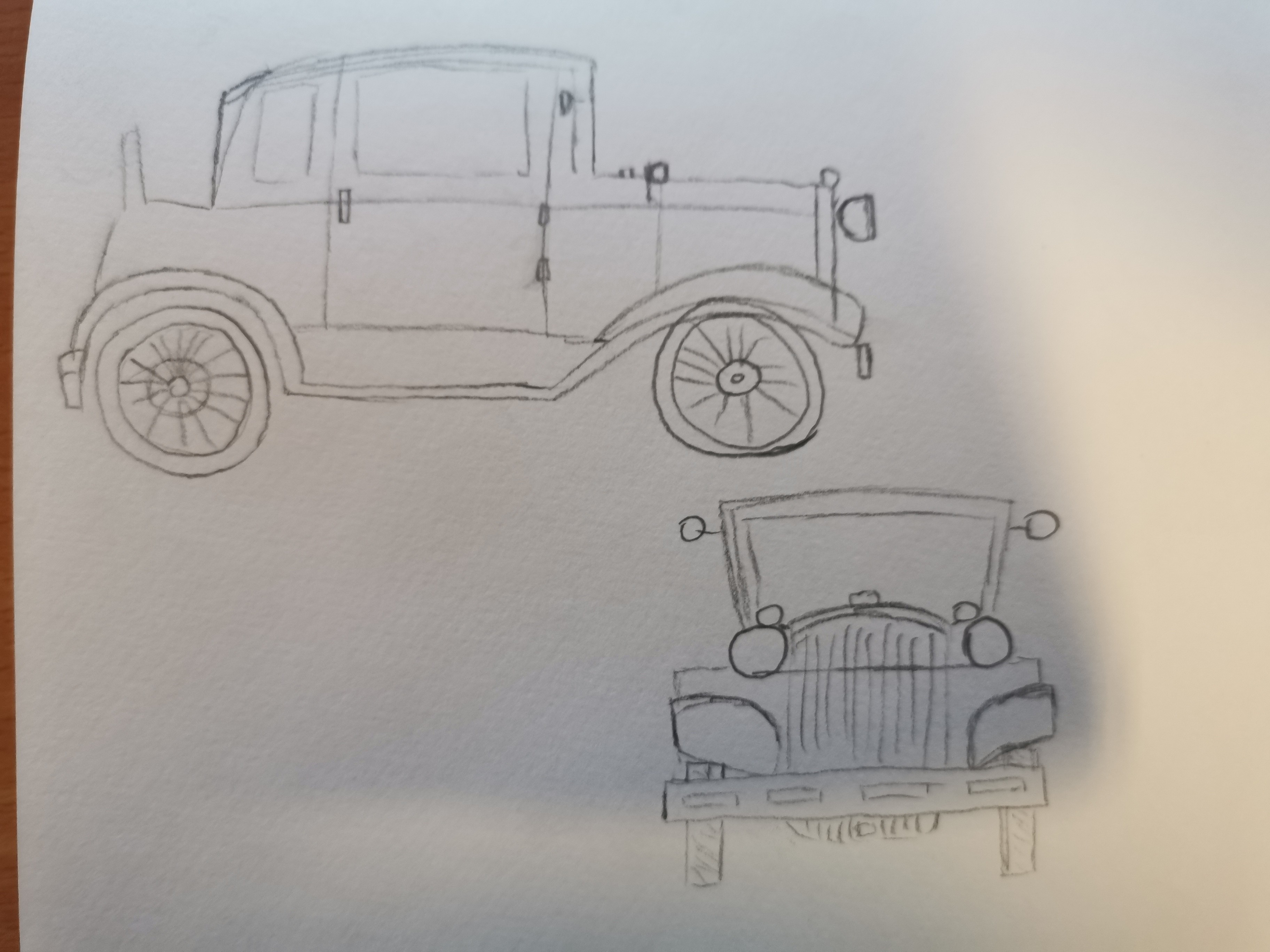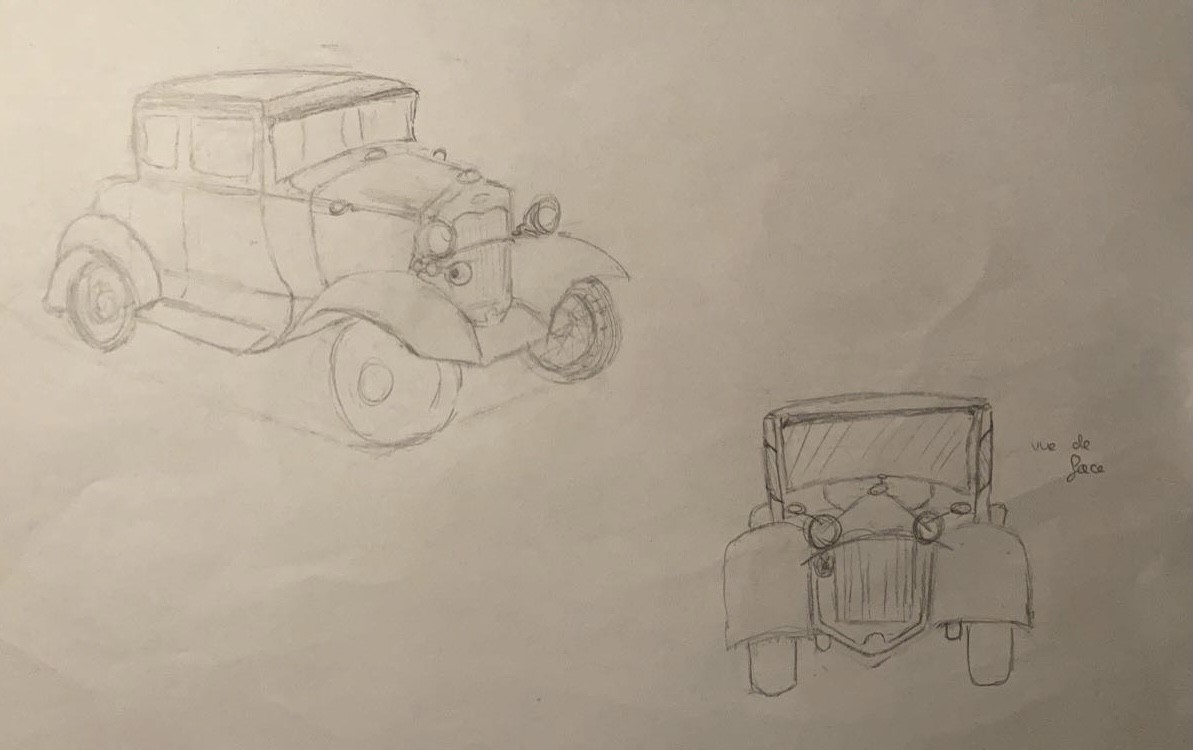 Pour ta vue en volume mmmmh... Elle est de travers. Tantôt les éléments ont l'air plus de profil, tantôt ils ont l'air plus de face... Du coup elle est toute tordue. Les roues et les phares sont trop de face par exemple. Je te suggère de réessayer, pourquoi pas en ayant fait une vue de plein profil avant, et de faire attention à ta construction : par exemple, avant de faire l'ellipse de la roue, dessine un carré en perspective dans lequel va s'inscrire le cercle de la roue. C'est beaucoup plus facile comme ça !