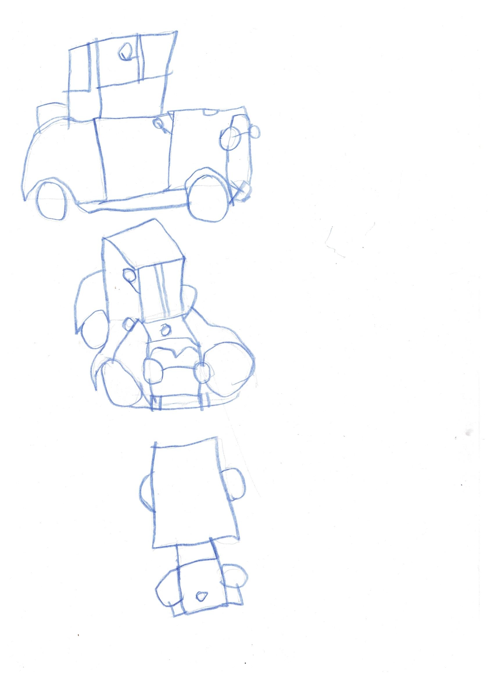 Ta vue de dessus fonctionne, ta vue de face n'est pas mal non plus mais il y a des petits soucis de proportions.. l'avant doit être plus allongé en hauteur, les roues plus allongées aussi.