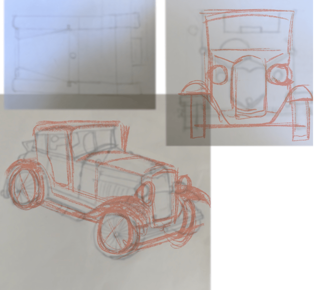 Pour ta vue de face en revanche, je pense que ta voiture s'étire un petit peu en hauteur, l'habitacle aurait peut-être du être plus large (l'avant du nez à la bonne largeur mais normalement il s'élargit sur la longueur). Mais ça se joue à pas grand chose. C'est du bon travail ! ✔️