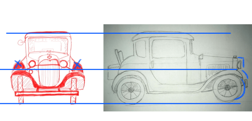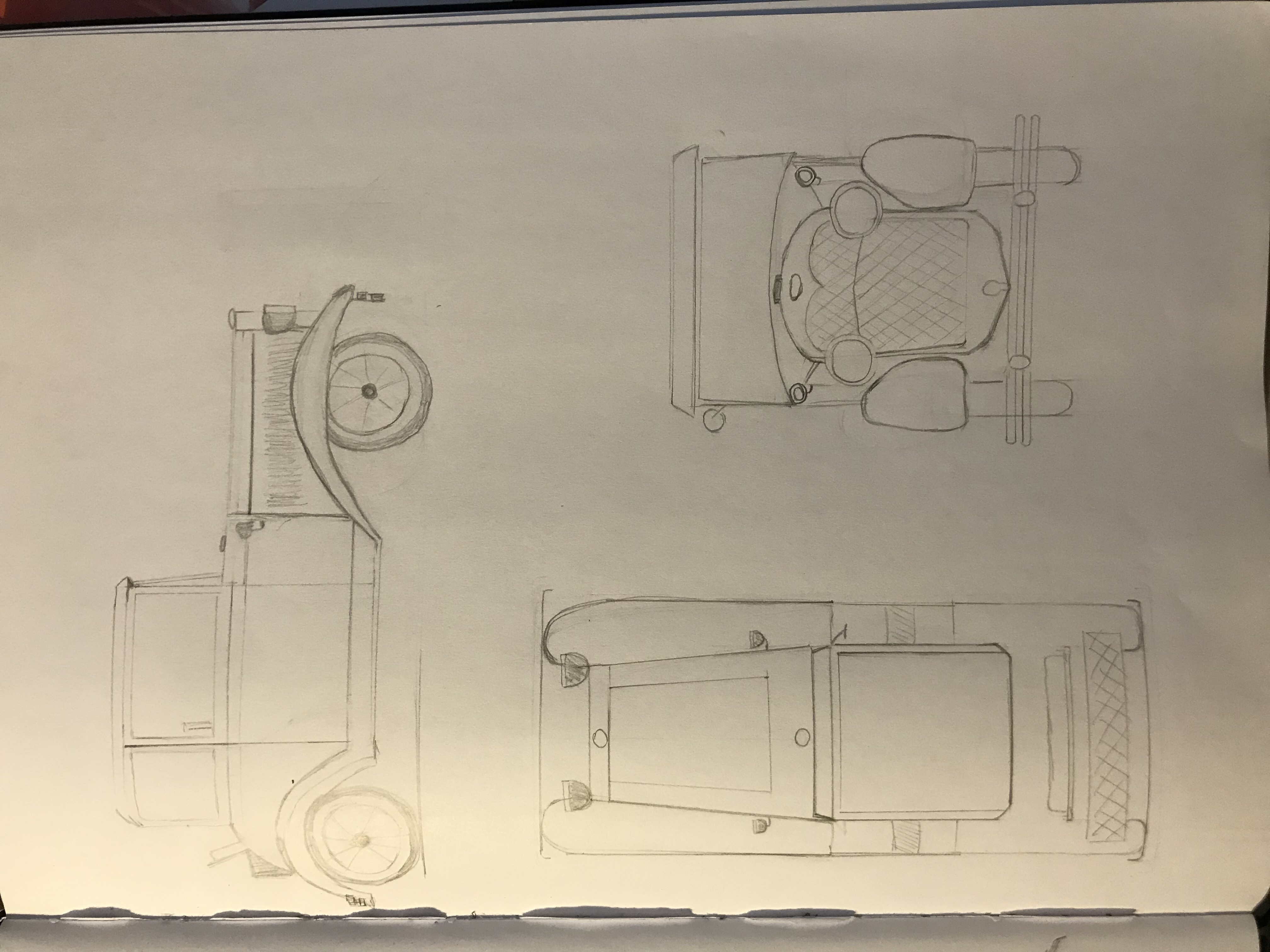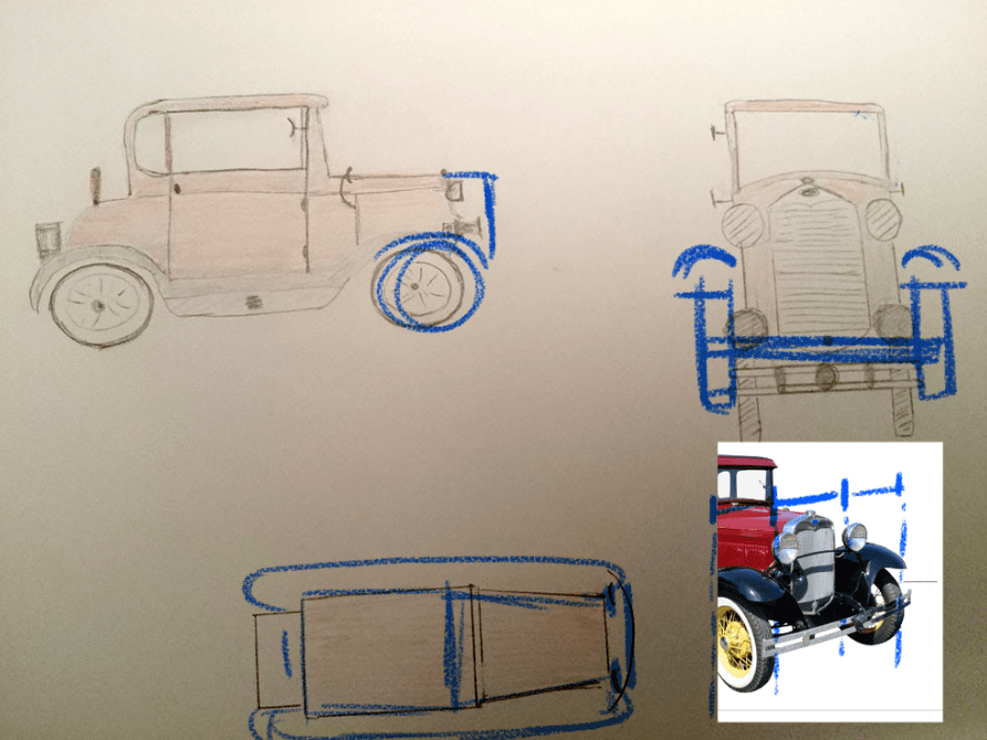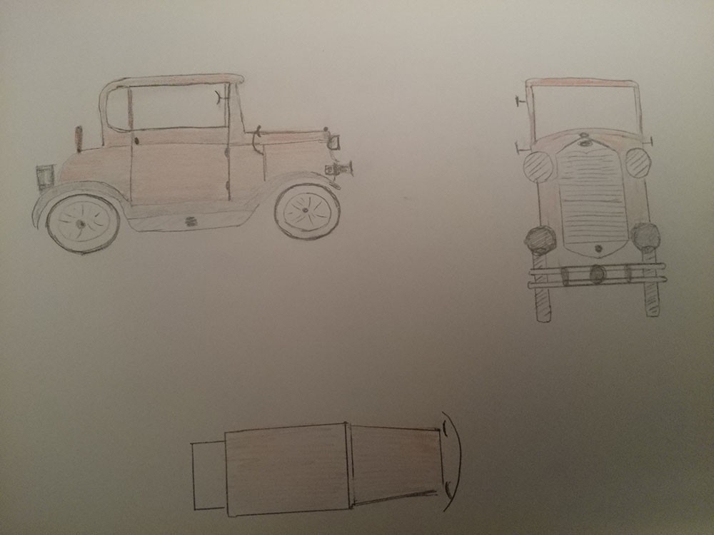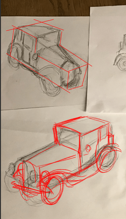 Au niveau de tes vues en volume, ça se complique. Cela dit c'est bien d'avoir essayé des angles sans "bêtement" recopier la photo ! Et forcément, c'est plus difficile. Celle du haut est clairement déformée au niveau de la cabine et même l'avant un peu aussi... Il ne faut pas hésiter à simplifier au maximum le volume quand on commence à dessiner (faire des pavés), et faire les détails des formes ensuite. Ca aide à éviter ce genre de déformation.