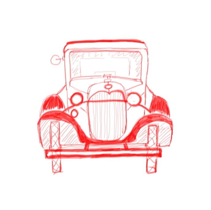 Là où ça pêche plus, c'est la vue de face. Le placement des roues/gardes boue n'est pas bon. Quand tu regarde la ref, on voit que les gardes boues prennent une place conséquente dans la largeur de la voiture, à l'avant ! Et du coup tu as complètement skippé ces dits garde boue sur la vue du dessus ^^' Je te joins une petite correction !