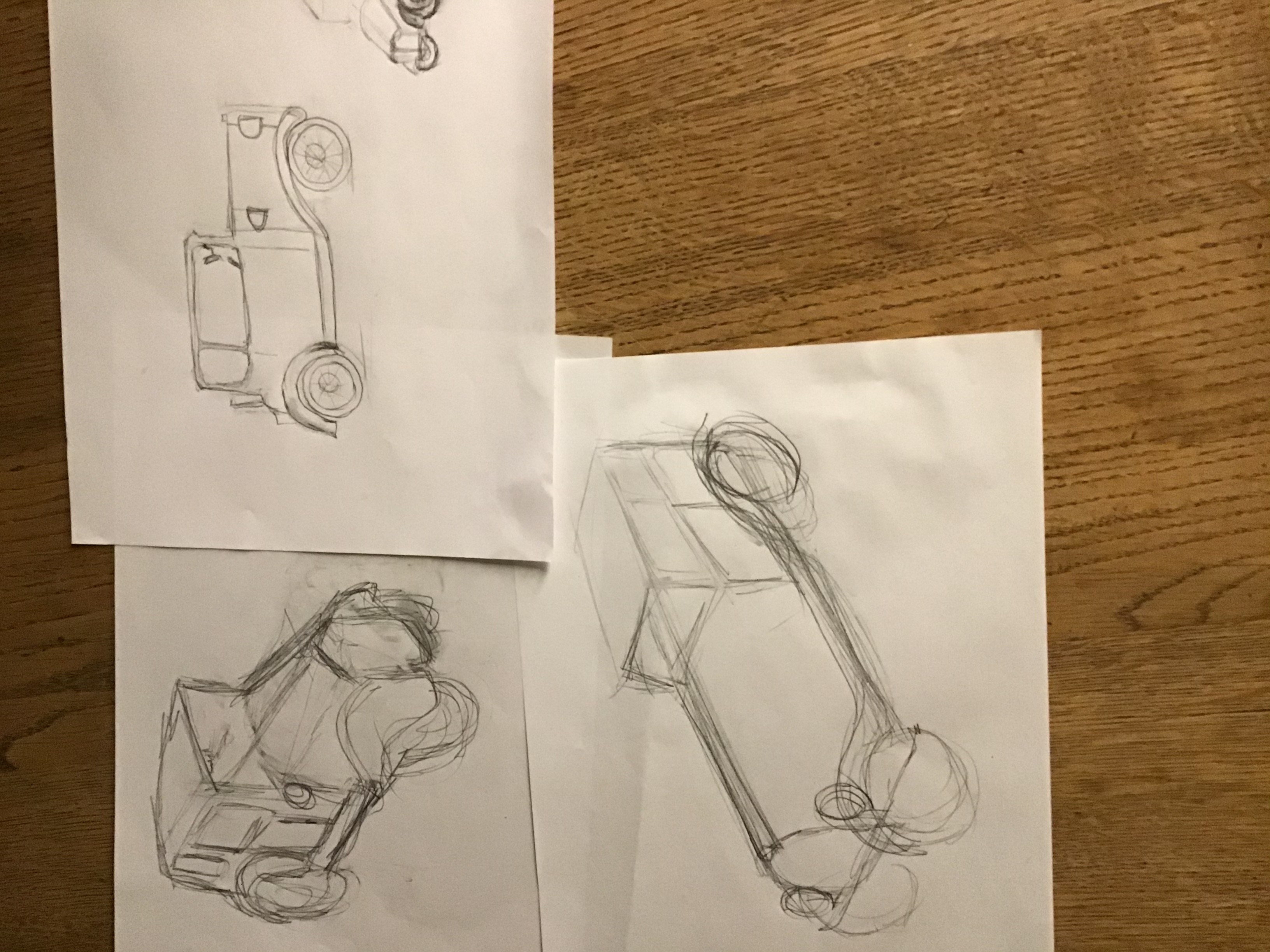J'ai l'impression que tu as un peu brûlé les étapes en essayant tout de suite de faire des vues en volume (qui ne sont pas obligatoires pour cet exercice) au lieu de te concentrer sur les schématisations 2D. Ca manque d'une vue de face et pourquoi pas d'une vue du dessus !