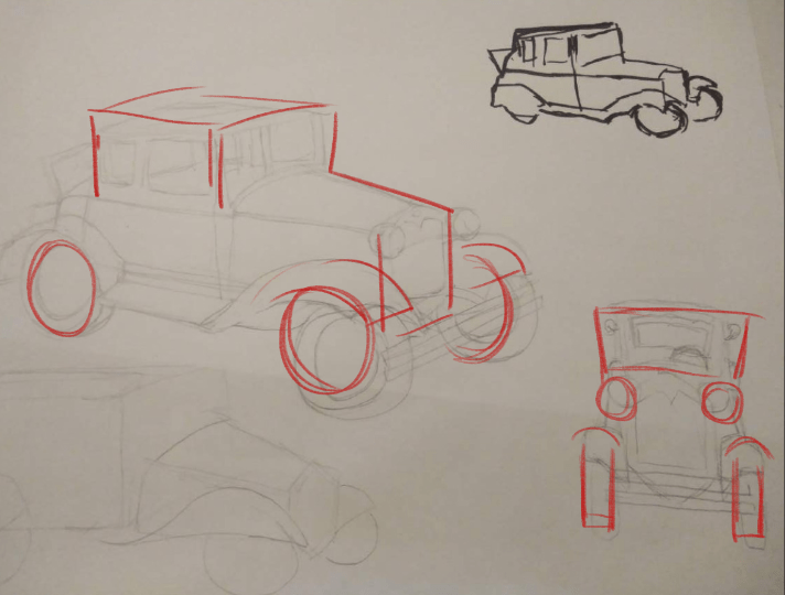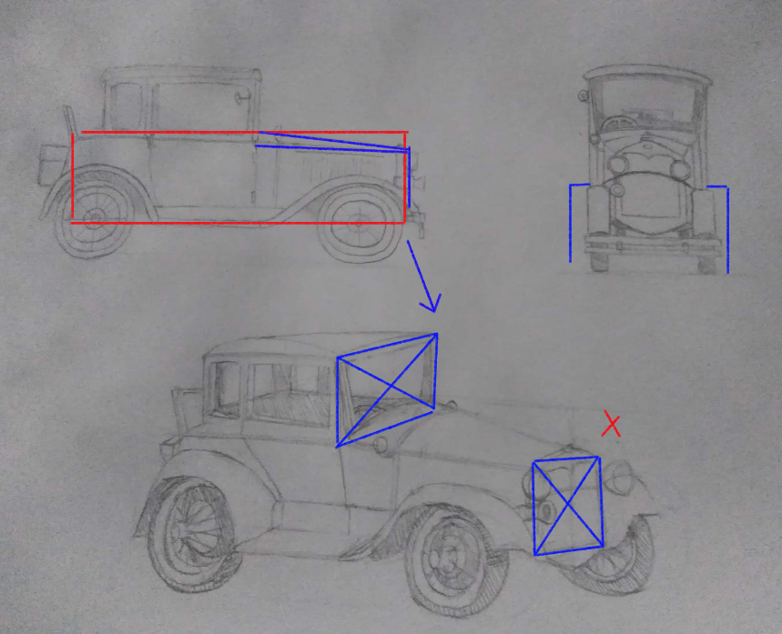 Pour la vue en volume... Mh ça se corse ! Dans son état actuel, ta voiture semble tordue. Le nez de la voiture semble vu plus de face que le pare-brise (je t'ai mis ça en avant en surlignant les plans sur ton dessin). Ce que je te conseille si tu as le courage de réessayer/corriger, c'est de d'abord dessiner un pavé en volume bien droit et ensuite seulement venir "tailler" dedans pour trouver la forme du nez de la voiture qui est un peu en biseau. J'ai l'impression que c'est cette forme un peu particulière qui te pose problème et tu n'arrives pas à trouver le bon angle pour tes traits..?