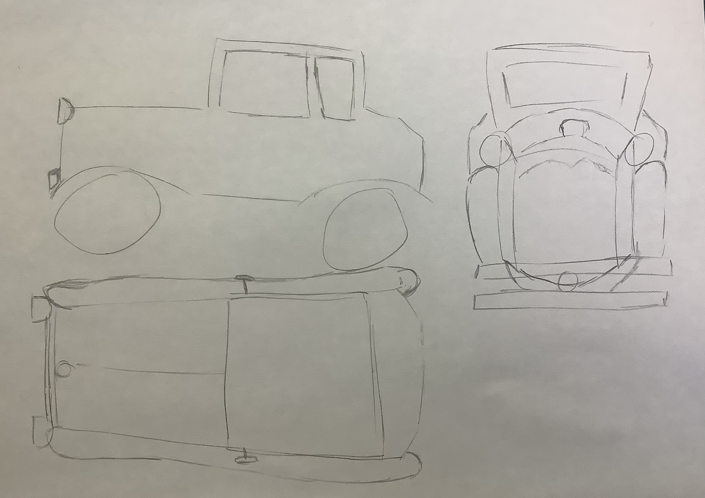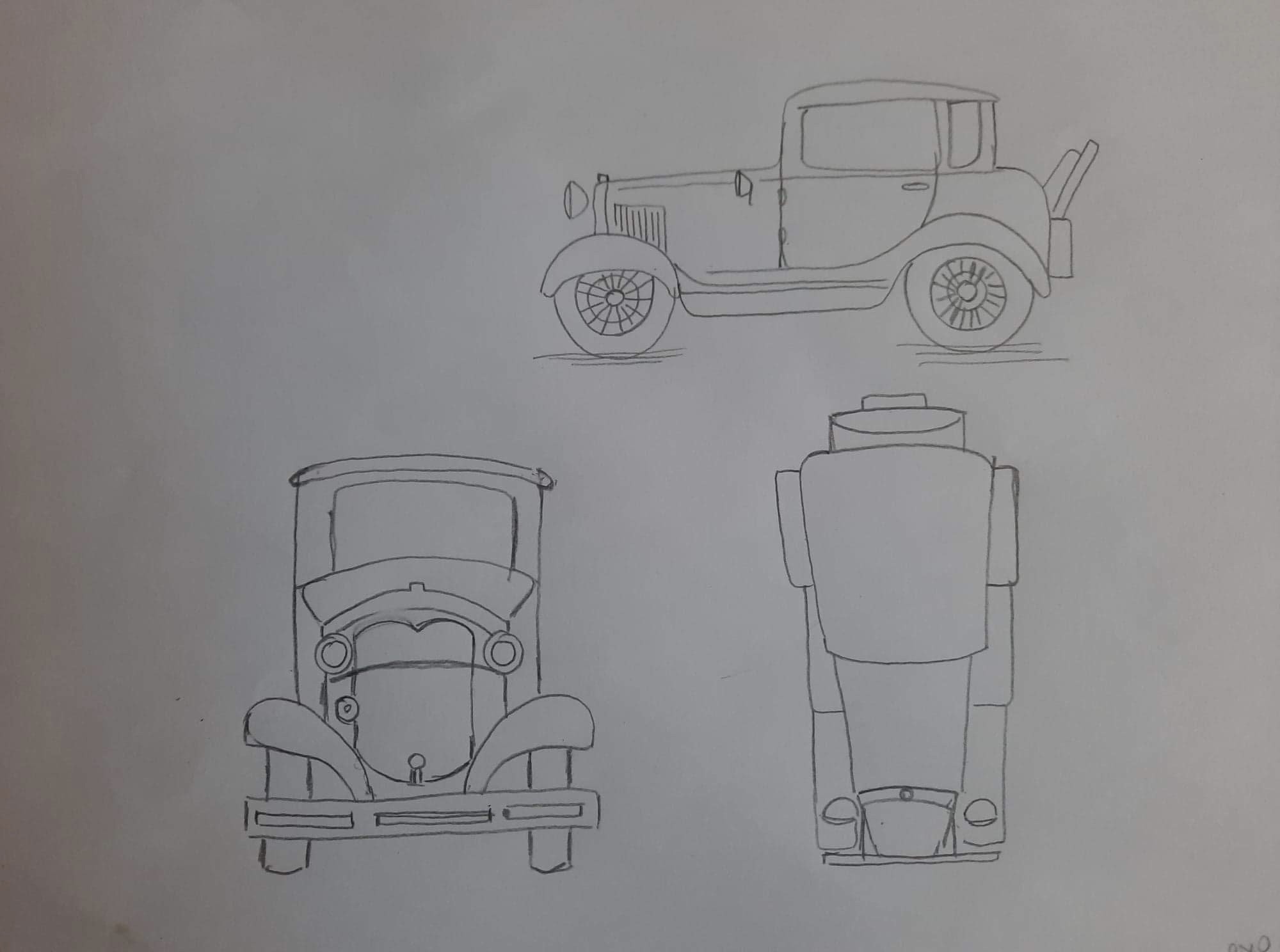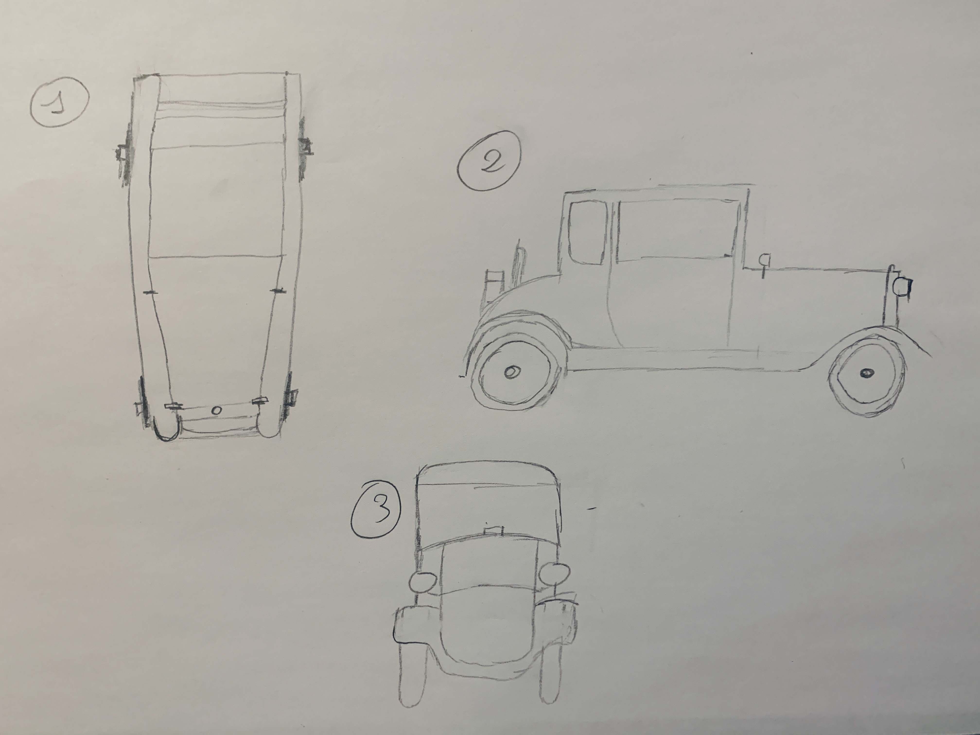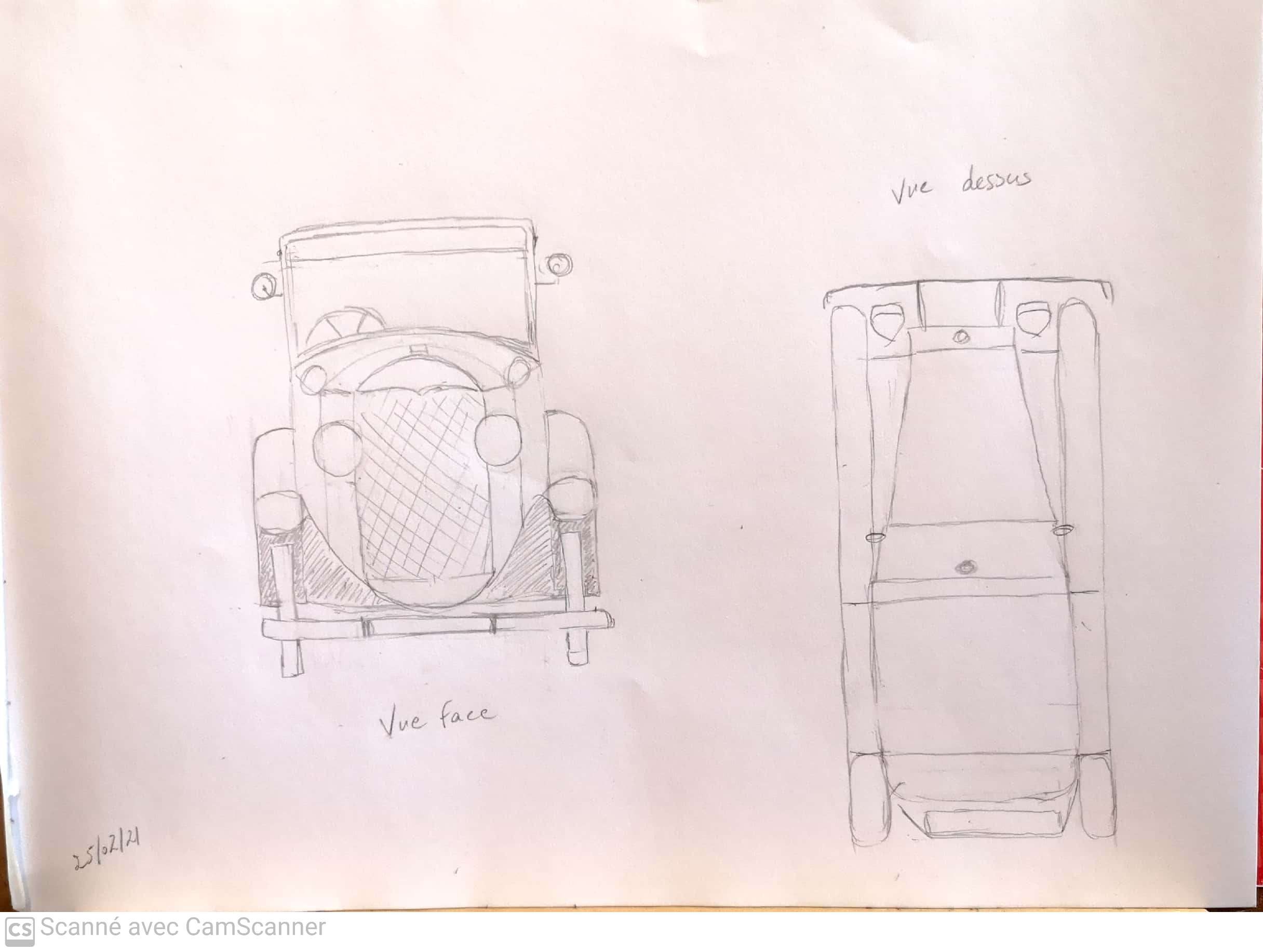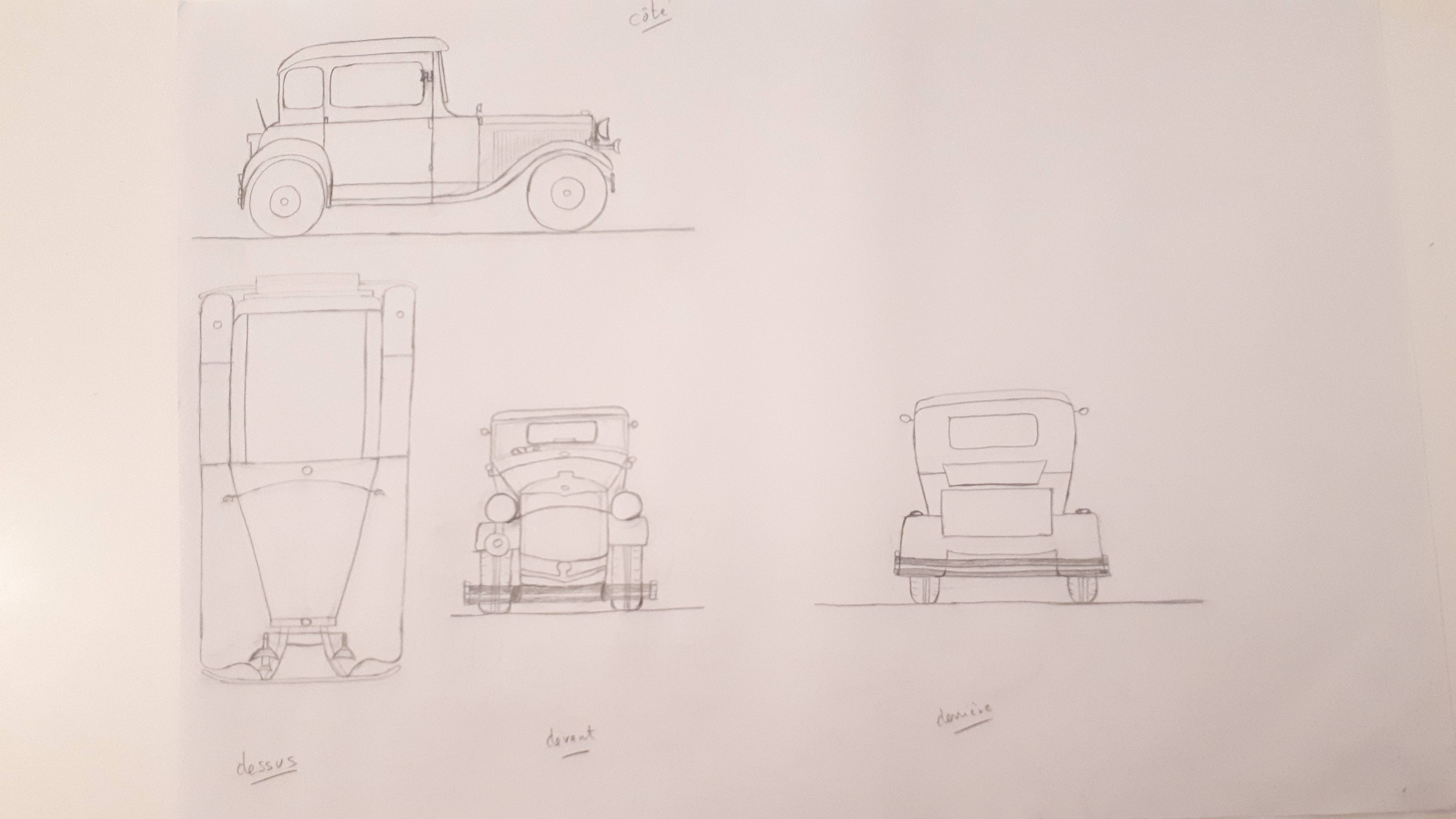 Voici mes croquis pour la voiture, de face, de haut et de profil.