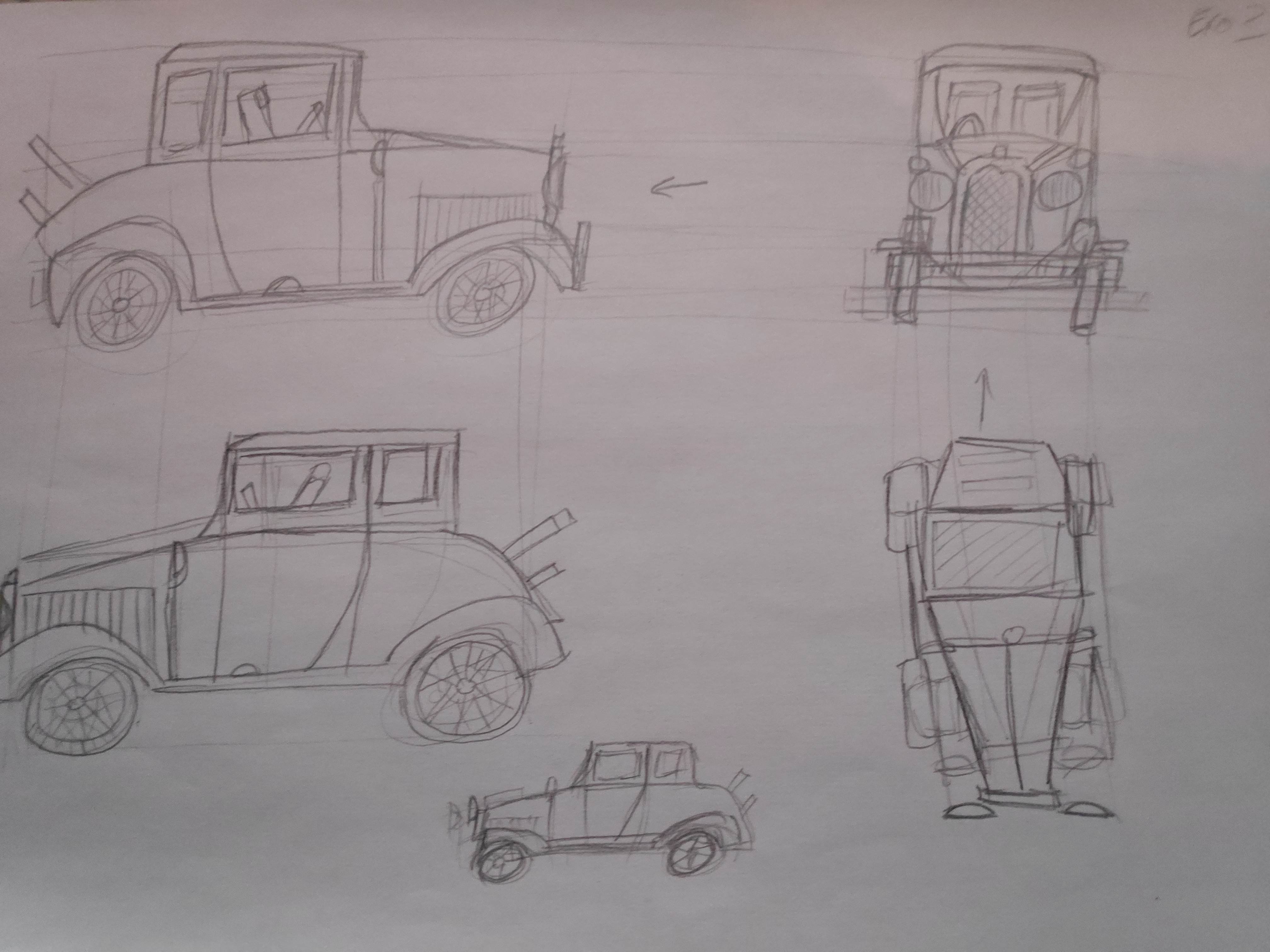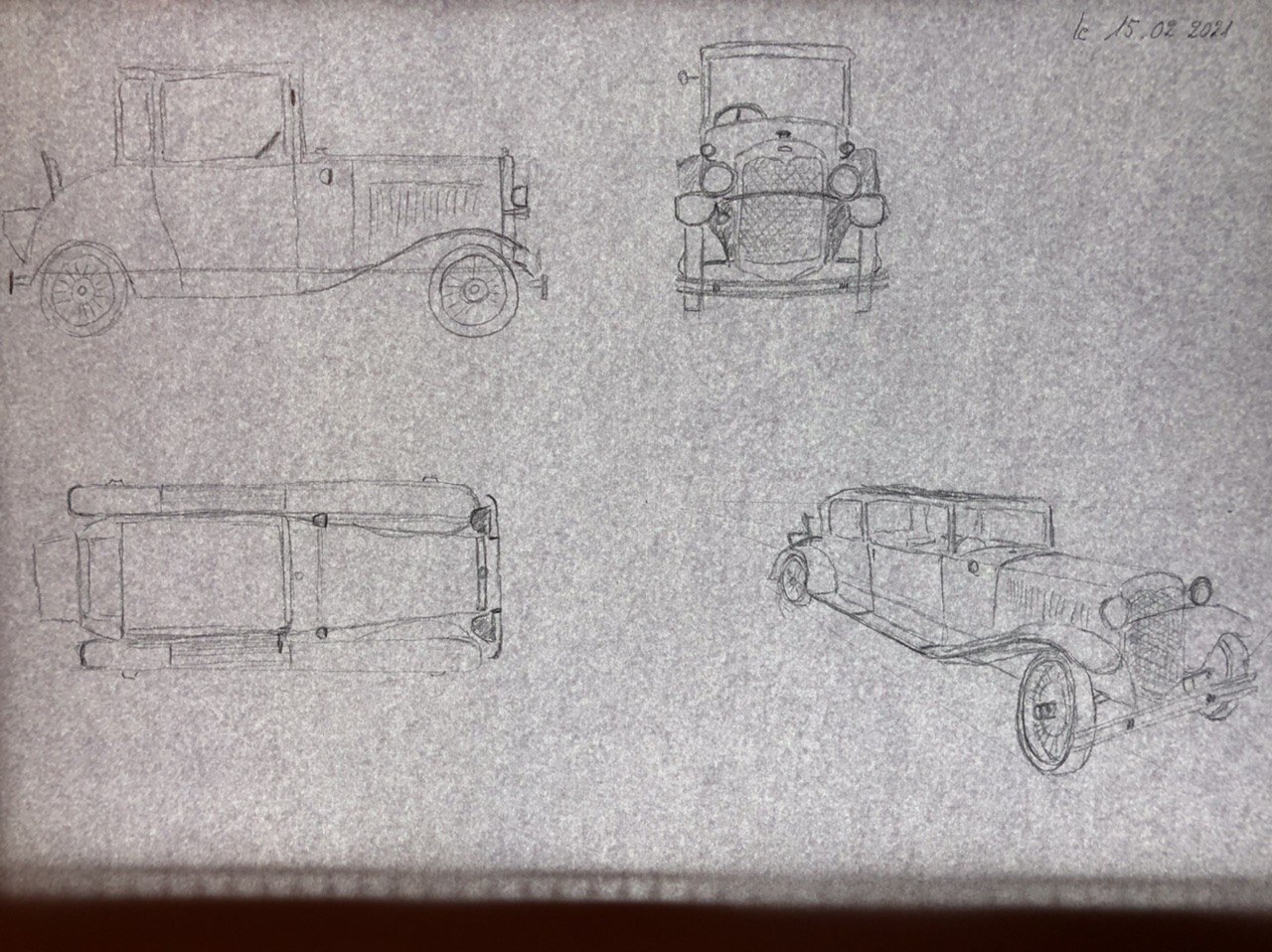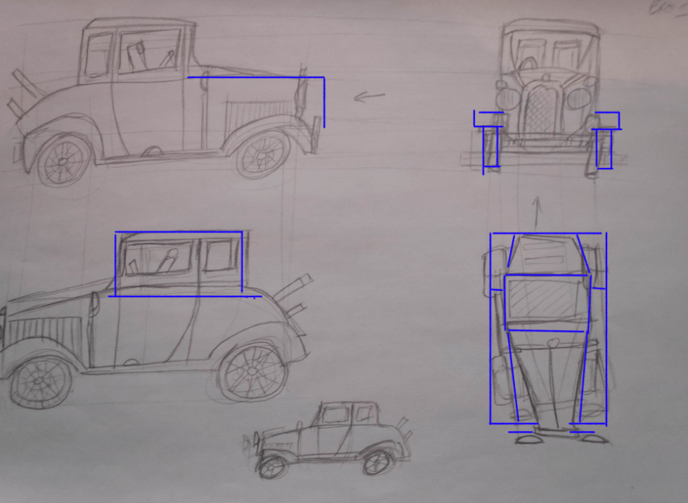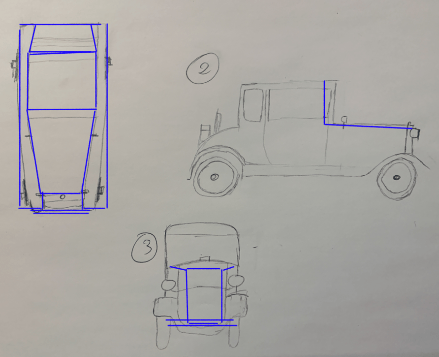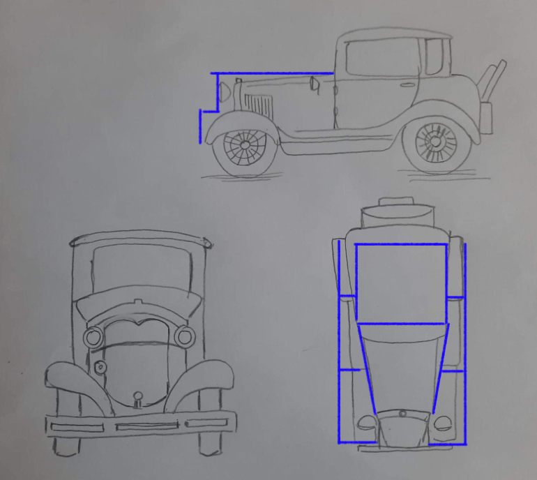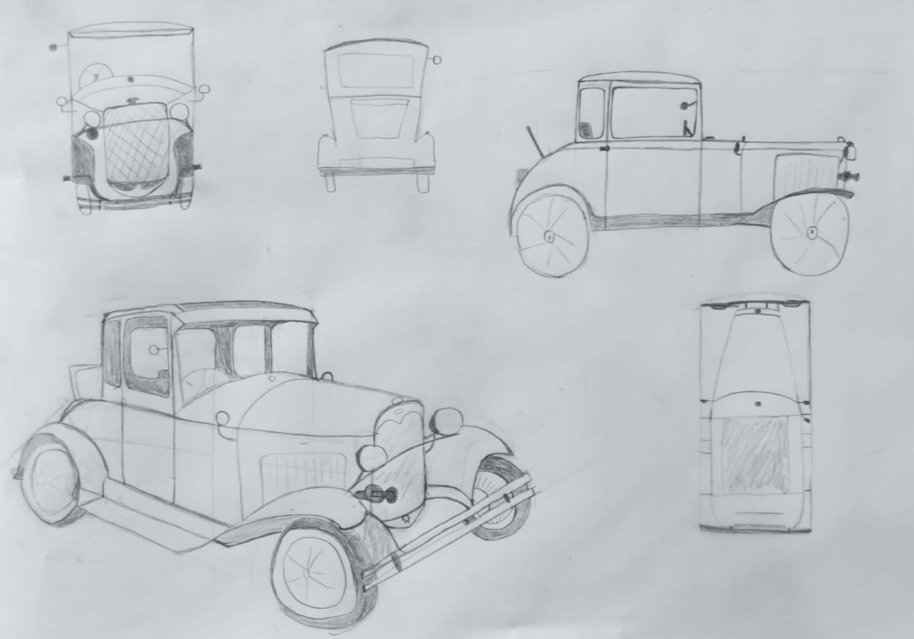 Voici mes croquis pour la voiture, de face, de haut et de profil.