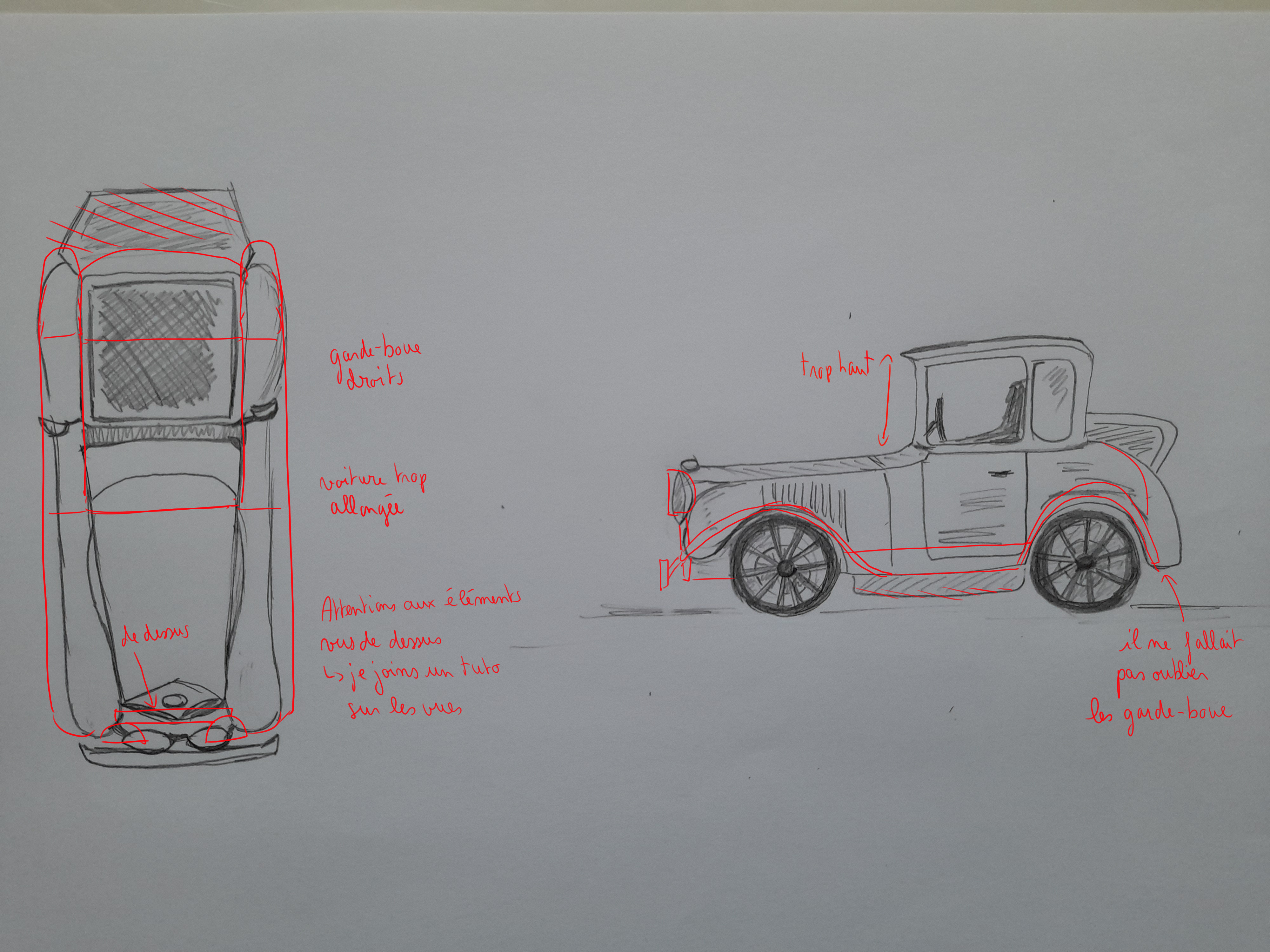 Bonjour Casha, Ta vue de dessus est top, par contre tu as un peu trop déformé la voiture dans ta vue de face et de profil. Voici ma correction dessinée ^^