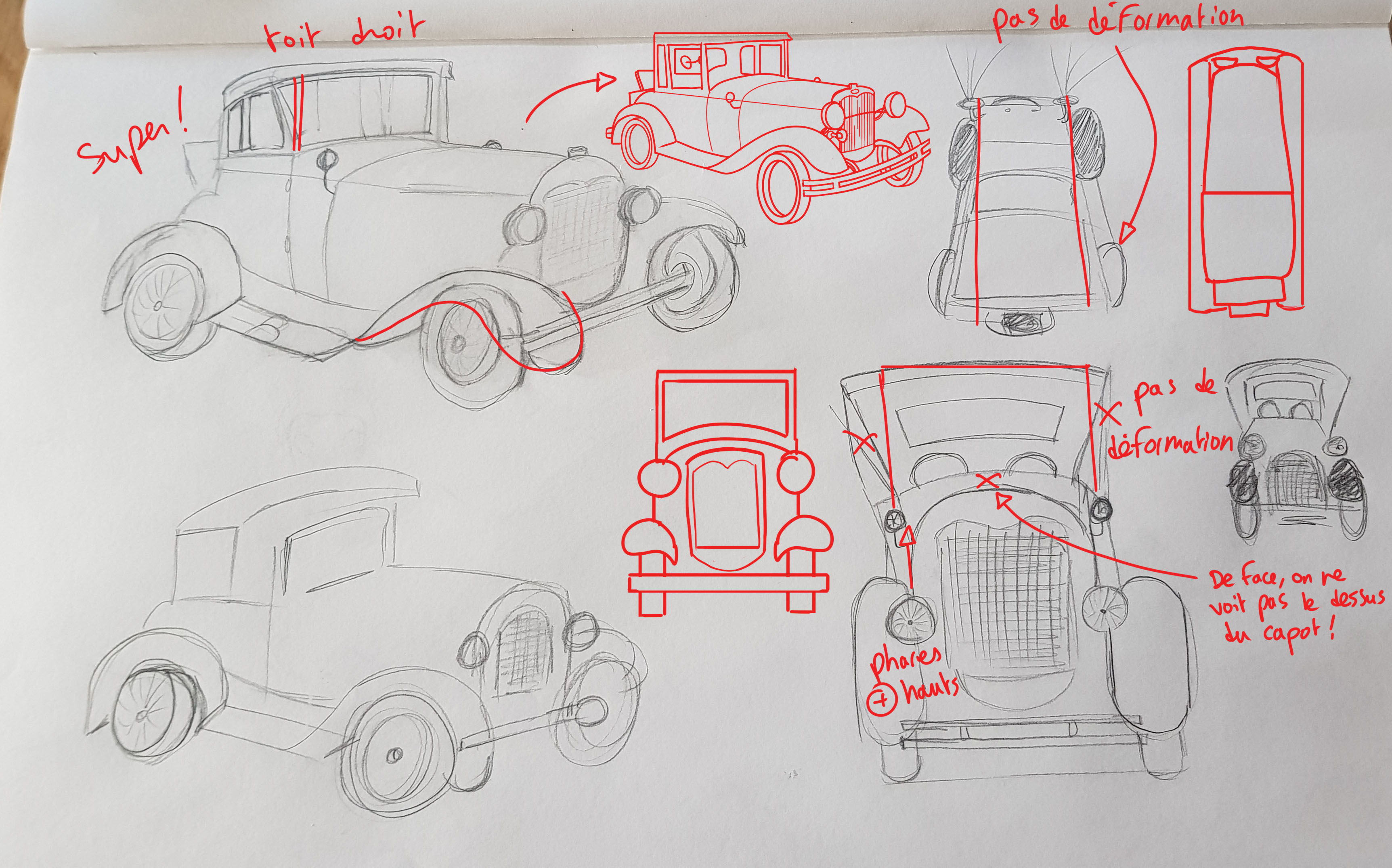 Bonjour Mysto, Oui ta planche est bien une planche d'études, puisque tu as cherché à représenter la voiture sous différents angles :) Cependant, tu as quelques petites déformations. Voici ma correction dessinée pour que tu comprennes mieux :) Ta vue de 3/4 est vraiment bien !