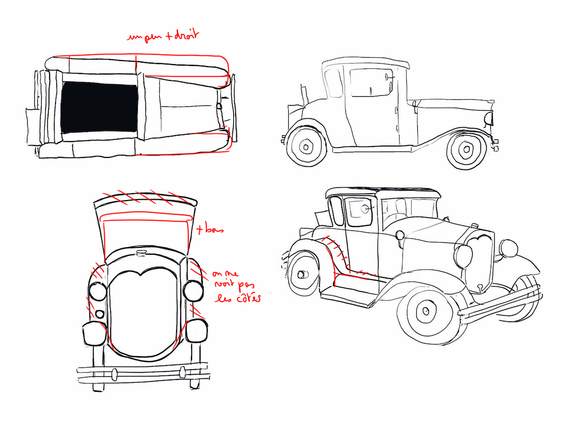 Super, c'est très bien! Je t'ai mis mes correctifs en images. Pour la vue du dessus, c'est du détail car tu as bien visualisé les formes et leur emplacement. C'est plus sur la vue de face où il y a quelques petites erreurs, notamment la position des gardes-boues qui doit être plus écartée sur les côtés.