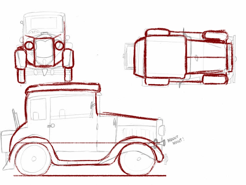 Hello Nouswel, je comprends ce n'est pas toujours évident avec des sujets plus complexes, surtout au début! Mais ça va venir, le bute de ces exercices est justement d'exercer son oeil, et d'apprendre à décomposer un objet en formes simples. Et ça va, tu ne t'es pas mal débrouillé, surtout la vue de profil il où il n'y a que de légers ajustements à revoir. Pour la vue de dessus, tu as fort comprimé les éléments. Tu peux visualiser le haut de l'habitacle sous la forme simple d'un carré, et le capot d'un rectangle partant bien vers l'avant. N'oublie pas les gardes boues bien placés sur les côtés, sur tes autres vues aussi, tu as eu tendance à fort les coller contre le capot. Voit les différents éléments séparément les uns des autres et comment ils s'ajustent les uns aux autres, un peu comme un jeu de construction, si cela peut t'aider! ^^