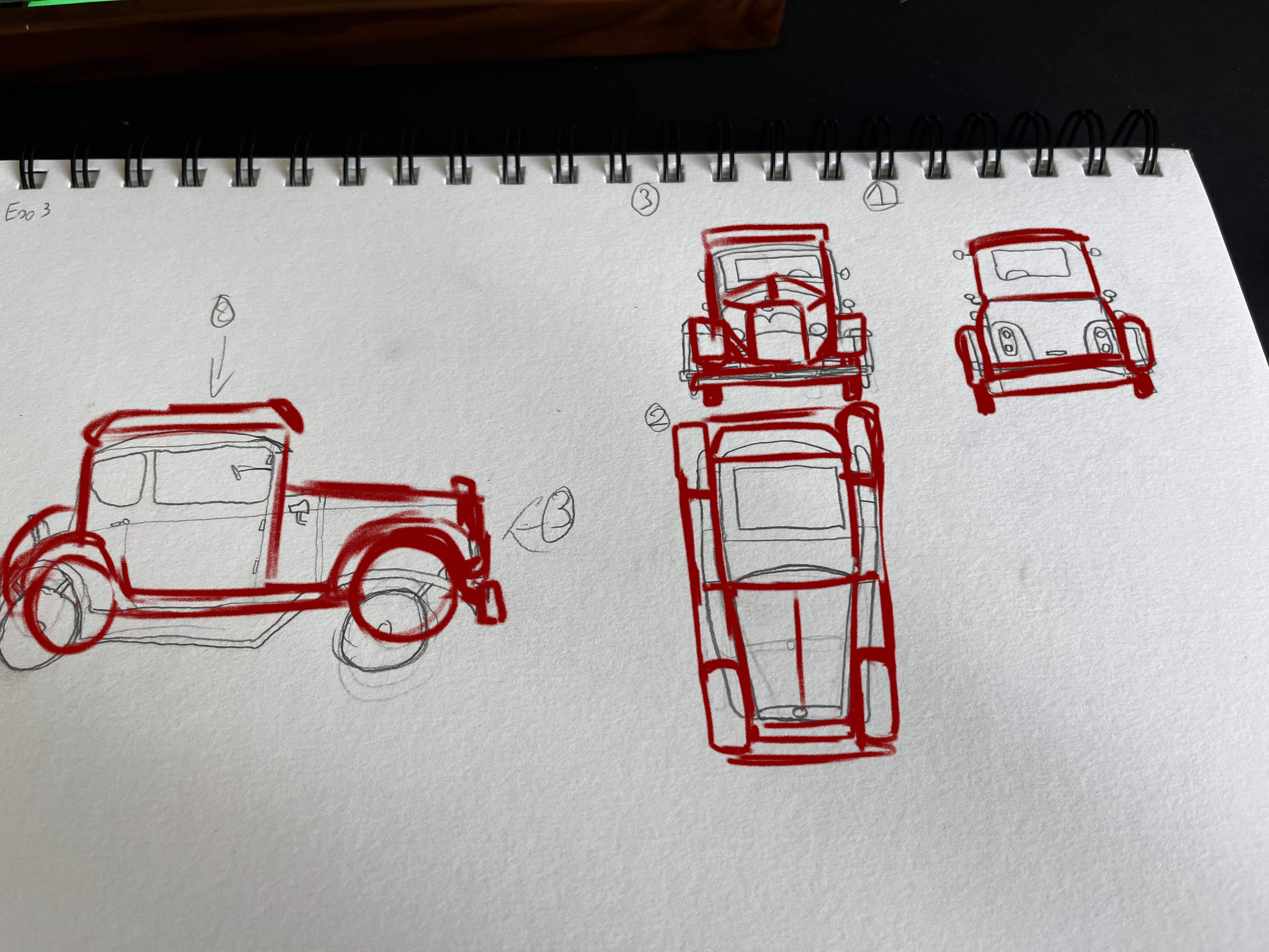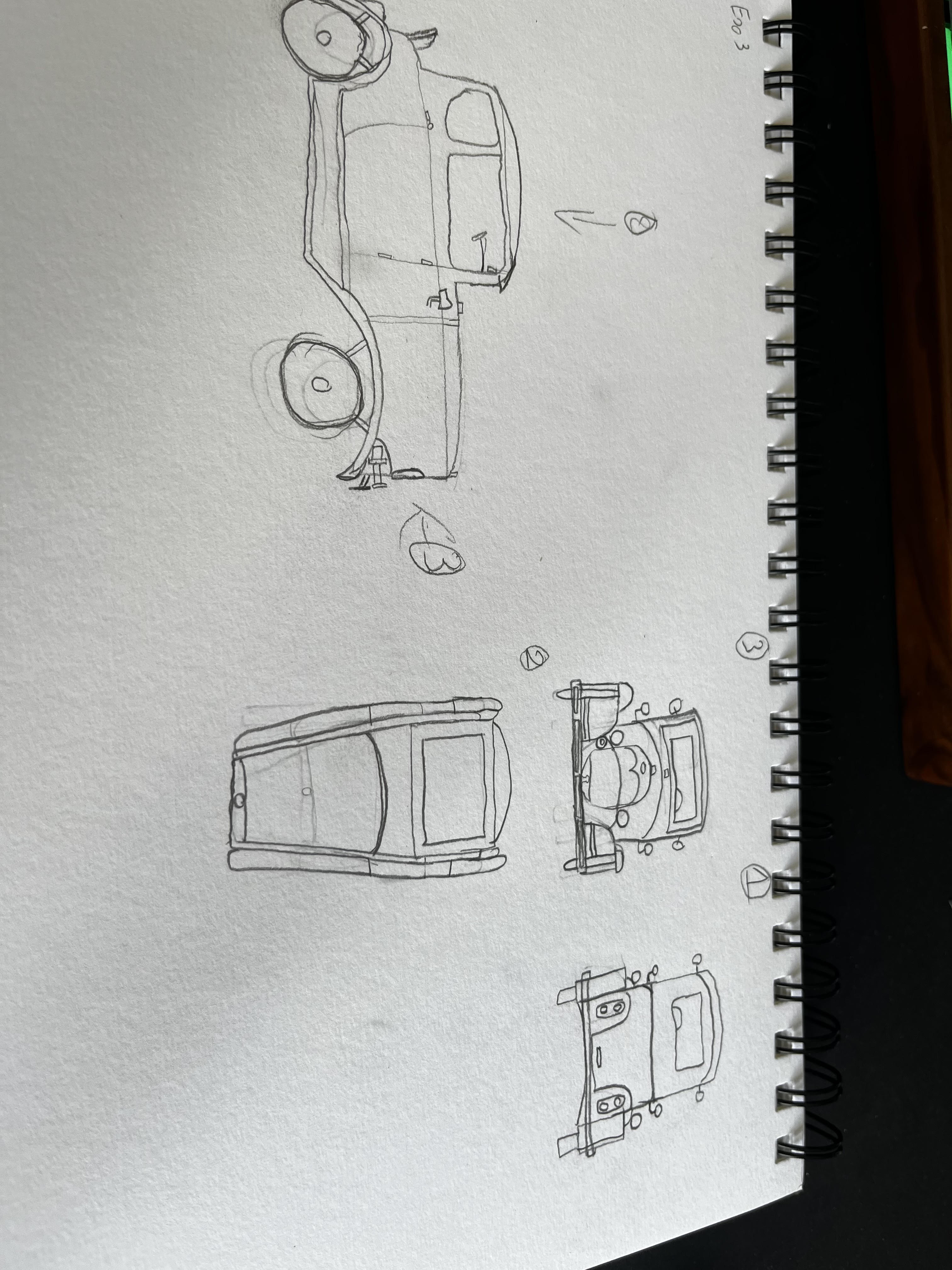 Bonsoir Asturias, c'est très bien! Alors effectivement, il y a un petit souci de point de fuite sur les vues en perspectives, essaie de décomposer la voiture en formes simple pour te faciliter la tâche. Après, le but de l'exercice n'est pas de faire des représentations en perspective, et ton rendu peut tout à fait paraître "plat" et 2D, comme pour ta vue de dessus. Cette dernière a effectivement des petits problème de proportion, notamment le capot pas assez allongé, mais il y manque aussi un peu de détails sur les éléments (l'arrière avec le coffre, les marches pieds...). Essaie de varier les angles simple,( de face, de côté, de dos,) sans chercher à représenter le sujet en persdpective, mais plutôt en essayant de comprendre les différents éléments qui le compose. :)