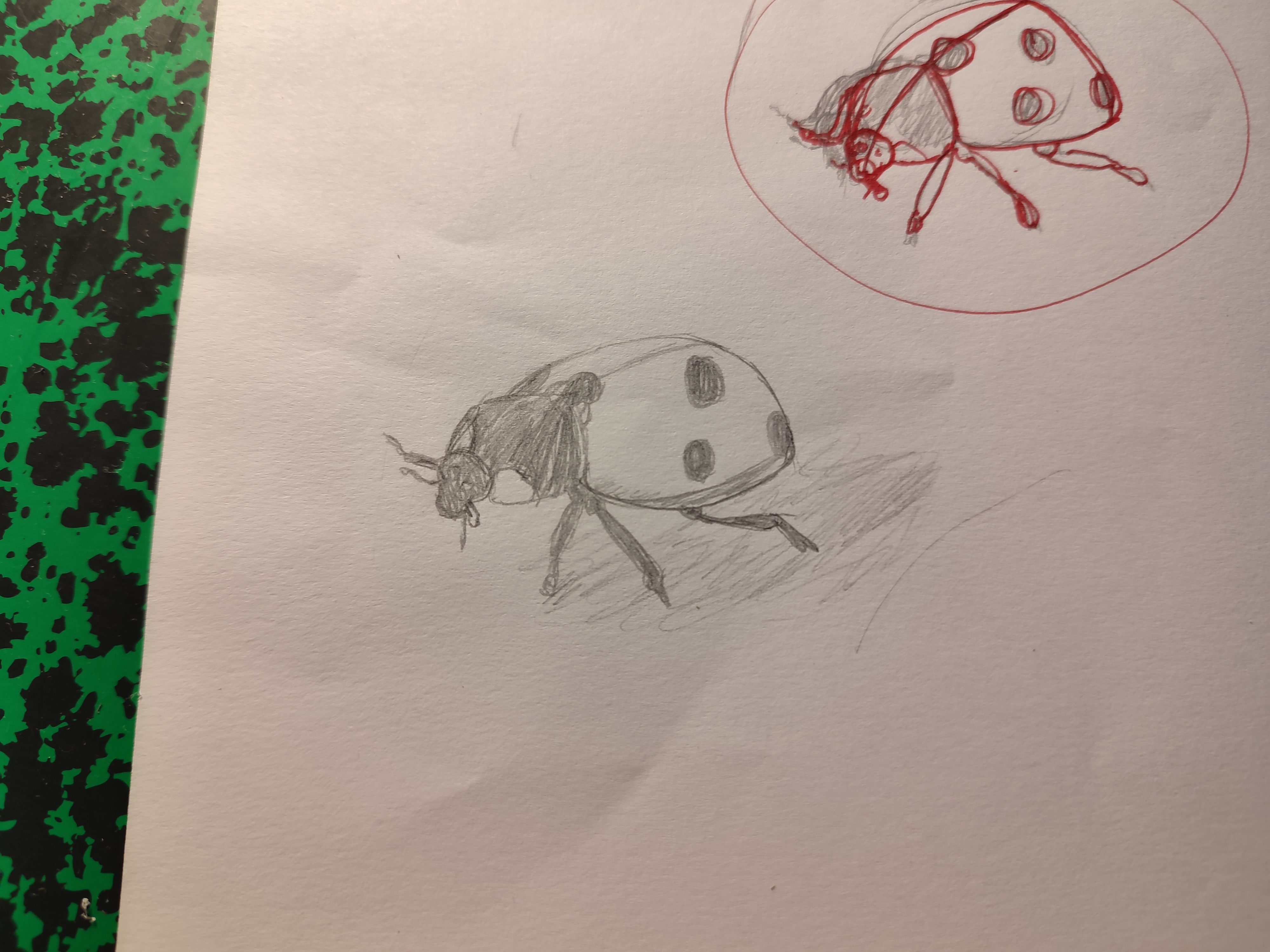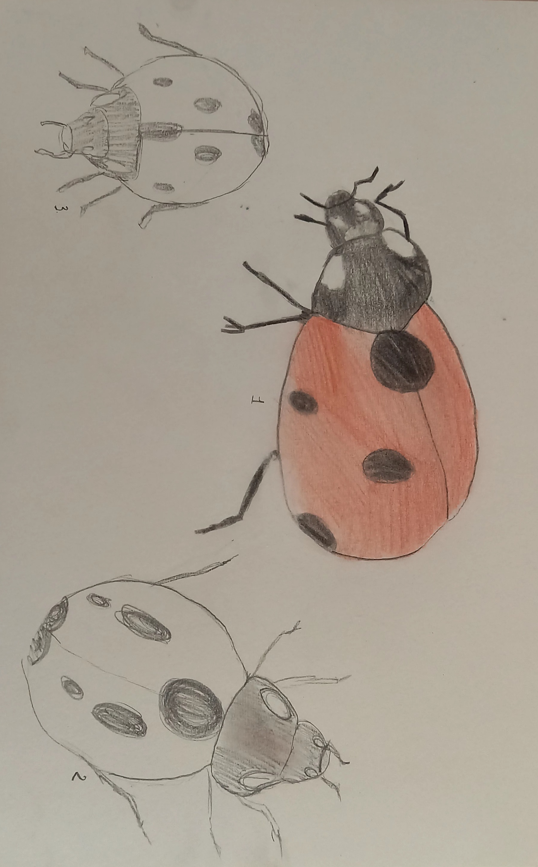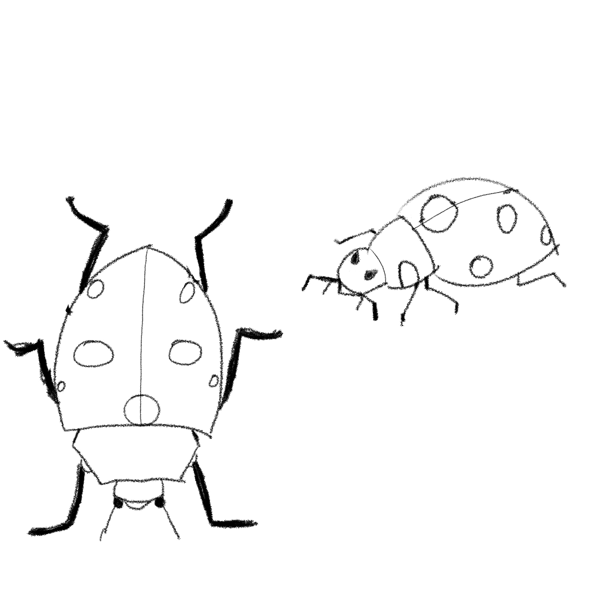 Le plus compliqué des trois a pour moi été la coccinelle (surtout au niveau de la tête où j'ai vraiment bloqué pendant plusieurs heures en gommant et en réessayant (dessin sur Procreate avec stylet) et ce résultat a été le seul qui m'a a peu près convenu en terme de proportion (pas du tout réaliste je le conçois mais je n'ai pas réussi à faire mieux ...)