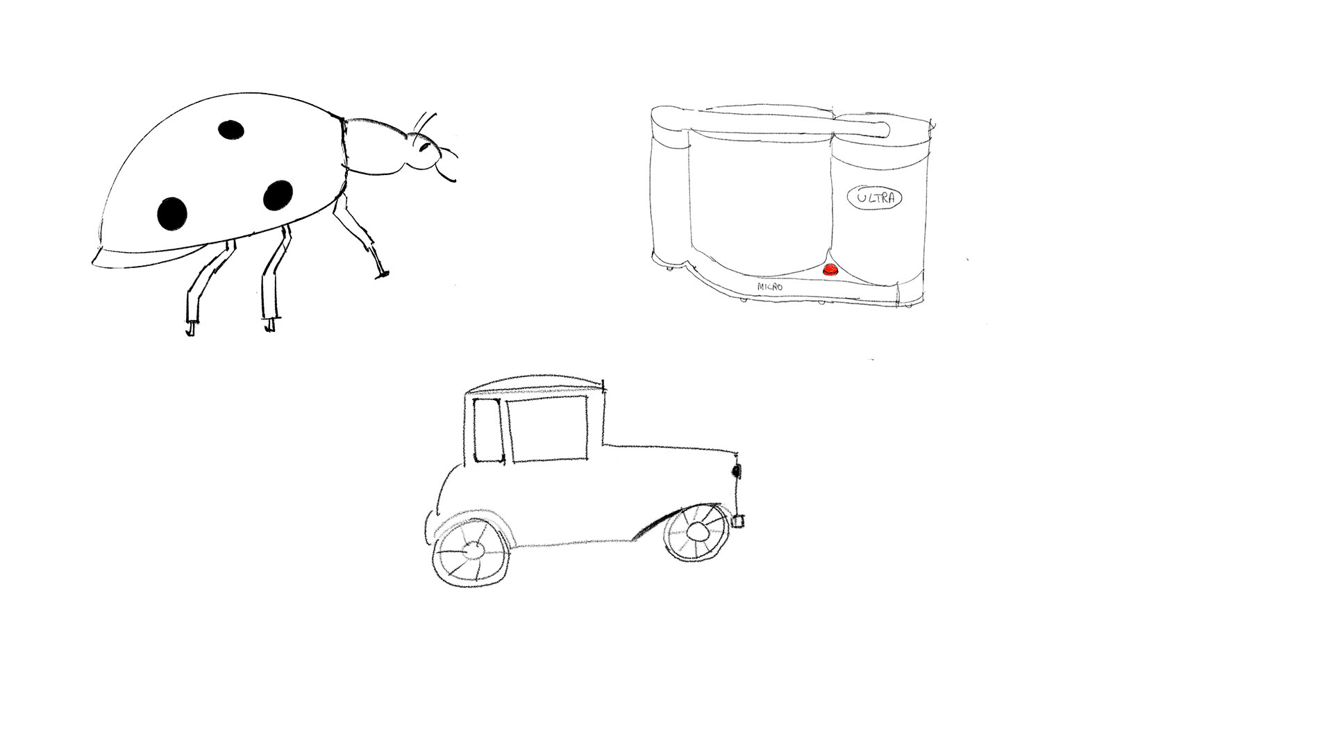 Je pensais au début que dessiner la coccinelle serait plus simple que la voiture et le mixeur mais je me rends compte qu'il n'est pas simple de représenter les différentes parties avec la bonne taille j'ai dû m'y reprendre a plusieurs fois.