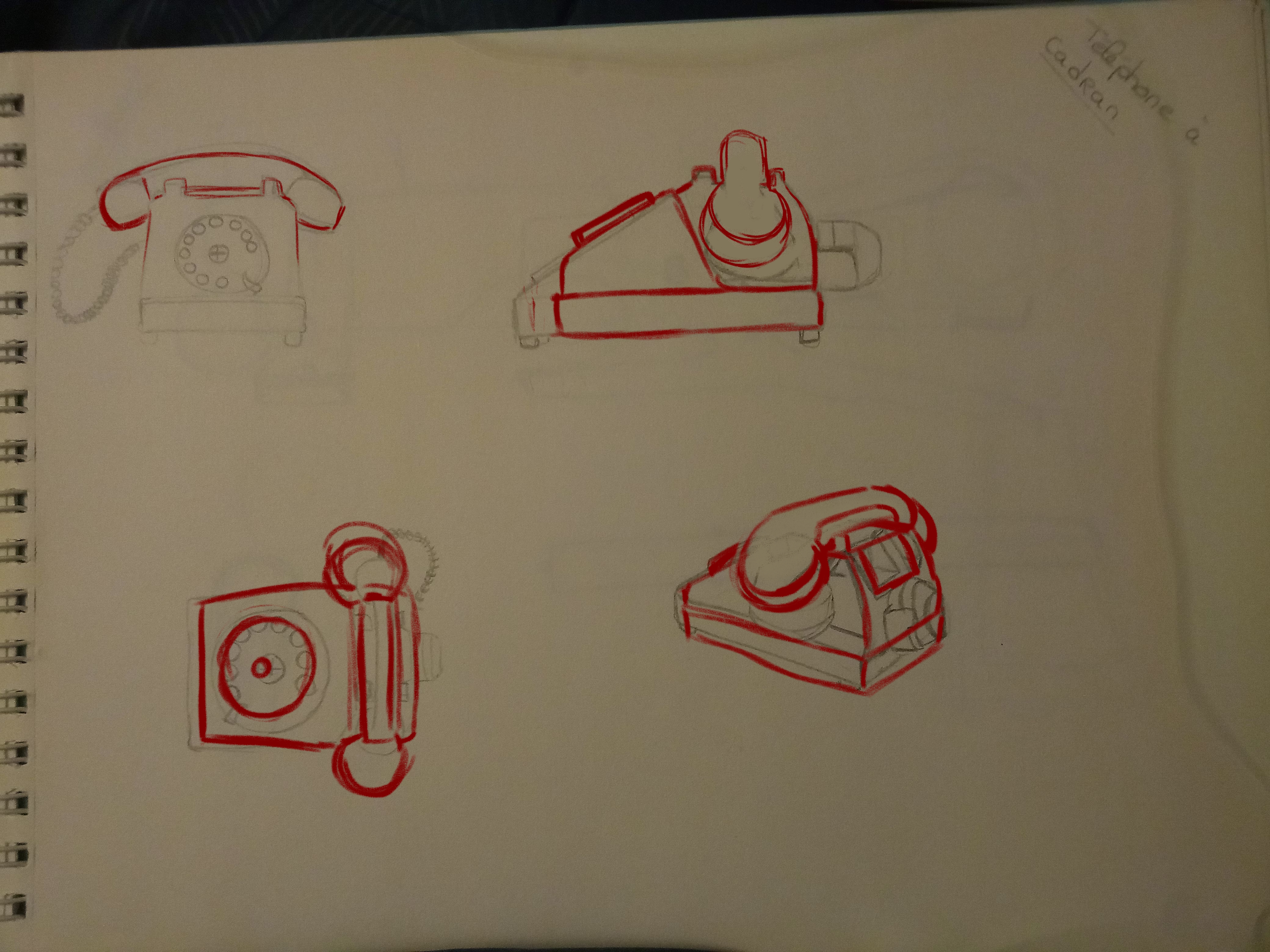Bonjour Doudoud27, rien de tel que de suivre son inspiration! Et puis les vieux téléphones à cadran son vraiment cool à dessiner! Bon je n'ai pas ton modèle pour faire une comparaison avec ton étude, globalement je trouve que c'est du bon boulot! Je trouve juste le combiné un poil trop petit et pas toujours placé sur le téléphone. Attention sur la vue de dessus, il doit y avoir une légère déformation sur l'avant avec le cadran à cause de la perspective. À part ça, rien à redire, bravo! 😀