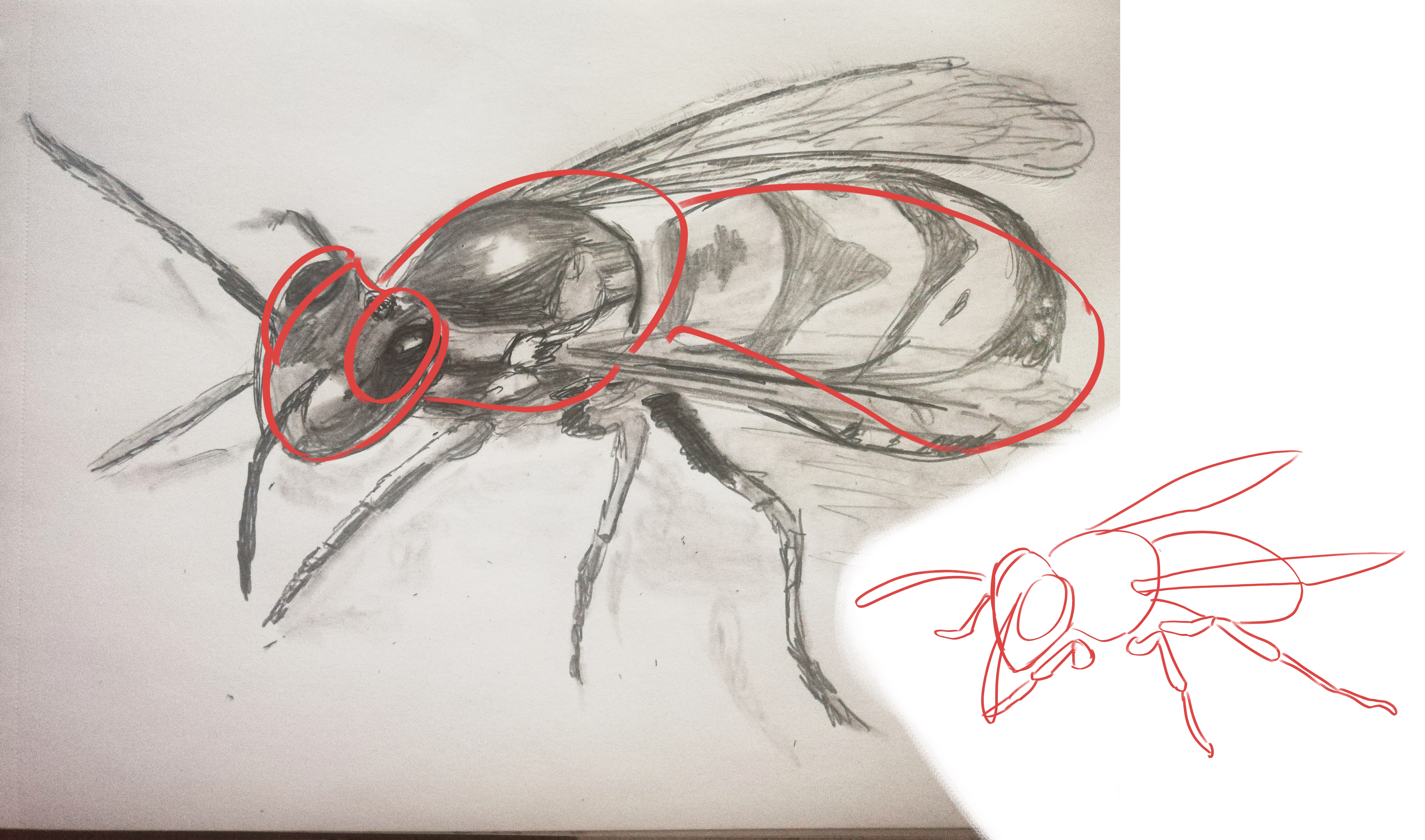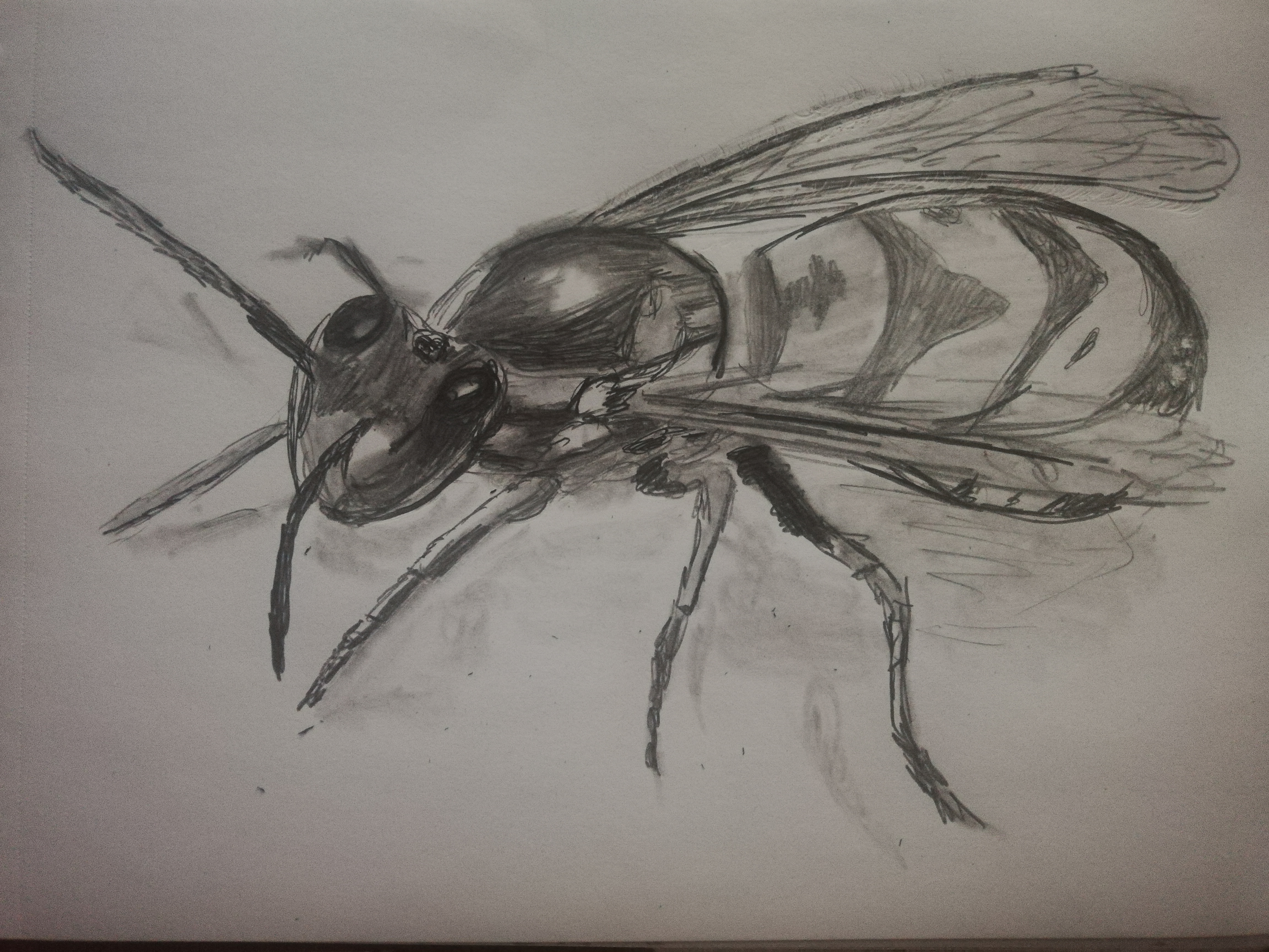 C'est vraiment pas mal !! Au niveau des proportions pour ressembler d'avnatge à une guêpe tu aurais pu accentuer d'avantage le volume du thorax et réduire le volume du corps à l'arriere. La dernière patte devrait également partir un peu plus vers l'arriere. Au niveau des ombrages c'est vraiment bien aussi :) N'hesite pas a bien travailler le volume de manière équivalente en jouant avec les valeurs même si c'est une zone clair, par exemple tu aurais d'av'atge ou travailler le côté arrondis du corps en mettant des petites ombres sur le bas :) Continue comme ça !! 👍