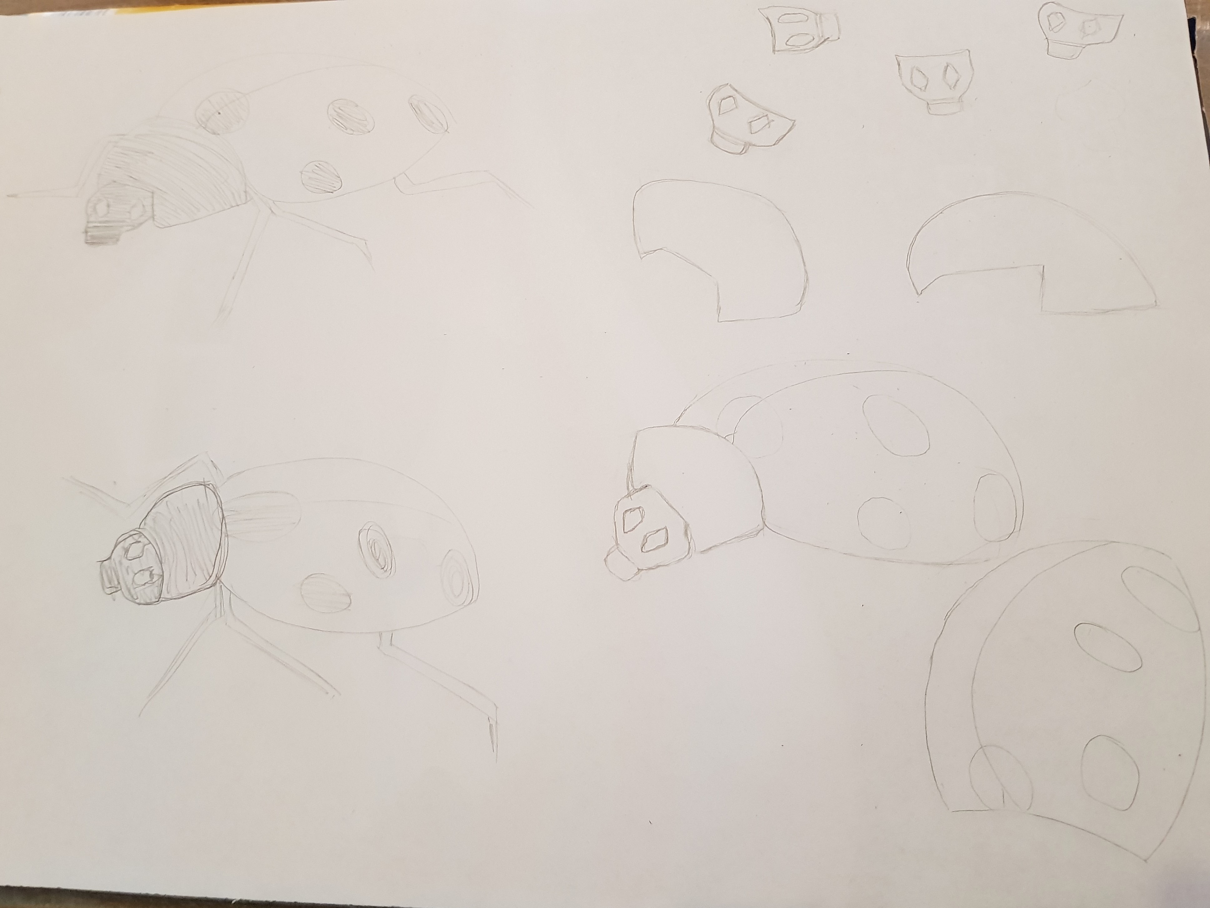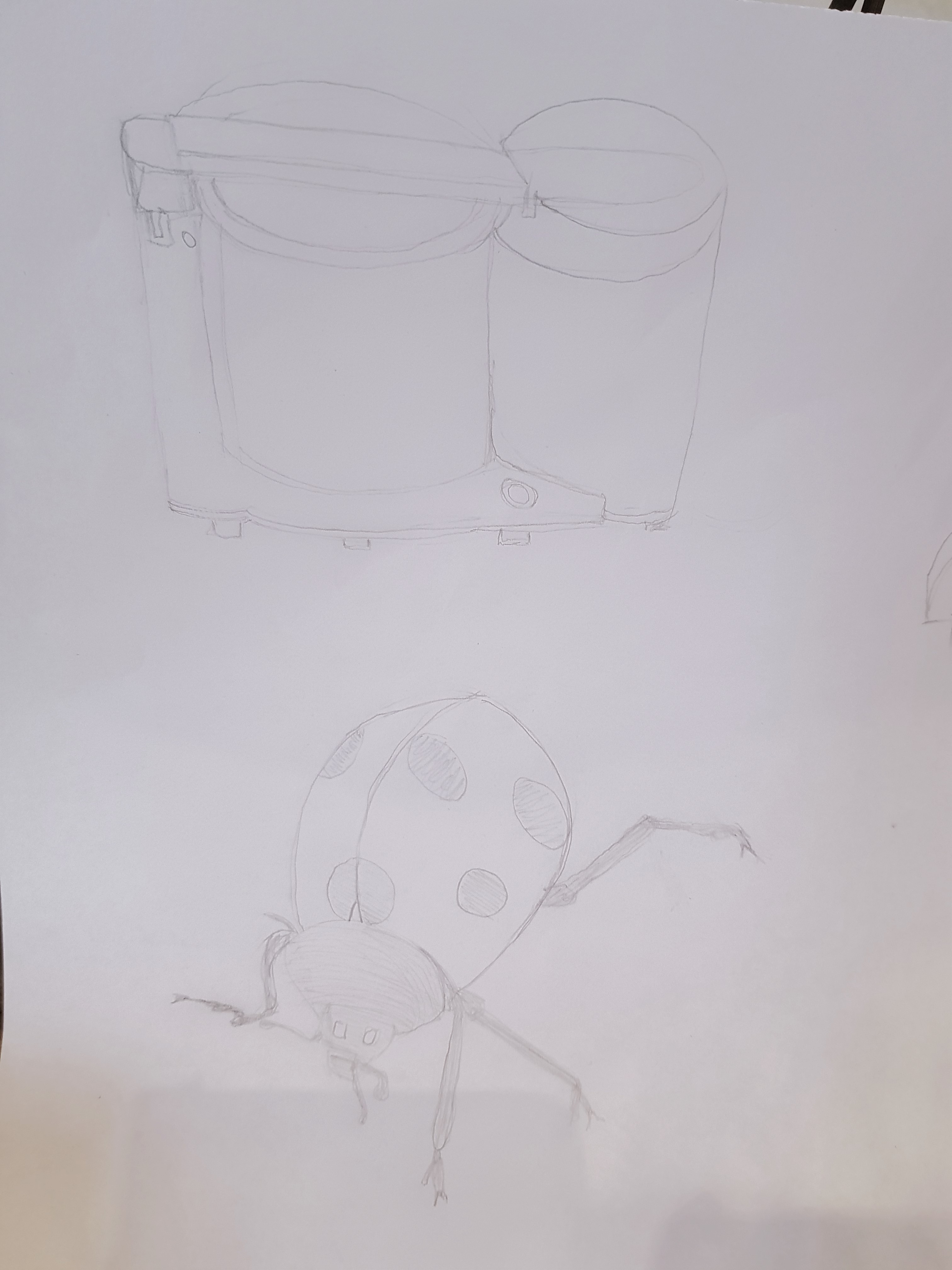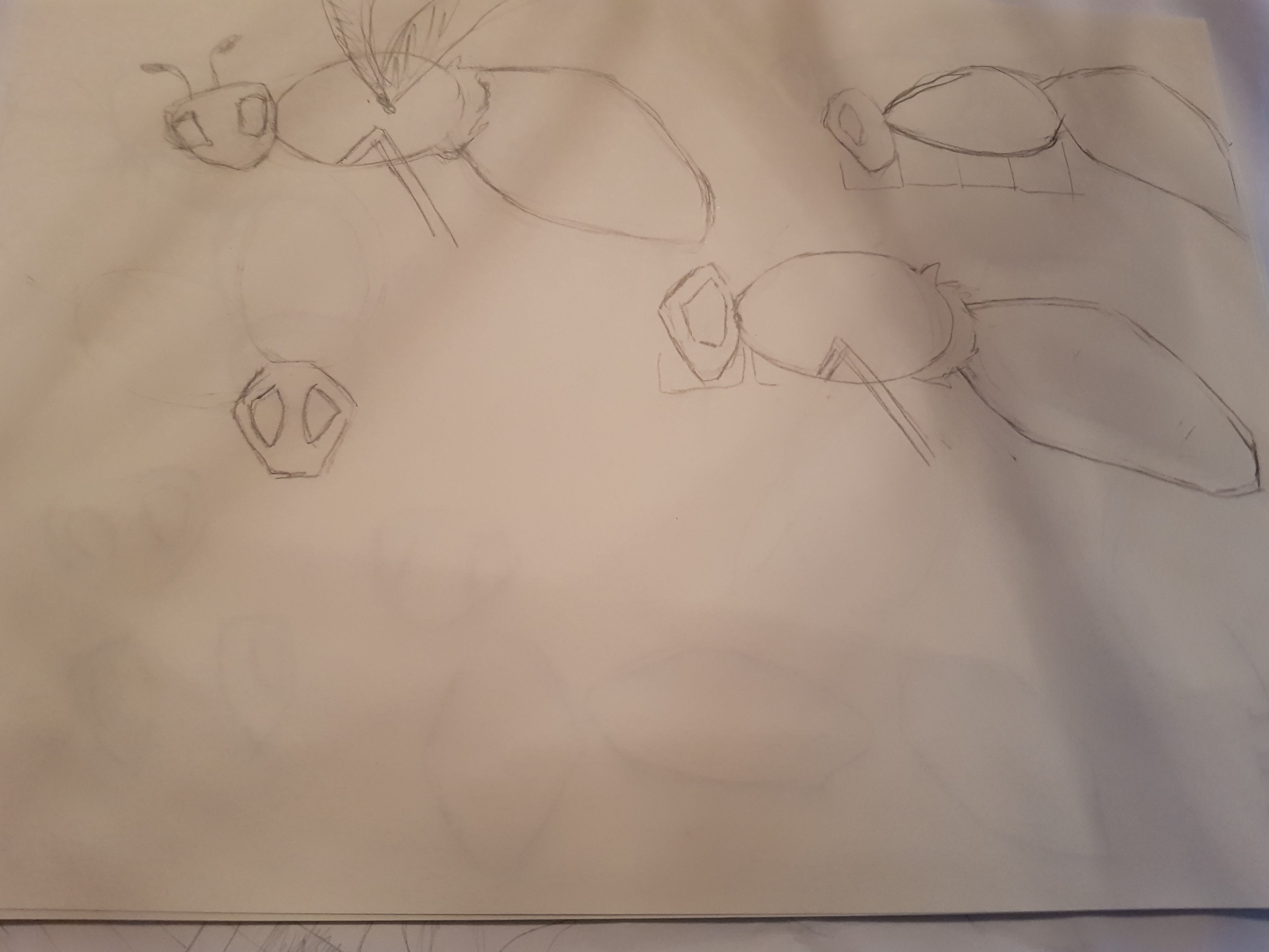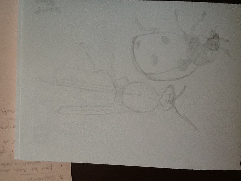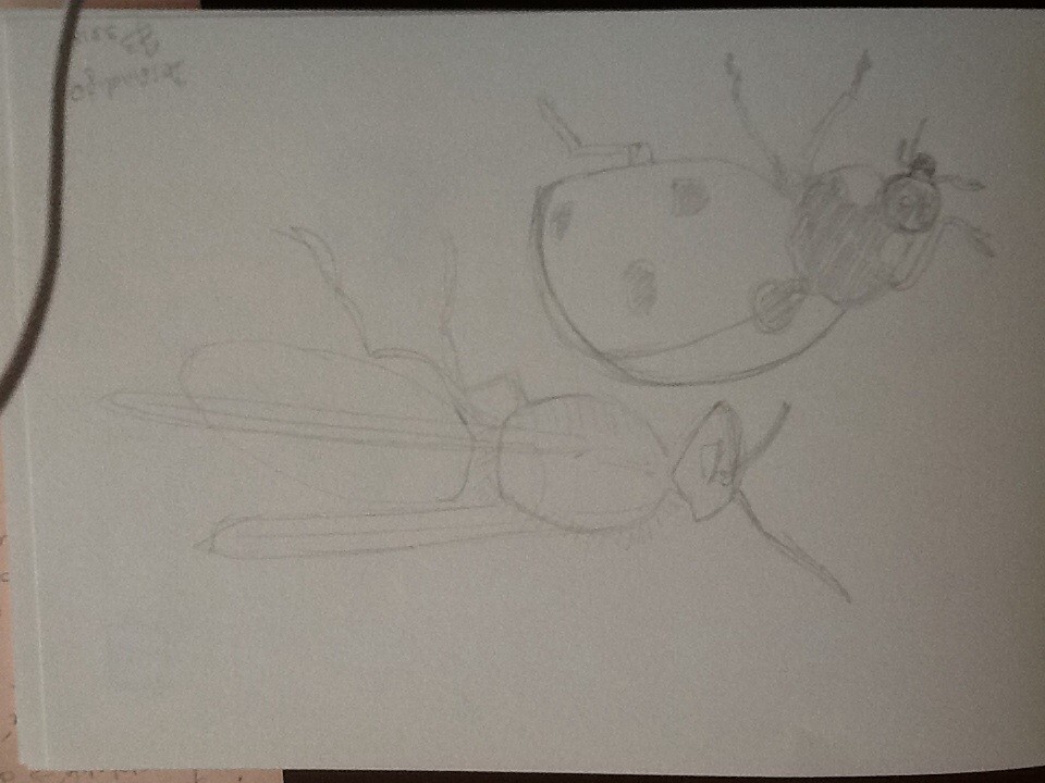 Sur la guêpe, j'ai vu que tu as commencé à la dessiner de face en bas à gauche. C'est la bonne marche à suivre ! Essaie de terminer cette vue, puis de tenter de la dessiner en vue de dessus par exemple. Puis reviens sur la coccinelle et fais de même. On a le cerveau qui chauffe quand on fait ça, mais c'est un bon exercice.