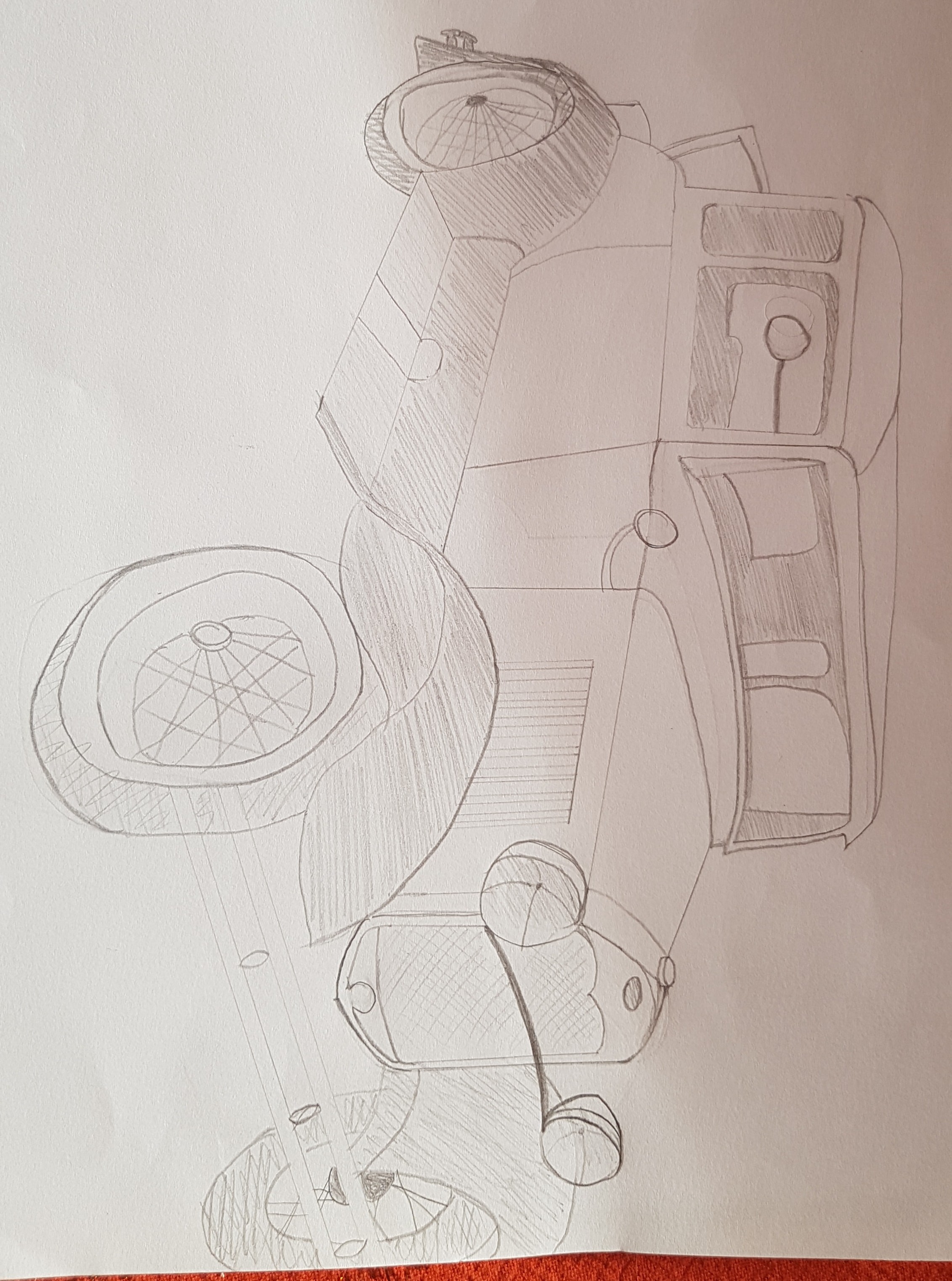 C'est bien que tu aies pris ton courage à deux mains pour dessiner la voiture : cela permet d'en faire un premier tour d'horizon. Mais ne te laisse pas impressionner par la difficulté apparente. Tu es capable de la dessiner sous plusieurs angles de vue. Essaie, pour voir !