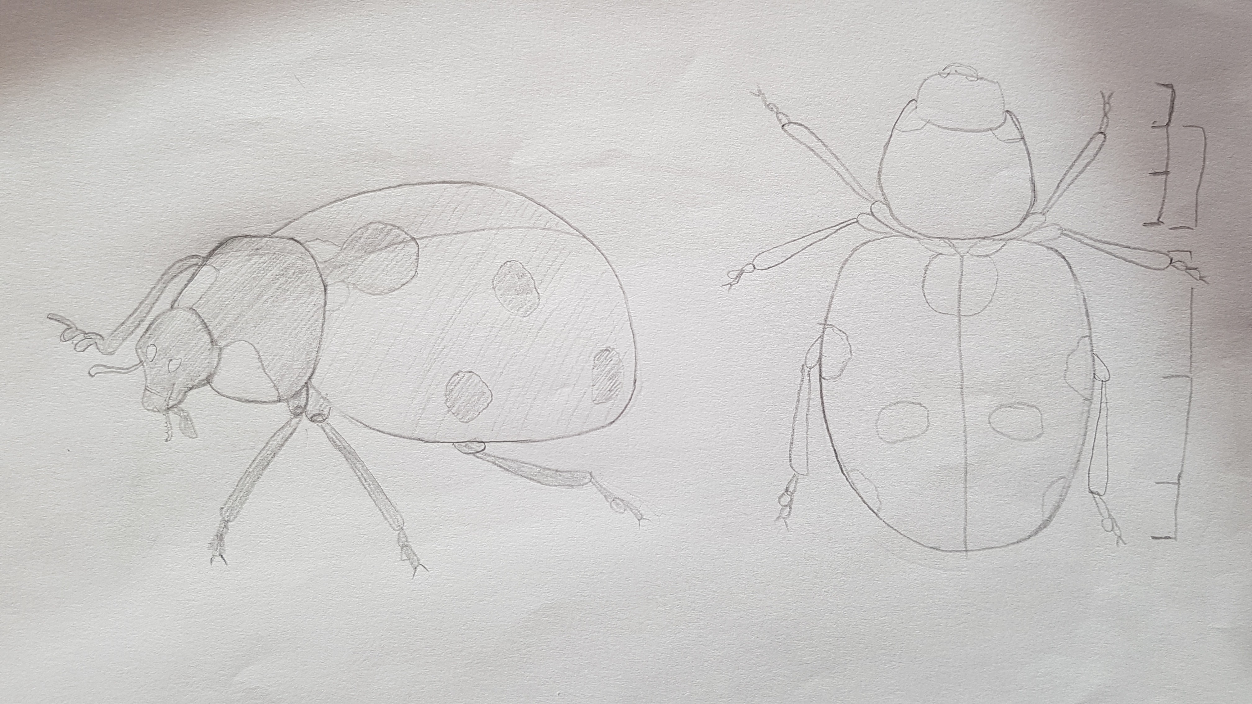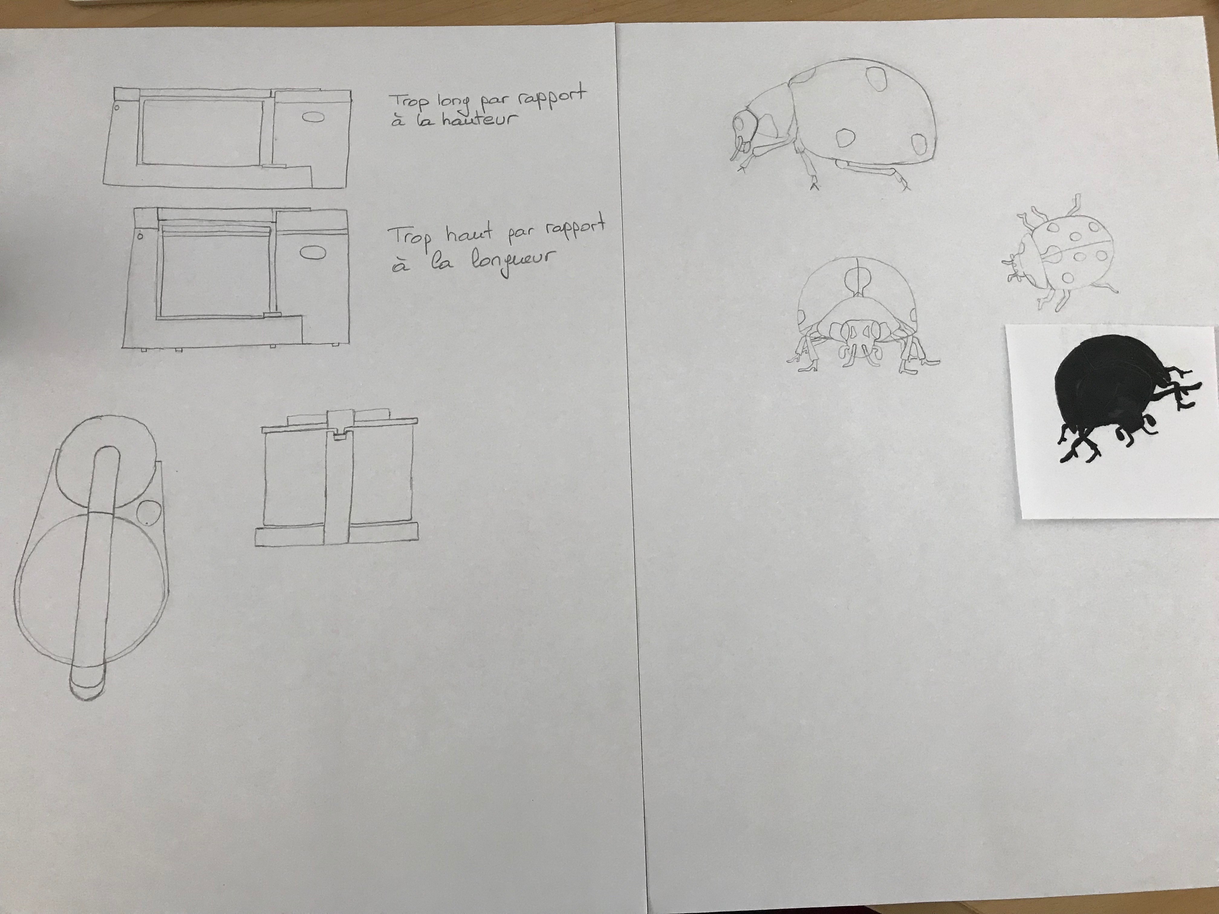Je suis une vraie débutante et j'ai bien galéré avec ces exercices ! Pour le robot ménager, j'ai beaucoup gommé mais je suis arrivée à ce résultat. A partir de la coccinelle par contre, je me suis retrouvée complètement bloquée. Je ne savais même pas par où commencer. La seule chose qui m'a débloquée a été de faire des silhouettes au feutre en amont. J'ai photographié 2 exemples mais j'en ai fait un paquet ! Merci pour ce conseil, même s'il me reste beaucoup de travail, je sais que je peux éviter d'être bloquée grâce à ce travail préparatoire. Je pense que pour moi, il sera obligatoire à chaque fois. Mon cerveau est noyé par les détails autrement mais ça me donne un peu plus confiance de savoir que je peux éviter la page blanche grâce à cette technique.