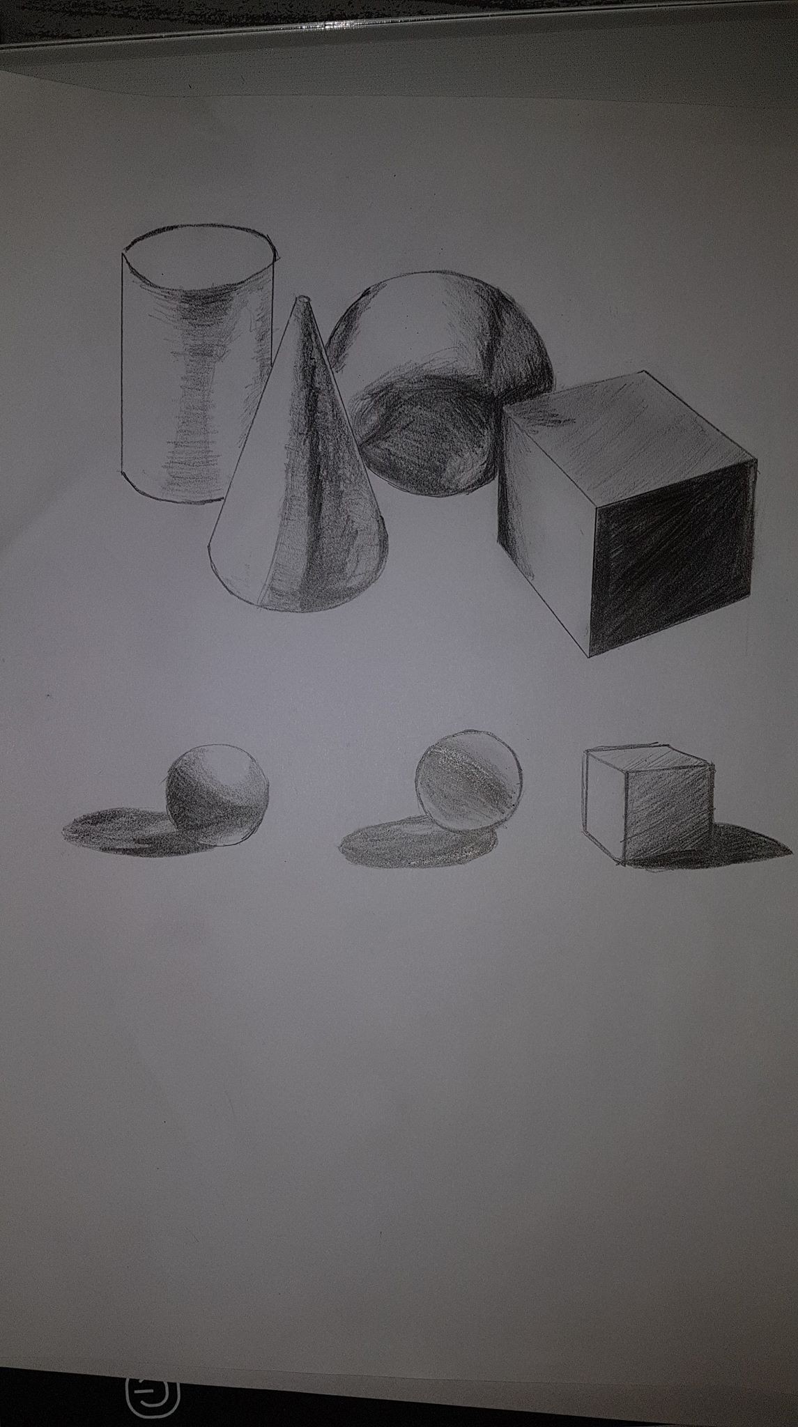 Tu as l'air d'avoir plus de facilité avec les cubes, le cône est pas mal aussi. Le cylindre, il y a de l'idée, mais ce n'est pas encore abouti (on dirait qu'il n'est pas terminé quand on compare ses valeurs à celle de ses voisins). Son ombrage devrait être similaire à celui du cône ^^
