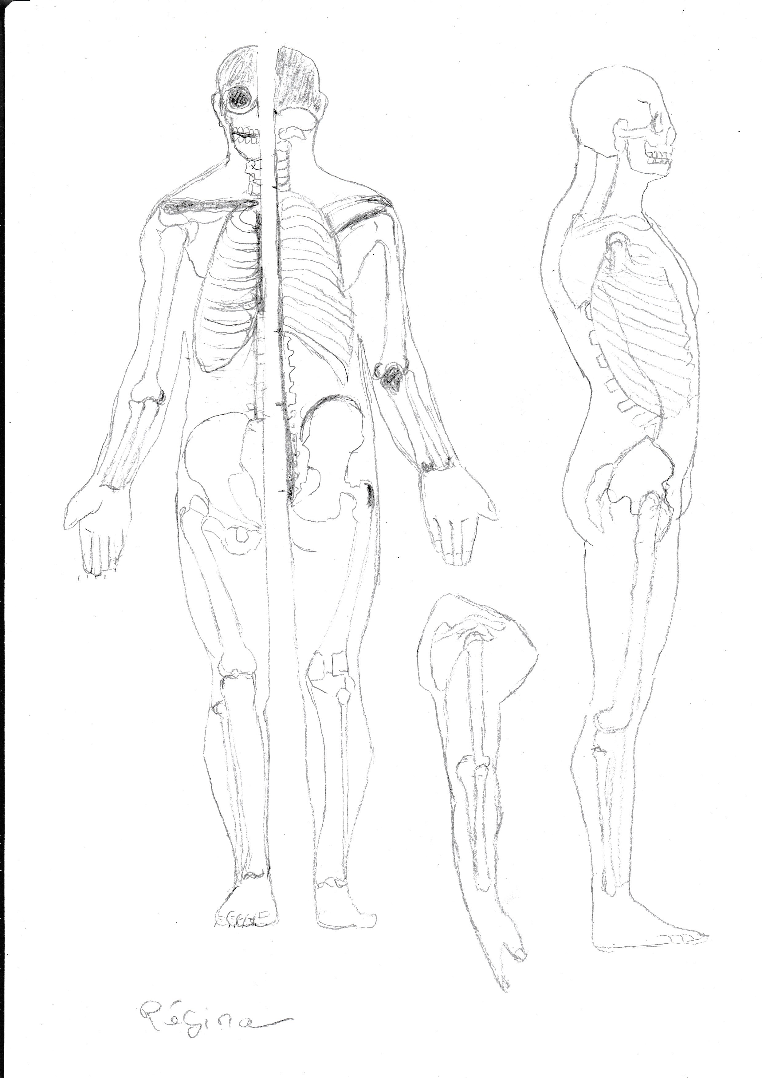 alors voilà j'ai quasiment honte de poster le squelette, j'ai toujours eu du mal avec je sais que les os sont trop courts ou trop long ou bien il en manque mais je reconnais que le cours est très intéressant, il permet de mieux visualiser les positions du corps notamment profil que je n'aurai pas pensé a faire courbé.