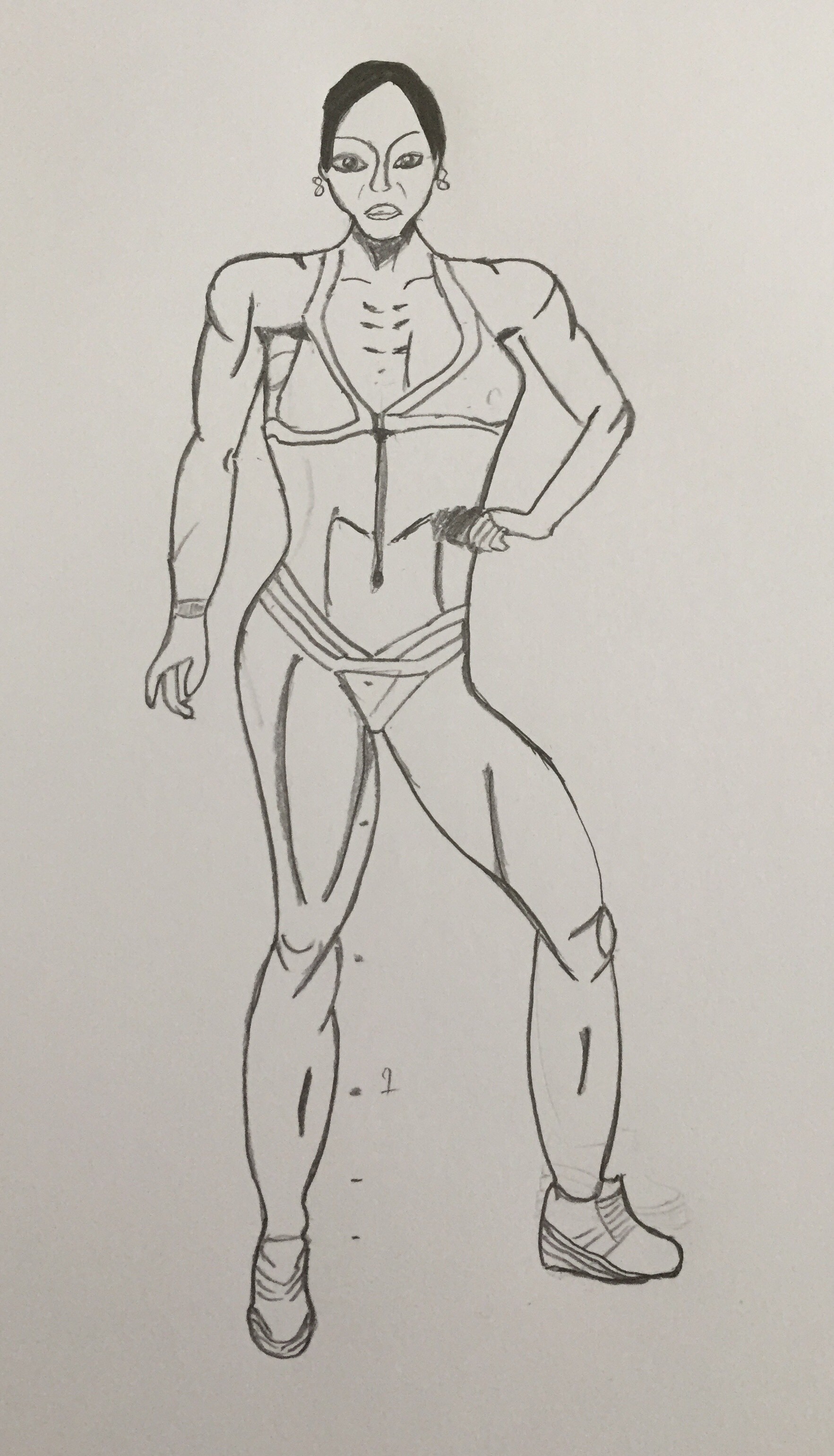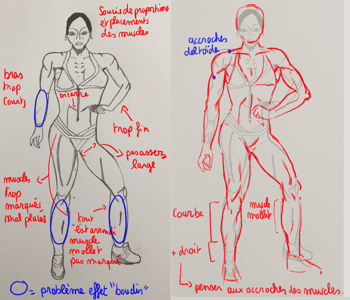 Une bodybuildeuse, pas facile facile ! A la fois c'est pratique car on voit tout, en même temps quand on débute il y a tellement d'infos que c'est plus compliqué de rester juste sur la forme globale. ça reste un bon exercice ^^ On voit que tu as bien réfléchis, mais il y a des soucis de placement. Il y a aussi quelques soucis de proportions. Avant de vouloir faire plein de traces de muscles pas forcément bien placés à l'intérieur, pense à la silhouette et au placement des accroches. Il y a a par endroits des soucis d'effet "boudin" où tout est rond sans que ça devienne plus plat au niveau des accroches. Je t'ai fait un croquis annoté avec plein d'éléments, n'hésite pas à me dire si tu n'arrives pas à lire ^^ J'espère que tu comprendras mieux ! En tous cas c'est bien, avec un peu plus de construction et à force d'observer tu t'amélioreras :)