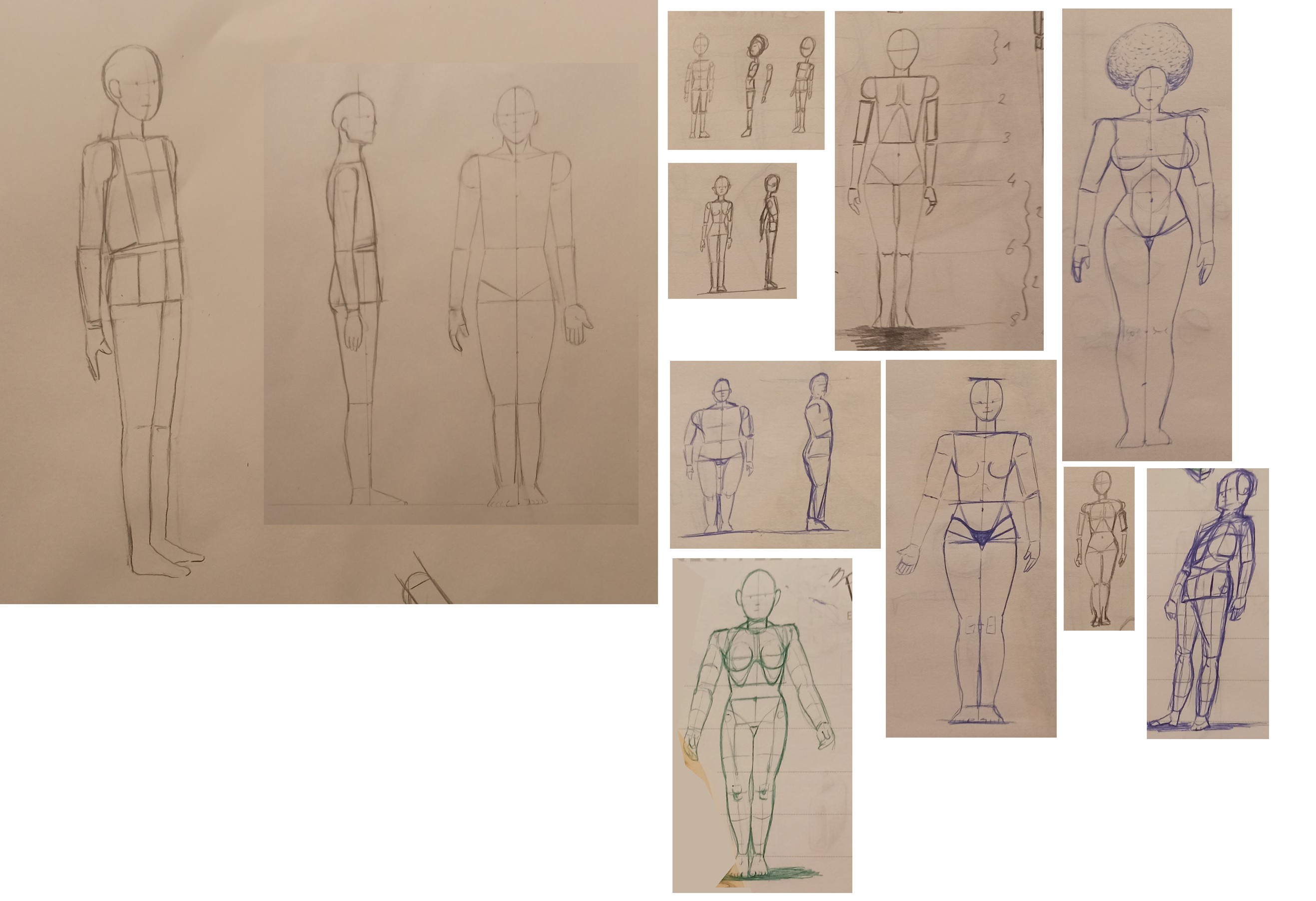 Pour ce cours j'ai essayé de représenter des canons standards et à coté des modèles soit plus petits soit plus grands. J'ai remarqué que j'ai tendance à rallonger et surélever l'épaule de droite, si vous avez des conseils pour éviter ça je suis preneur ^^.