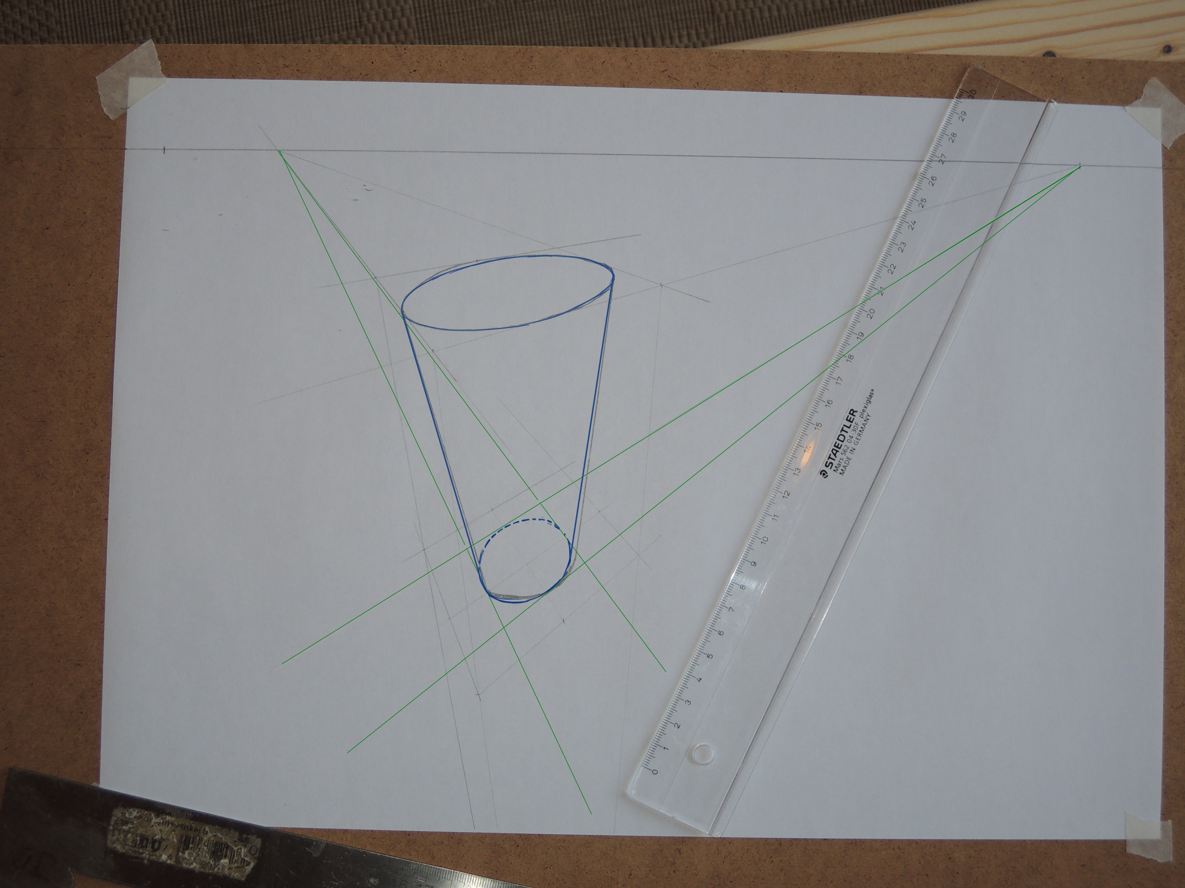 J'ai récupéré un morceau de panneau plus grand qu'un A3 afin de pouvoir positionner librement mes points de fuites, en particulier le 3ème, loin en dehors de la feuille pour ne pas trop écraser la perspective.