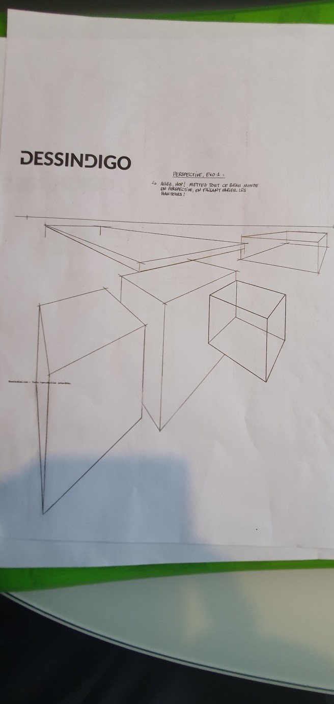 J'ai pris le temps d'approfondir un peu le cours sur la perspective (avec quelques cours glanés sur internet) et voila ce que ça donne : pavillon en L avec un toiture simple. par souci d'efficacité, j'ai fais le dessin avec mon logiciel de dessin technique.