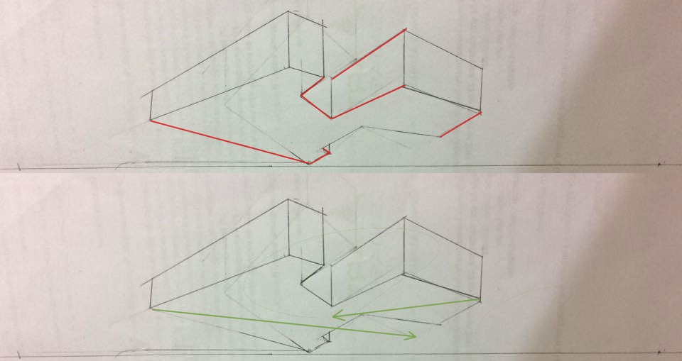 Les traits rouges sont ceux qui sont faux : ils ne se dirigent pas vers leurs points de fuite respectifs. En vert, en dessous, quelques indices du changement que cela provoquerait ! 😉