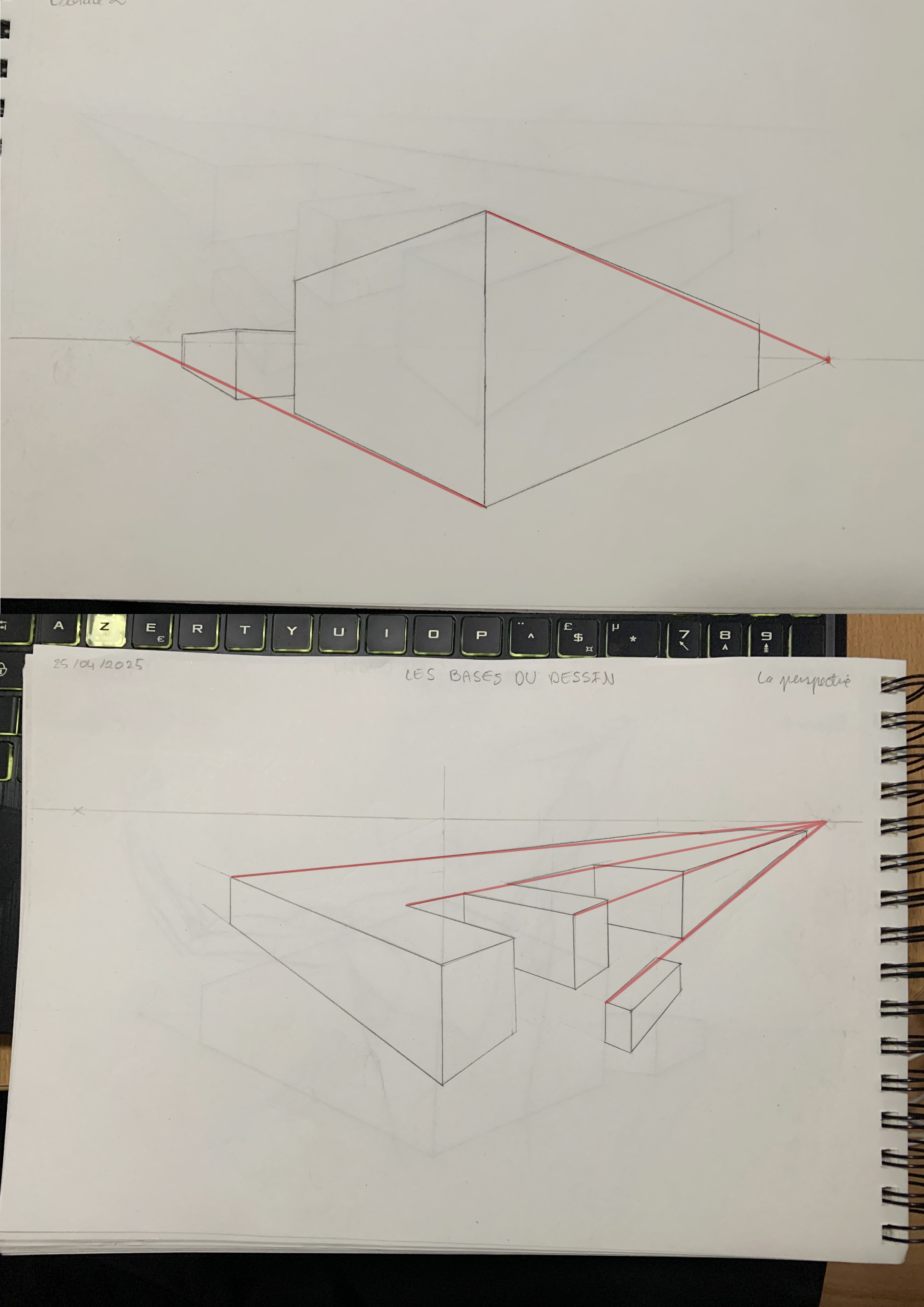 Tu as bien fait de tester cet exercice avec d'autres forme, d'autant que c'est très réussit, il y a juste quelques petit manques de précisions par endroit, mais c'est minime. En ce qui concerne les triangle en perspective, tu t'en es très bien sortit ! :) mais si un jour tu sens que ça coince ou que tu n’es pas sûr de ton volume, pense à revenir à une forme simple comme le cube. Une fois que ton cube est bien posé dans la perspective, tu peux t’en servir comme "échafaudage" : il te guidera pour construire à l’intérieur, autour ou même à partir de lui, les formes plus complexes que tu veux dessiner, comme un triangle ou un prisme, avec les bonnes proportions et dans le bon angle. C’est une astuce classique mais très efficace !