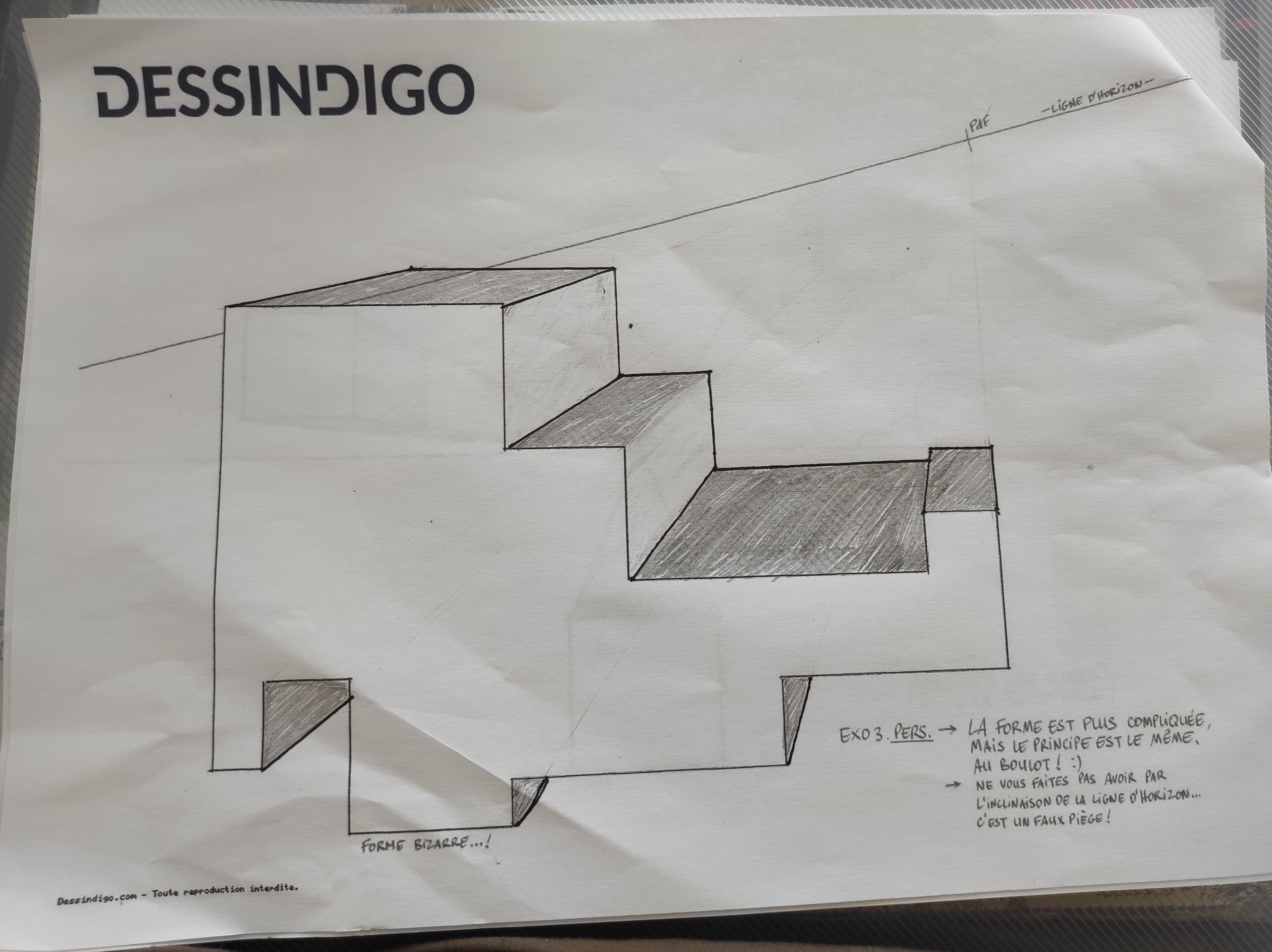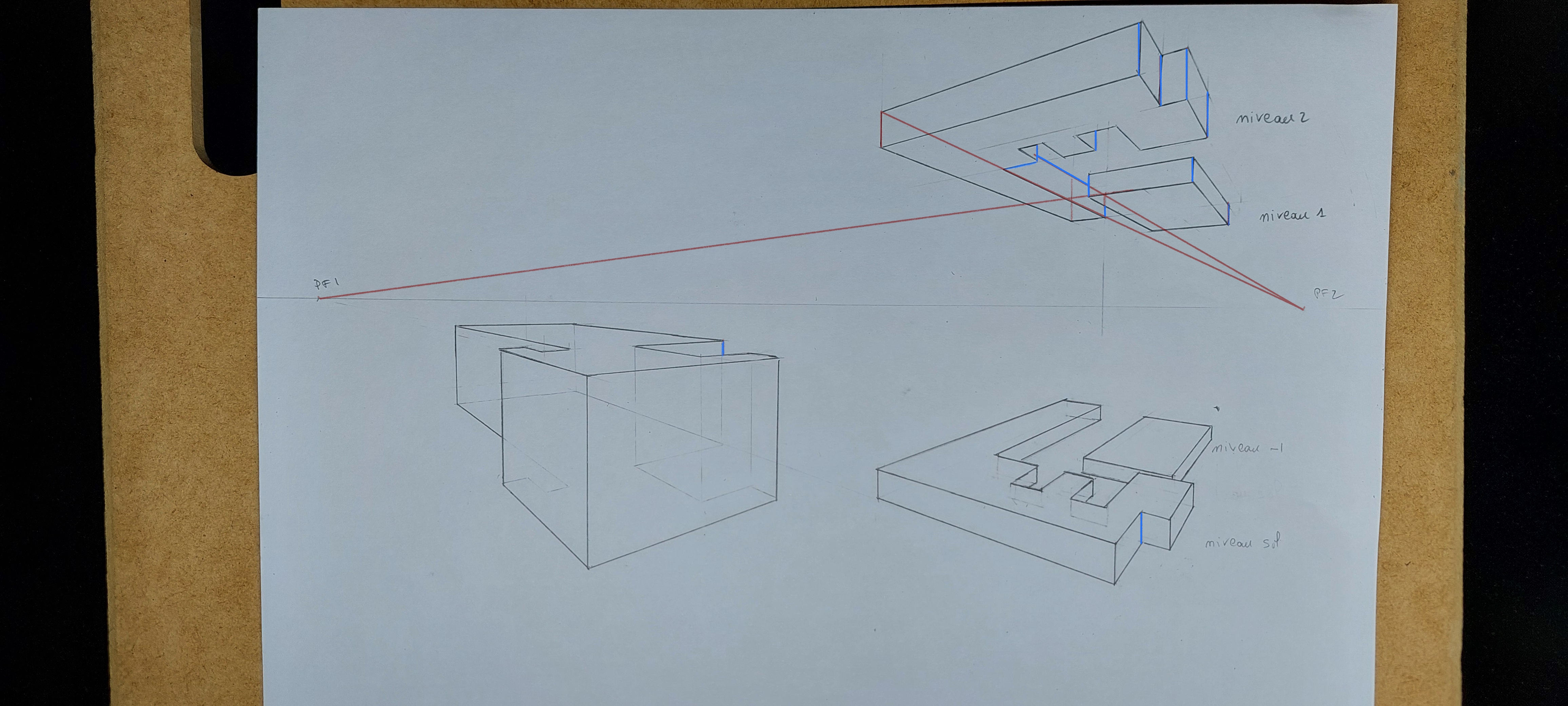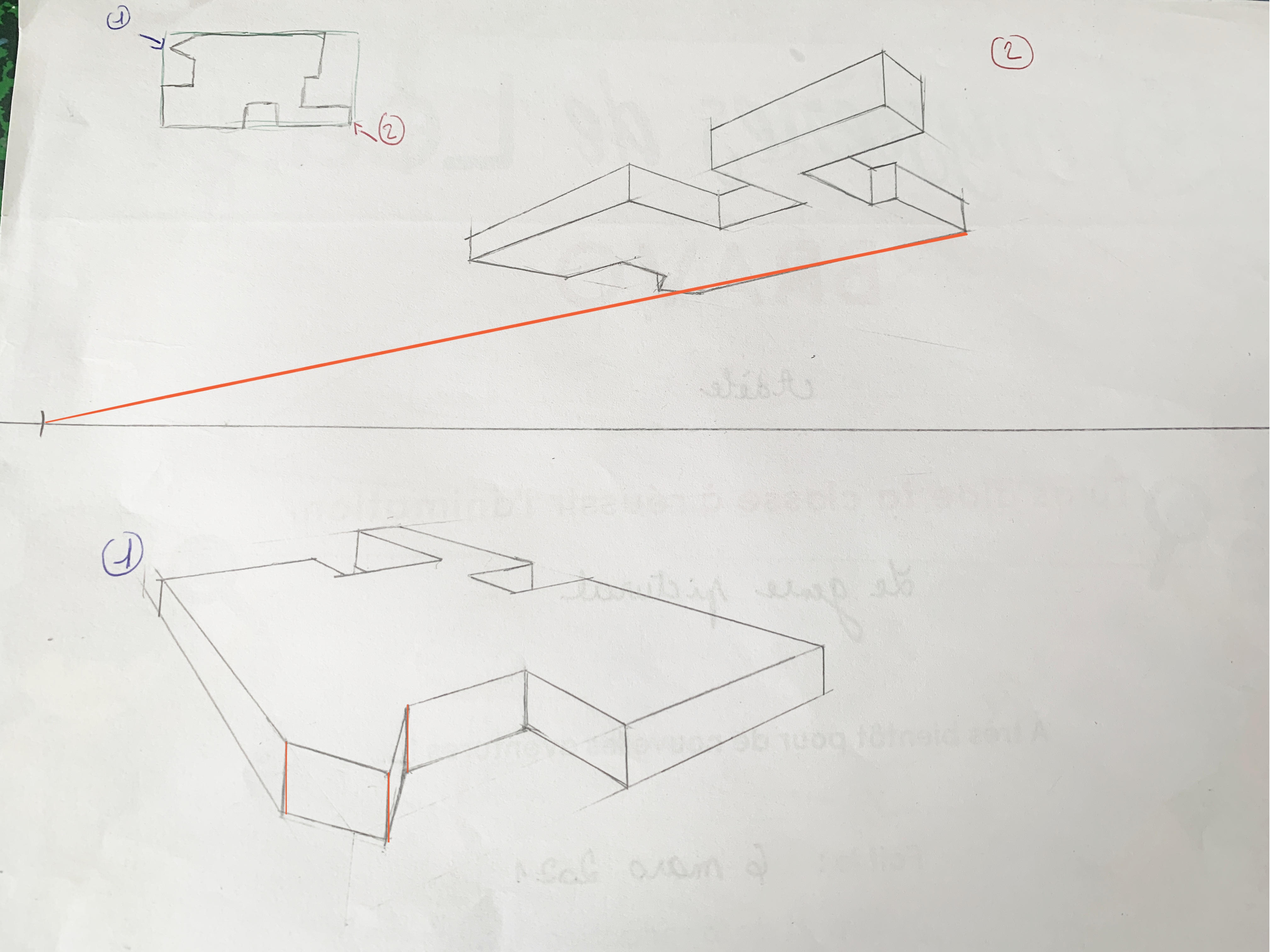 j'ai fait les formes de l'exercice sous différents points de vue avec 2 points de fuites ( ça été).Je me suis donc entraîné avec d'autres formes que j'ai inventé. Cependant j'ai eu un problème je ne sais pas comment représenter les formes triangulaires de manière à ce qu'elles respectent les lignes de fuites (désolé je n'arrive pas à le dire d'une façon très claire). Je vous envoie la forme sur laquelle j'ai eu des difficultés.