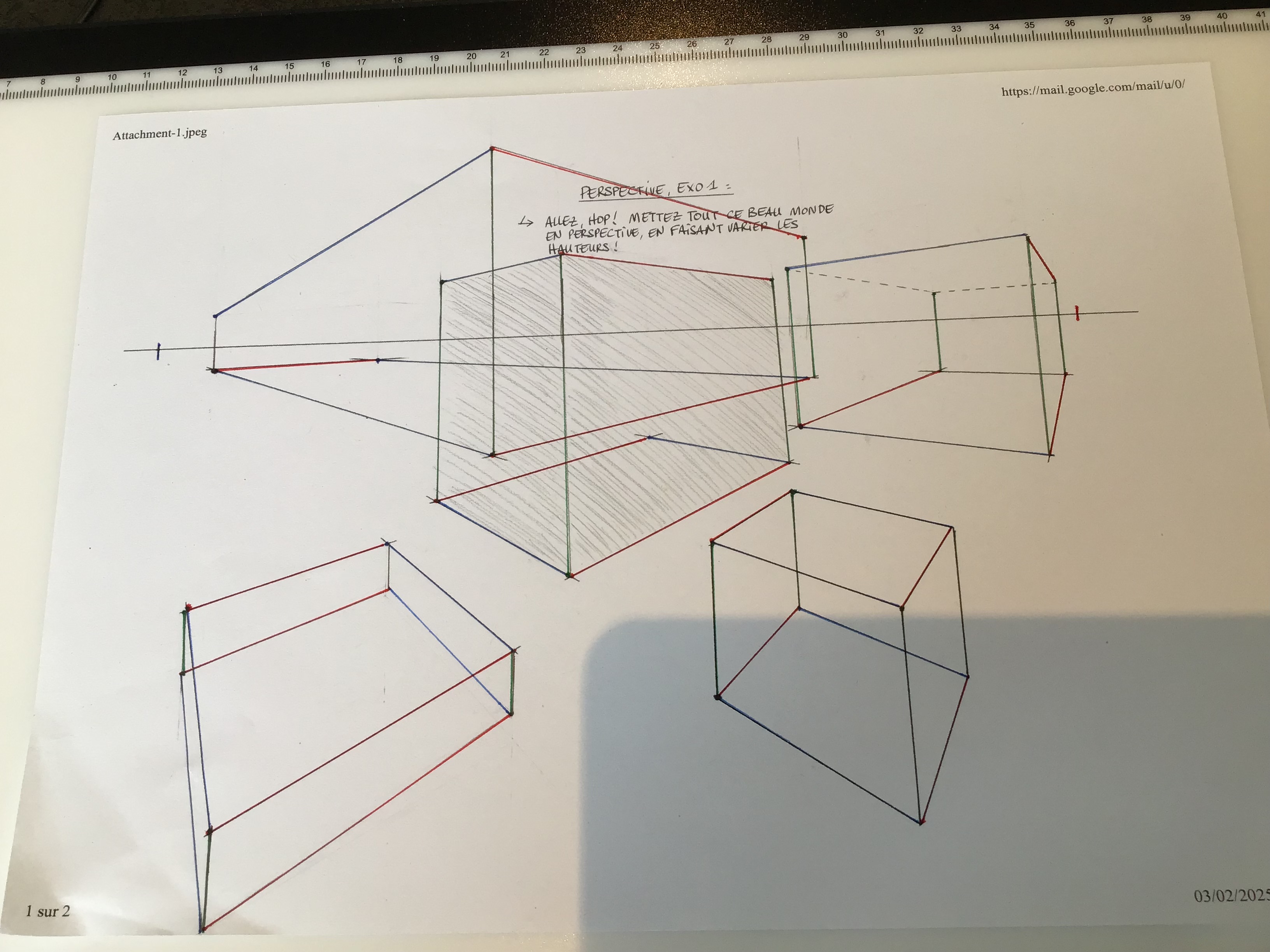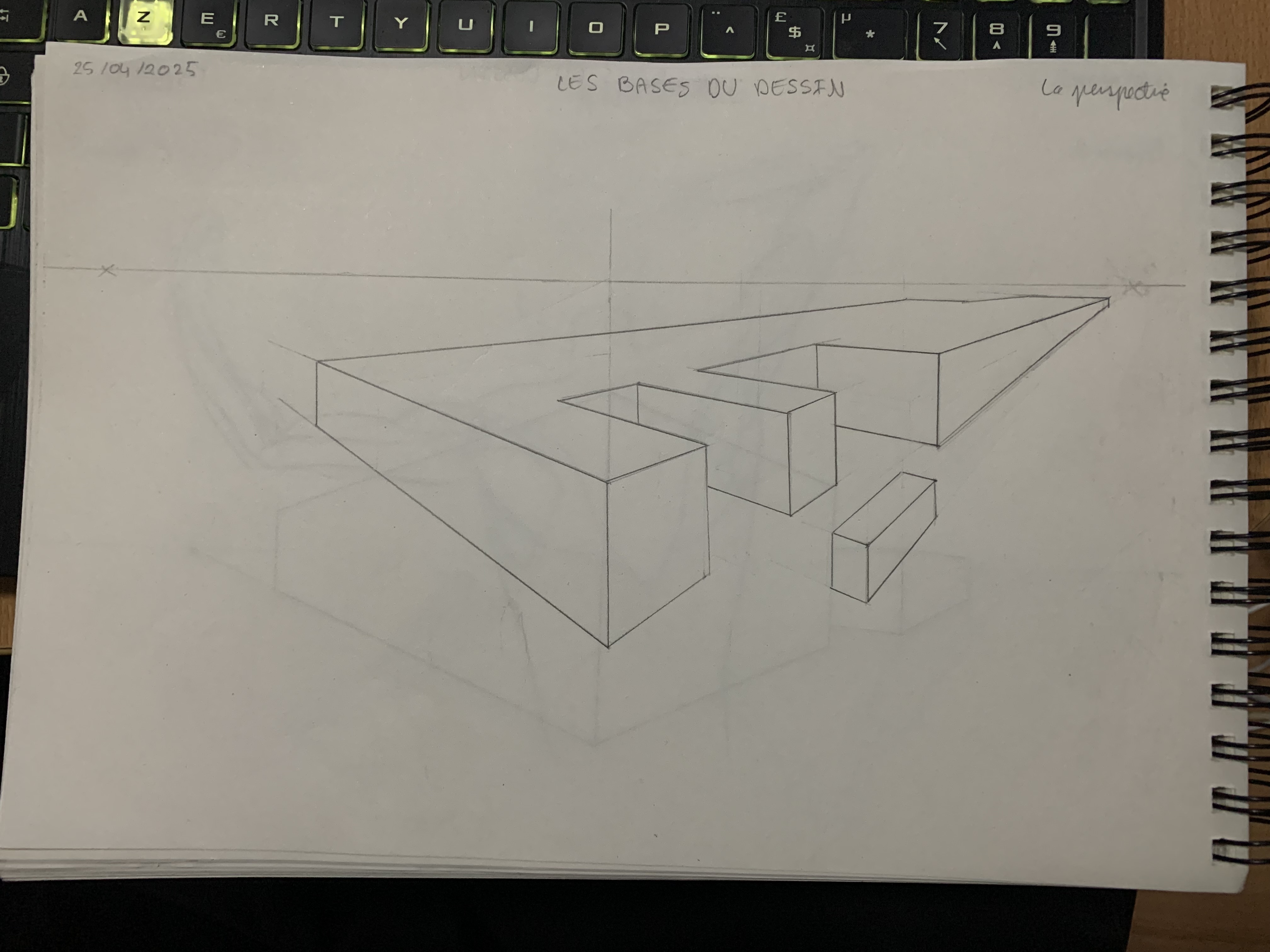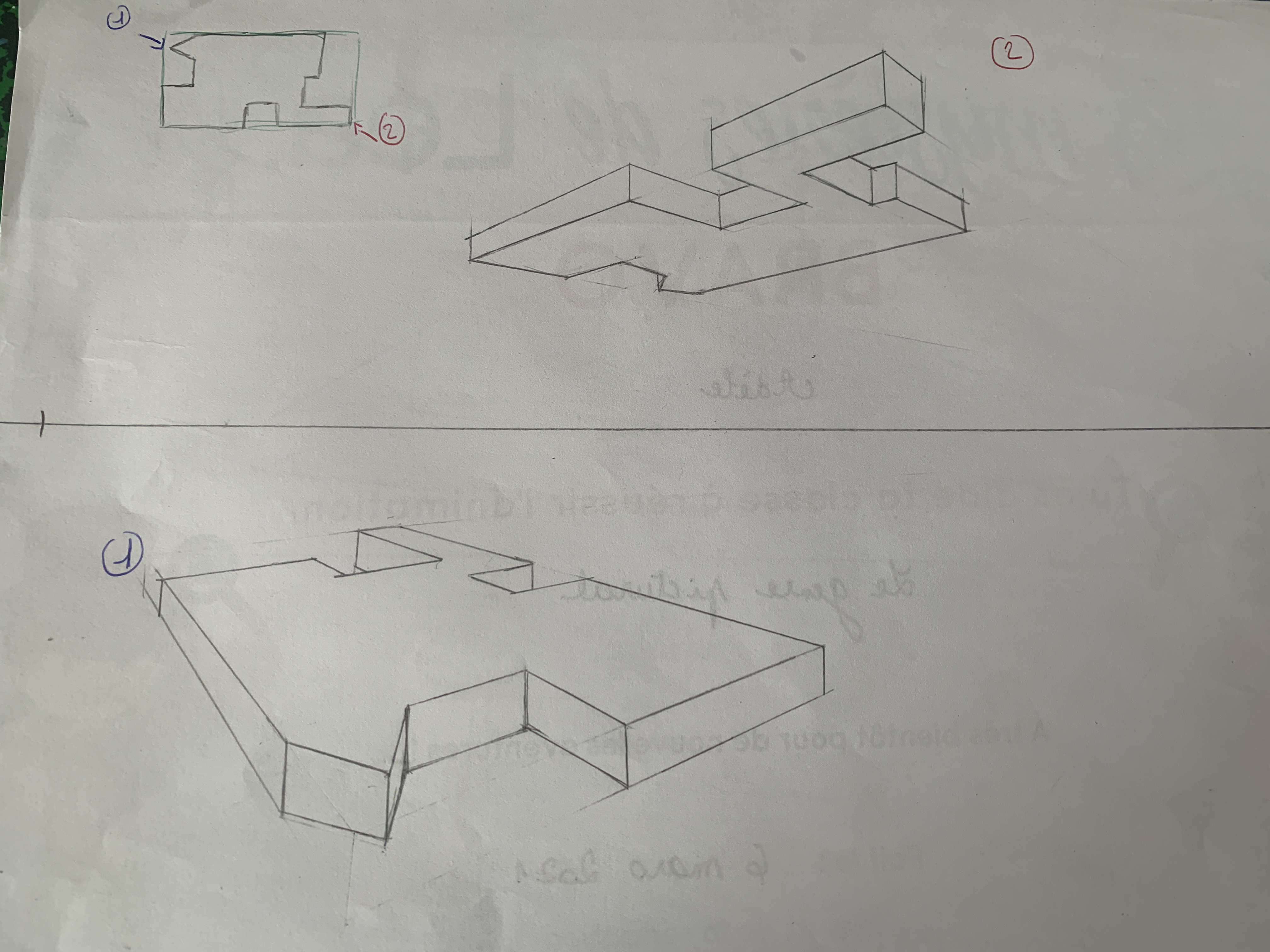 j'ai fait les formes de l'exercice sous différents points de vue avec 2 points de fuites ( ça été).Je me suis donc entraîné avec d'autres formes que j'ai inventé. Cependant j'ai eu un problème je ne sais pas comment représenter les formes triangulaires de manière à ce qu'elles respectent les lignes de fuites (désolé je n'arrive pas à le dire d'une façon très claire). Je vous envoie la forme sur laquelle j'ai eu des difficultés.