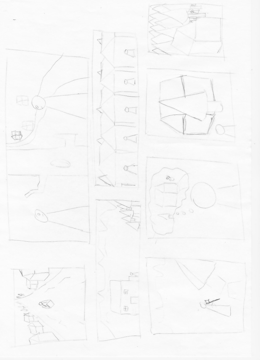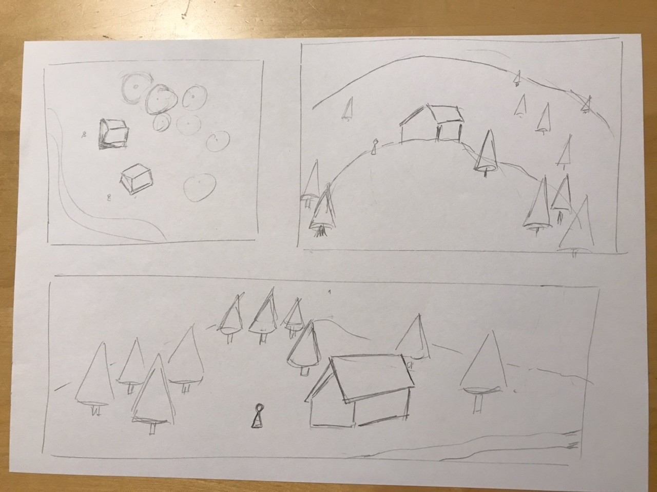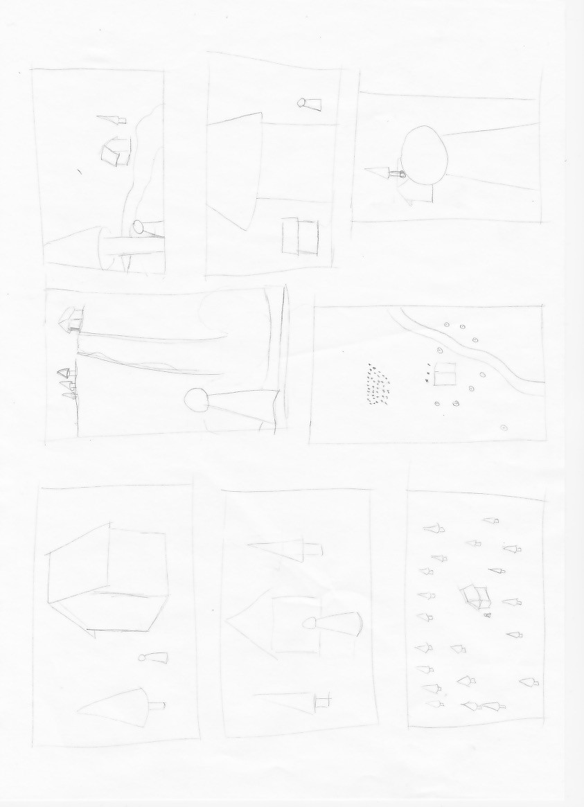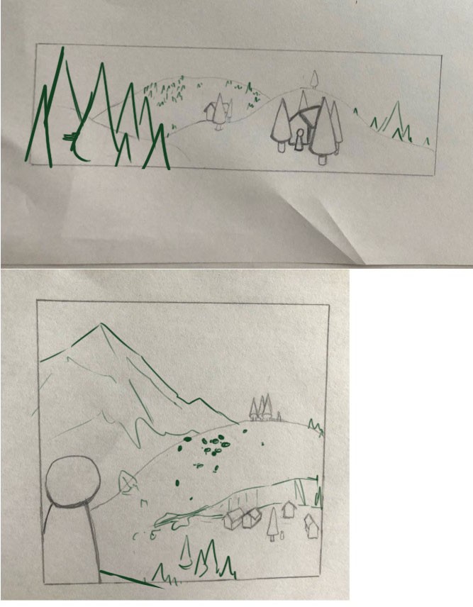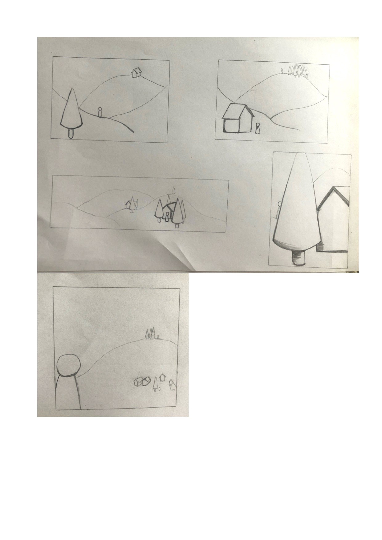 Du coup, je te propose de retenter, en remplissant davantage tes images. Car comme tu le vois, une fois qu'on remplit tout ce vide, ça fonctionne hyper bien en vrai. C'est juste ultra minimaliste actuellement. Attention à ne pas trop coller les éléments importants sur les bords aussi et attention à la perspective (sur la vignette 3 je n'ai pas touché la perspective des maisons, mais j'ai justifié le changement par le fait qu'on ait creusé la colline pour avoir un sol plus plat).