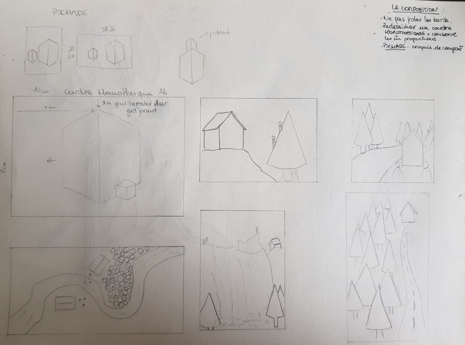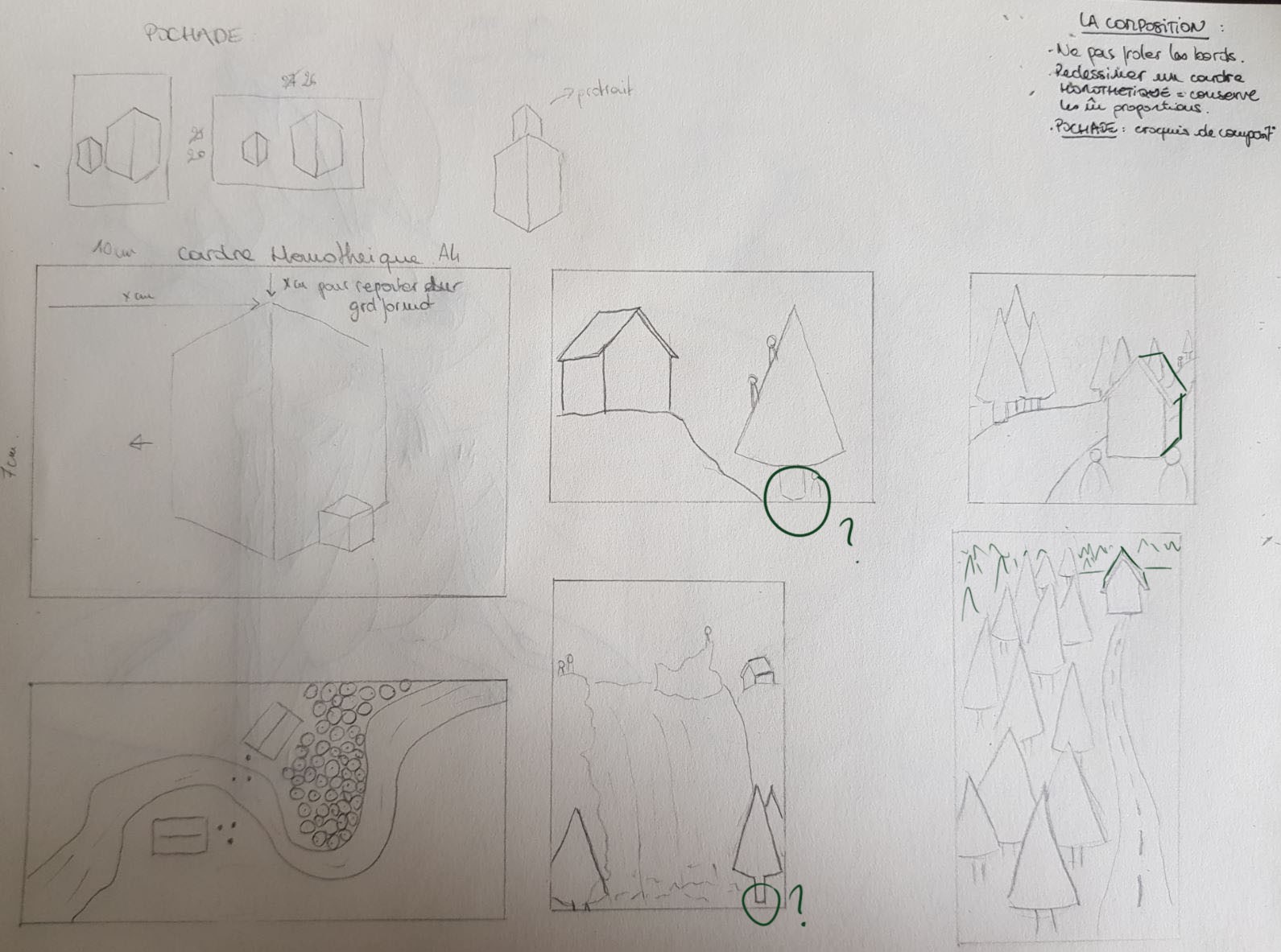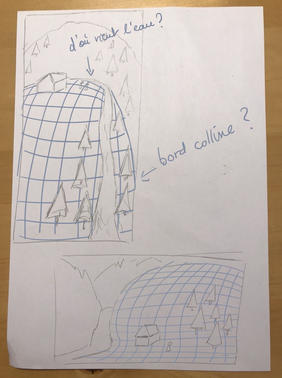 C'est pas mal tout ça :D Attention à bien comprendre comment se pose le sol pour placer correctement les éléments dessus. Par exemple, ta deuxième vignette de la première page : ta maison est placée plus haut que le niveau du sol (si je me réfère au niveau de l'eau), et selon une perspective comme si elle était sur un sol plat. Mais on voit clairement une colline (voire même une falaise non pour une chute d'eau ?), et les arbres dessus ont l'air d'être vus frontalement et disposés de manière très régulières sans changement particulier d'échelle. Je t'ai fait un très mche damier suivant a priori le volume de ton sol pour te mettre en lumière le problème ^^
