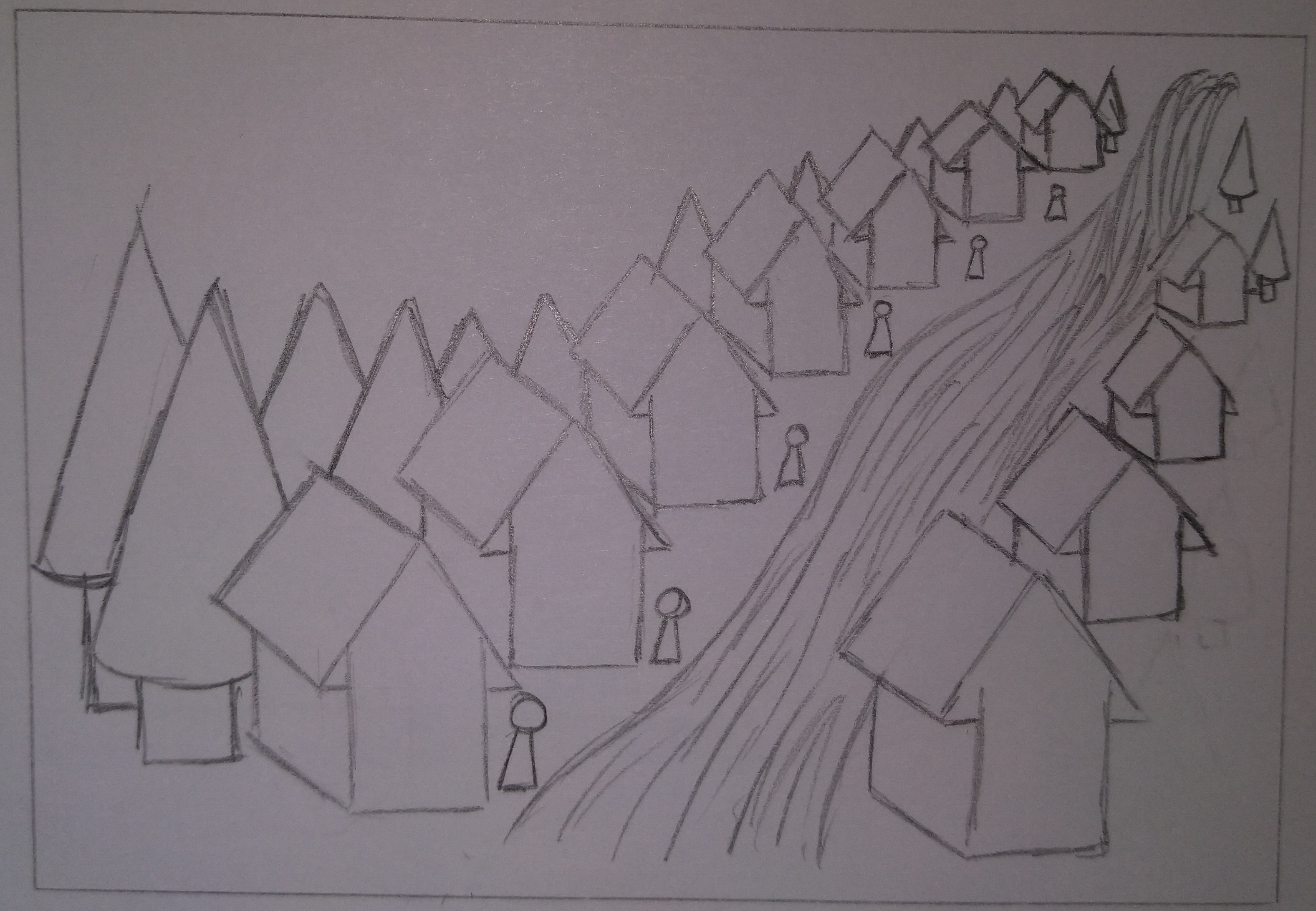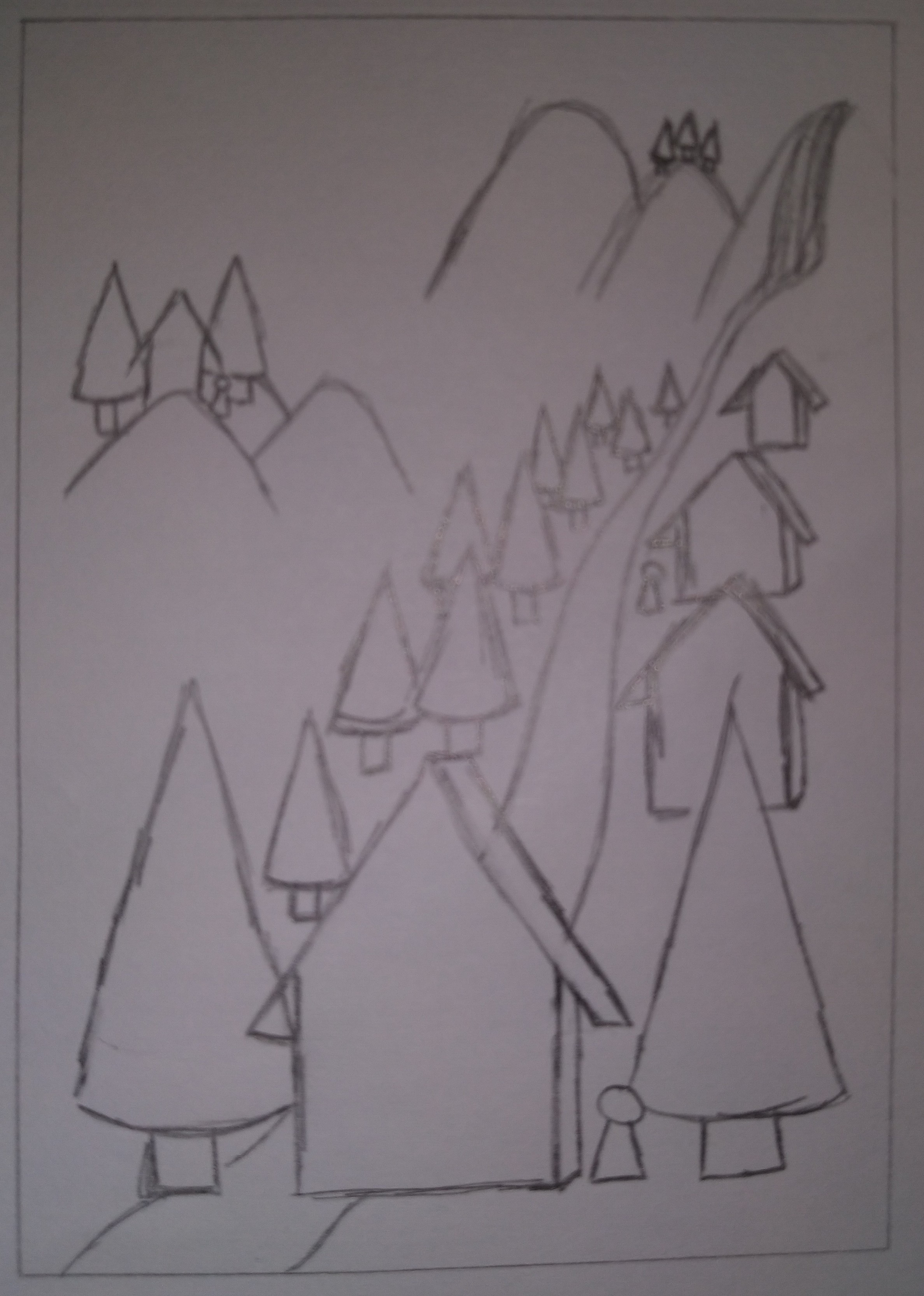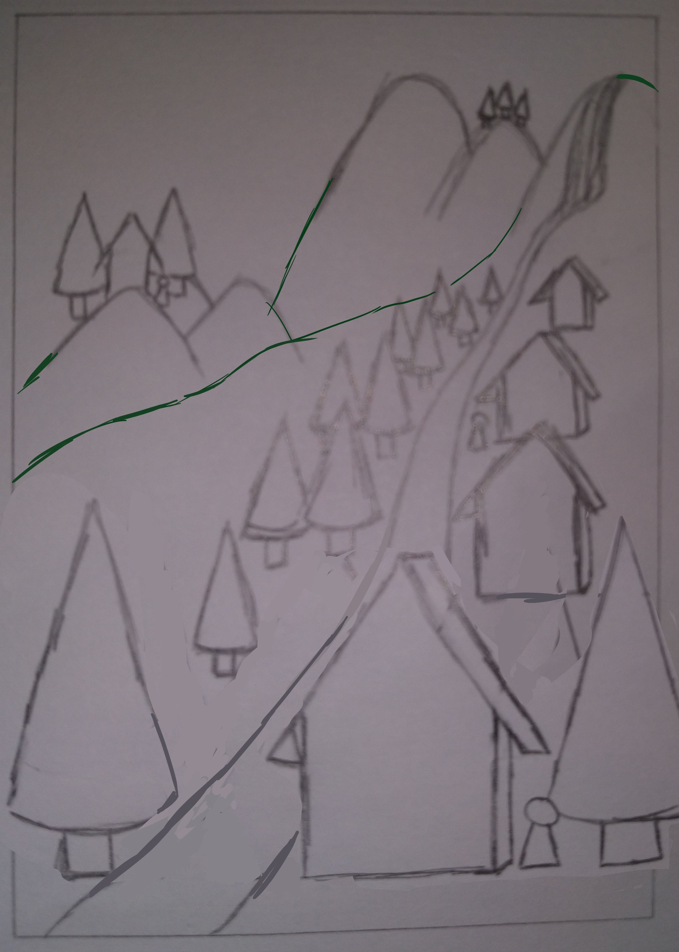 Je vais juste pointer le manque de contexte sur la première pochade (je te joins une correction) et le fait que la maison et l'arbre au premier plan empiètent totalement sur la route, ce qui n'est pas très logique. Idem il manque un peu de contexte (d'environnement si tu préfères), autour de ta scène. On a tous les éléments accumulés à un endroit et un grande vide en haut à gauche.